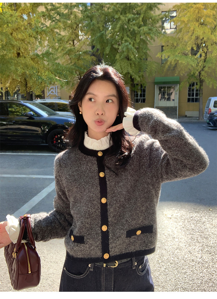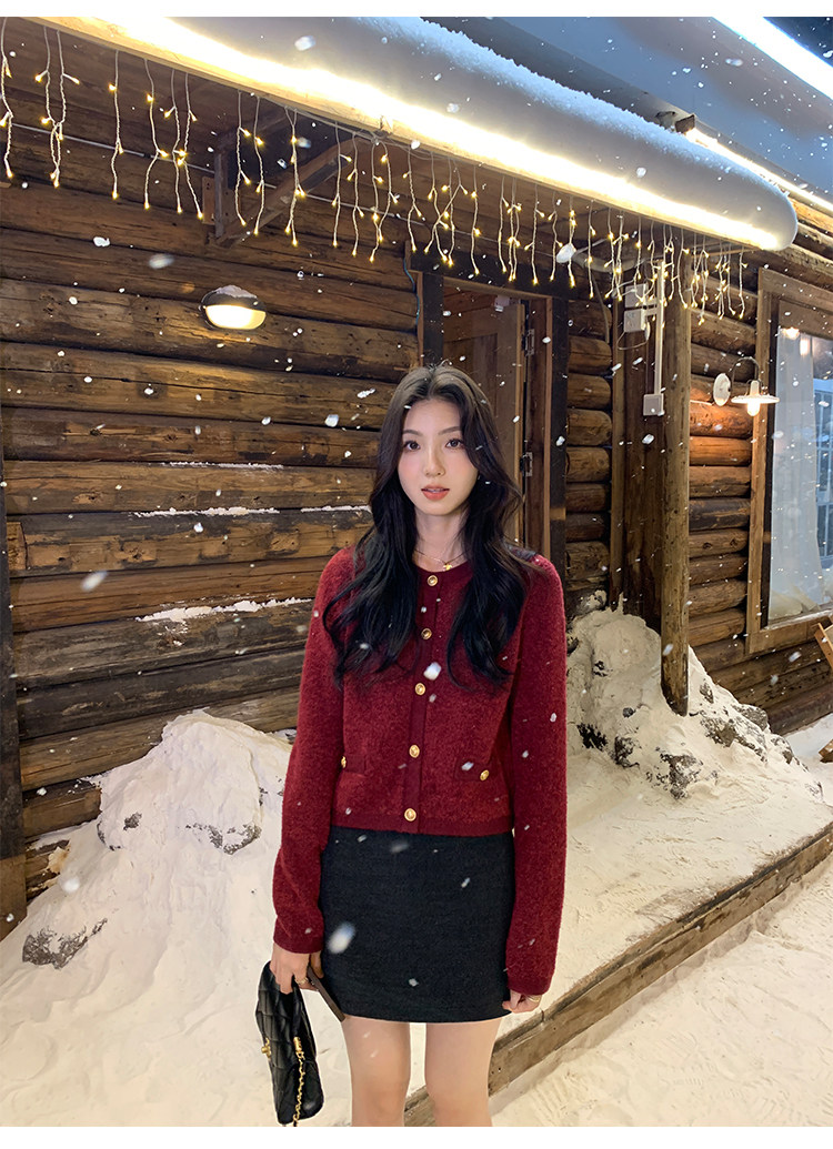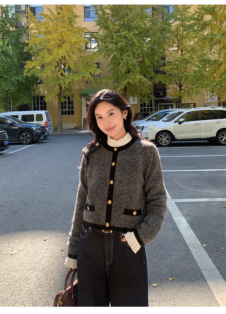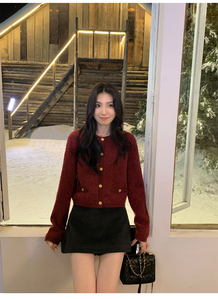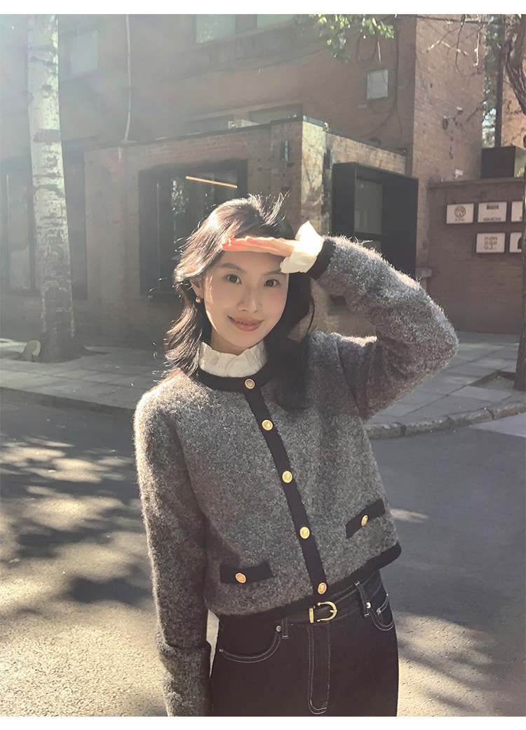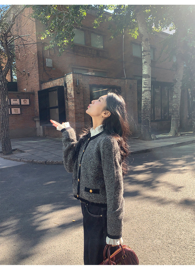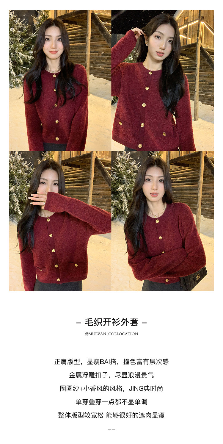 Mulvan Short Tweed-Style Sweater Jacket for Women, Autumn and Winter, Regular Shoulder, Slimming Design, Wool Knit Cardigan Top