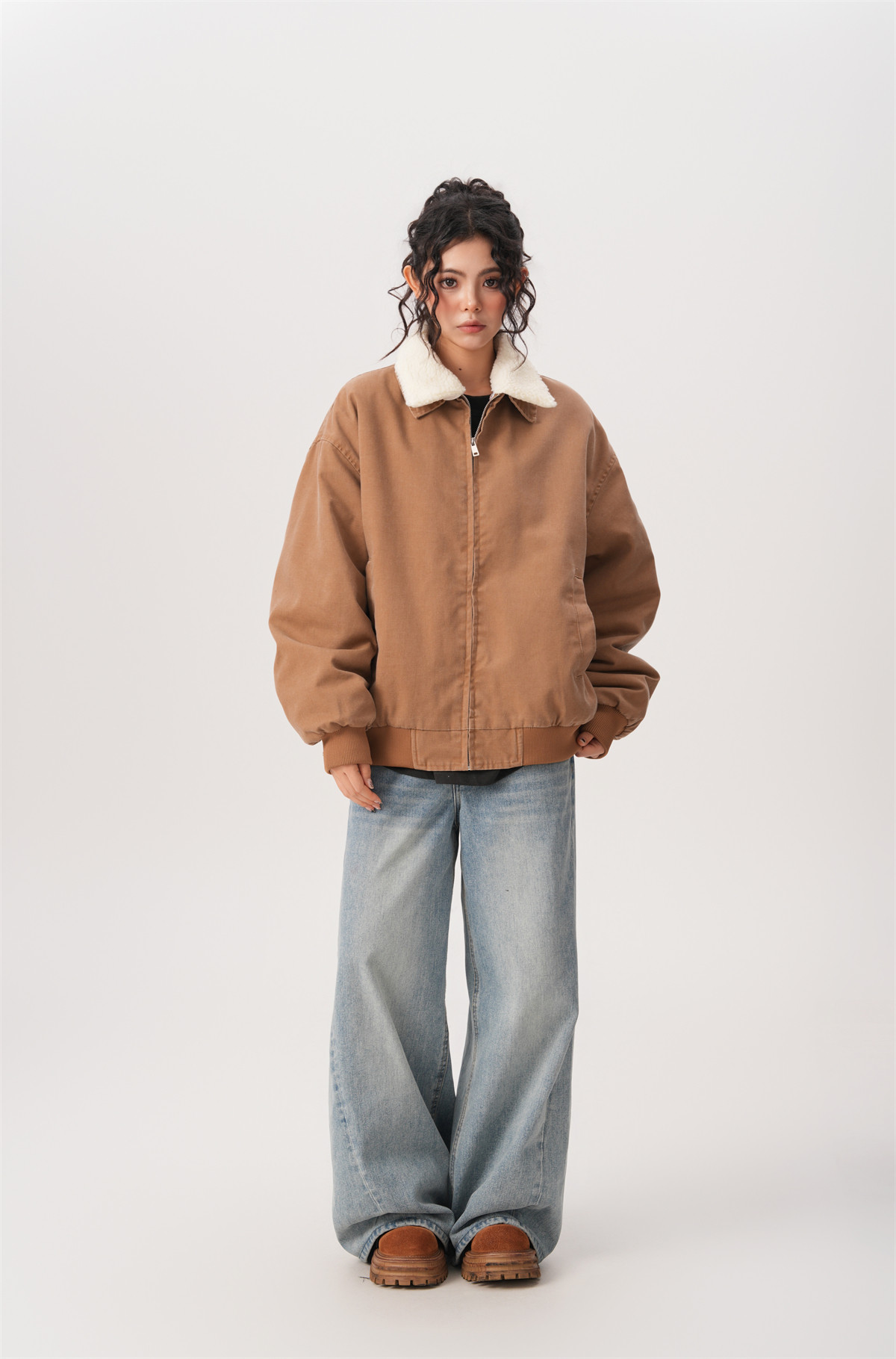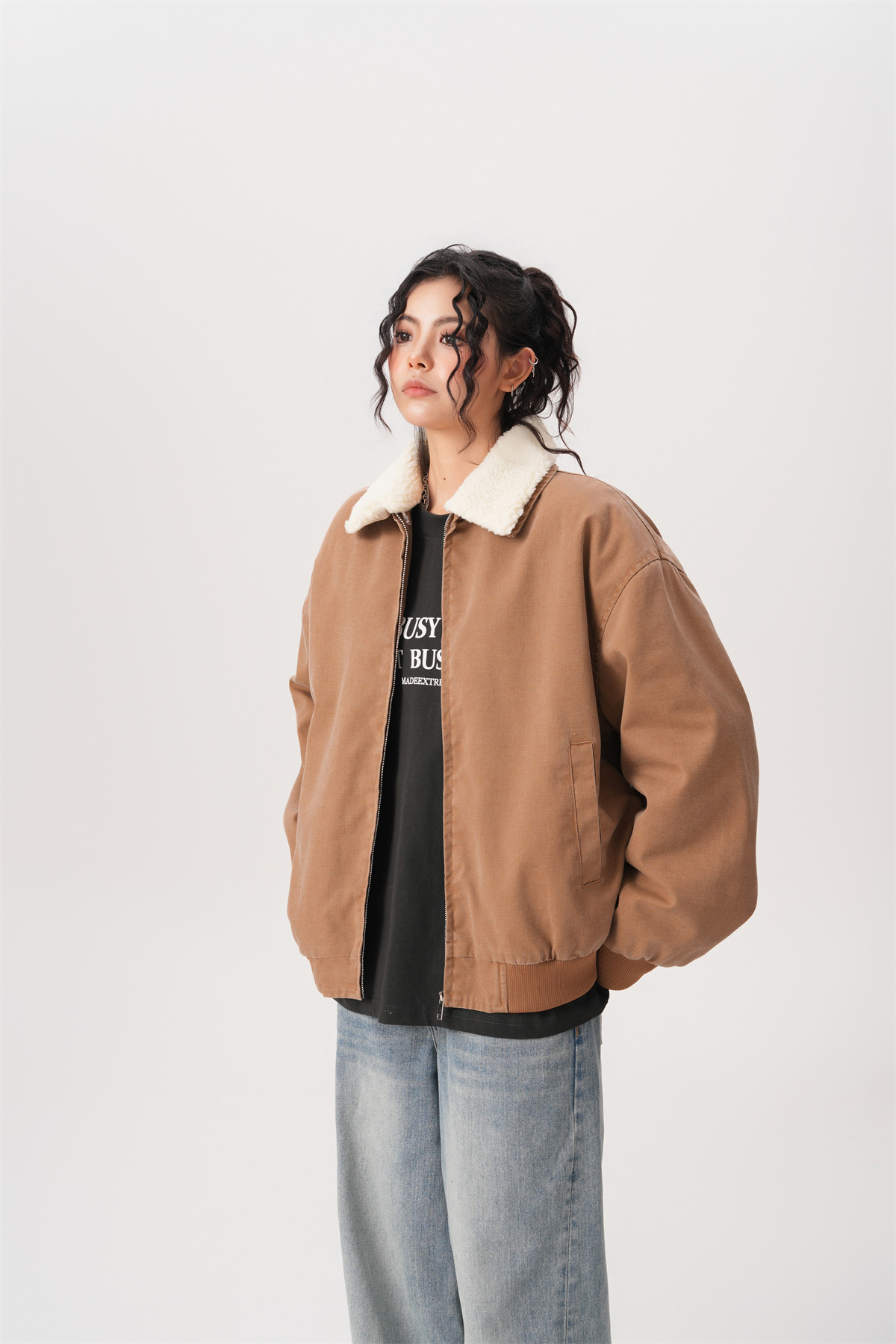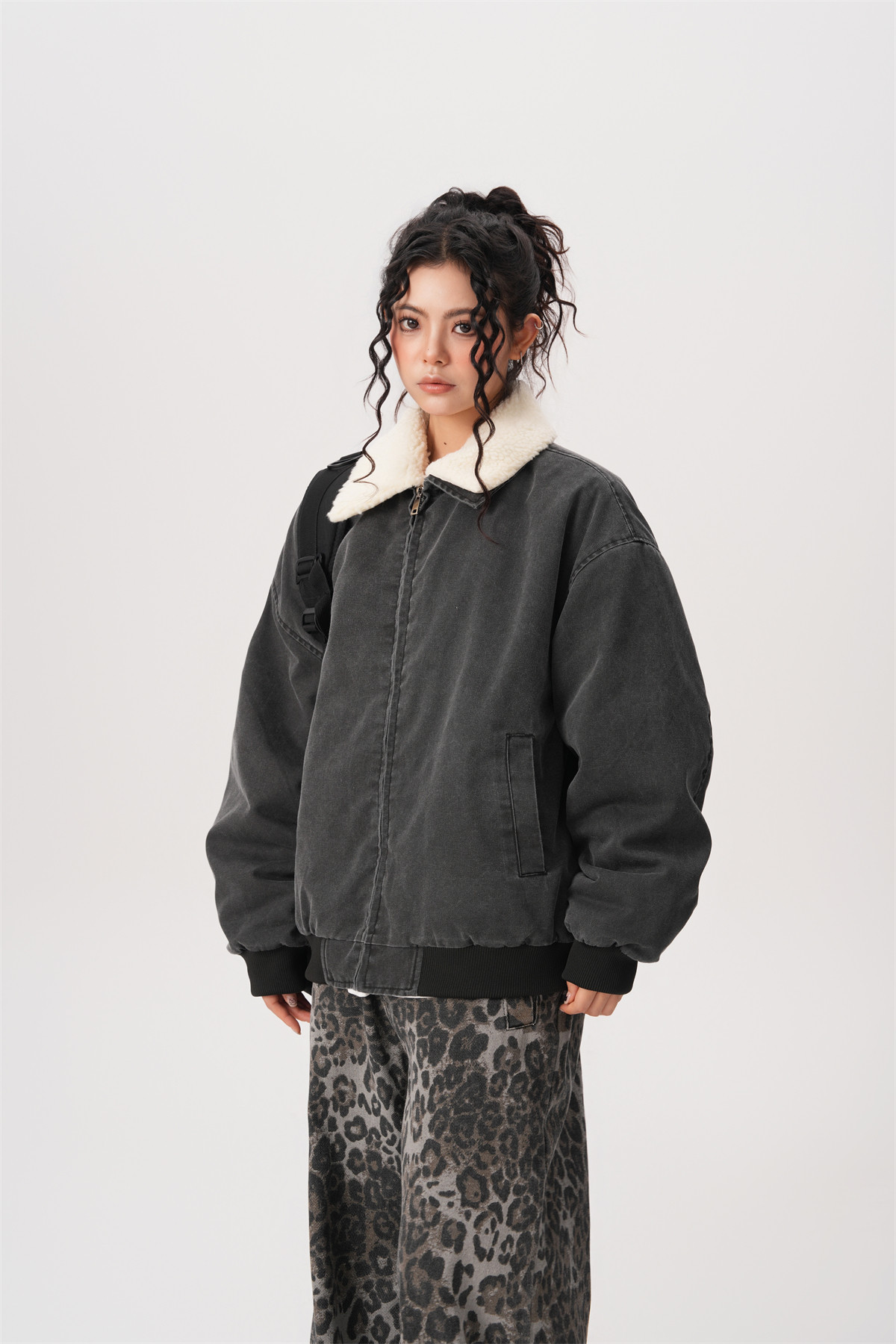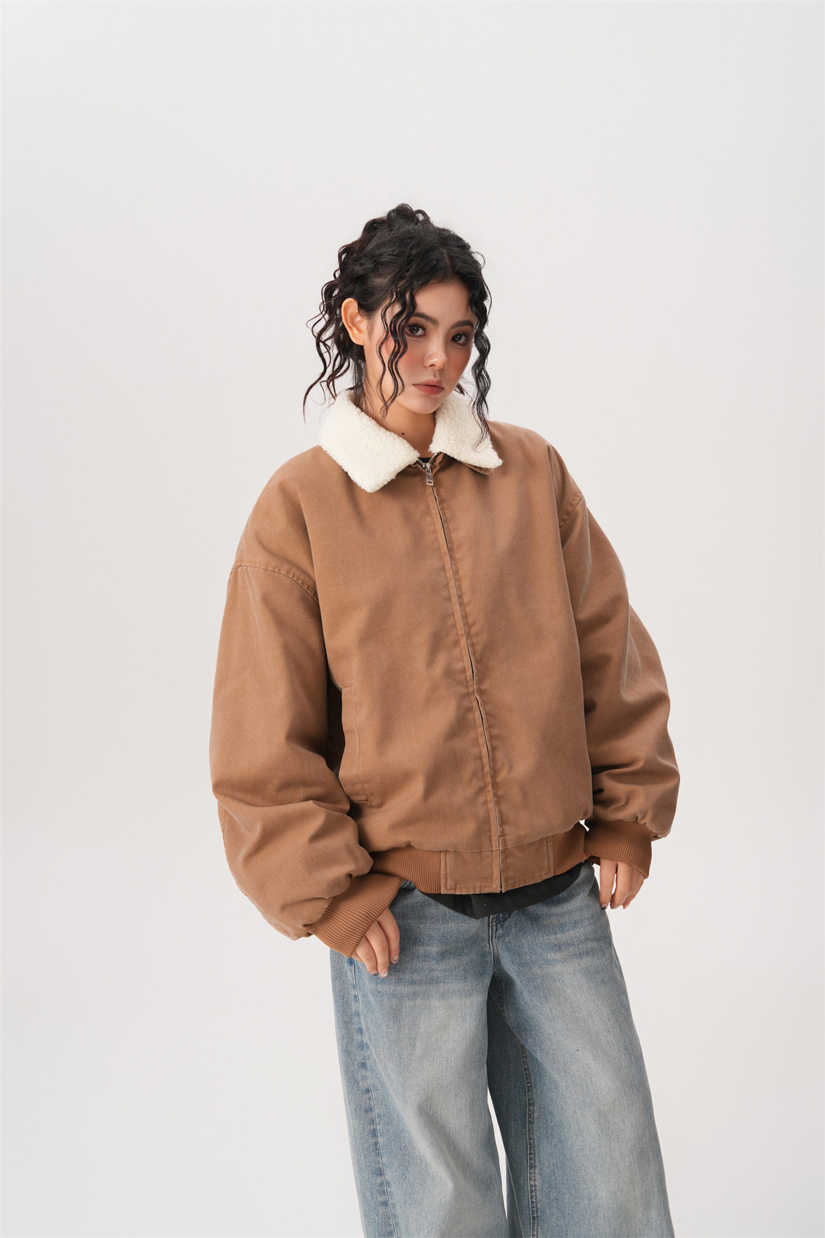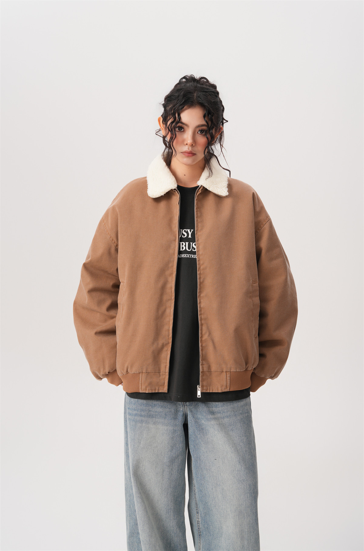 Bwka American Retro Lamb Wool Lapel Jacket for Women and Men, Winter Trendy Brand, Fleece-Lined, Warm Detroit Workwear Cotton Jacket