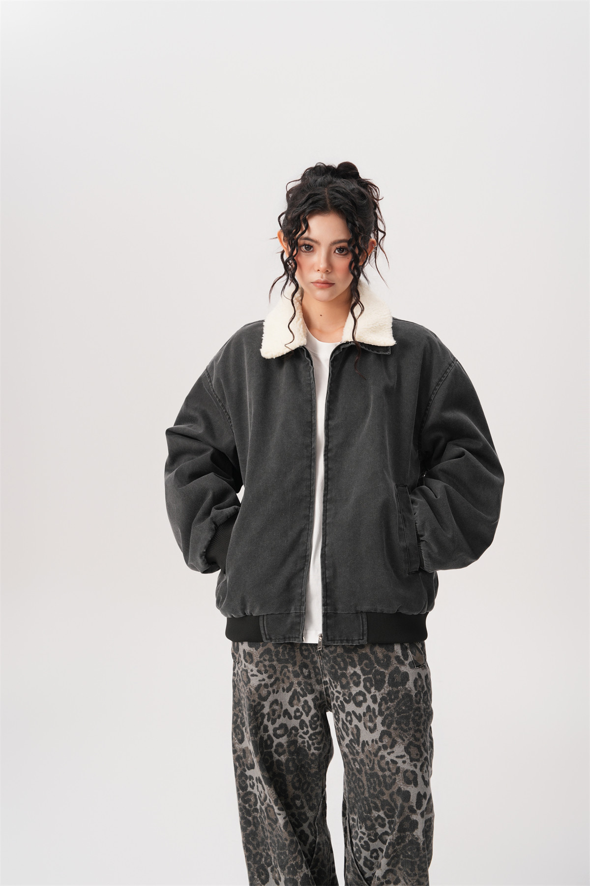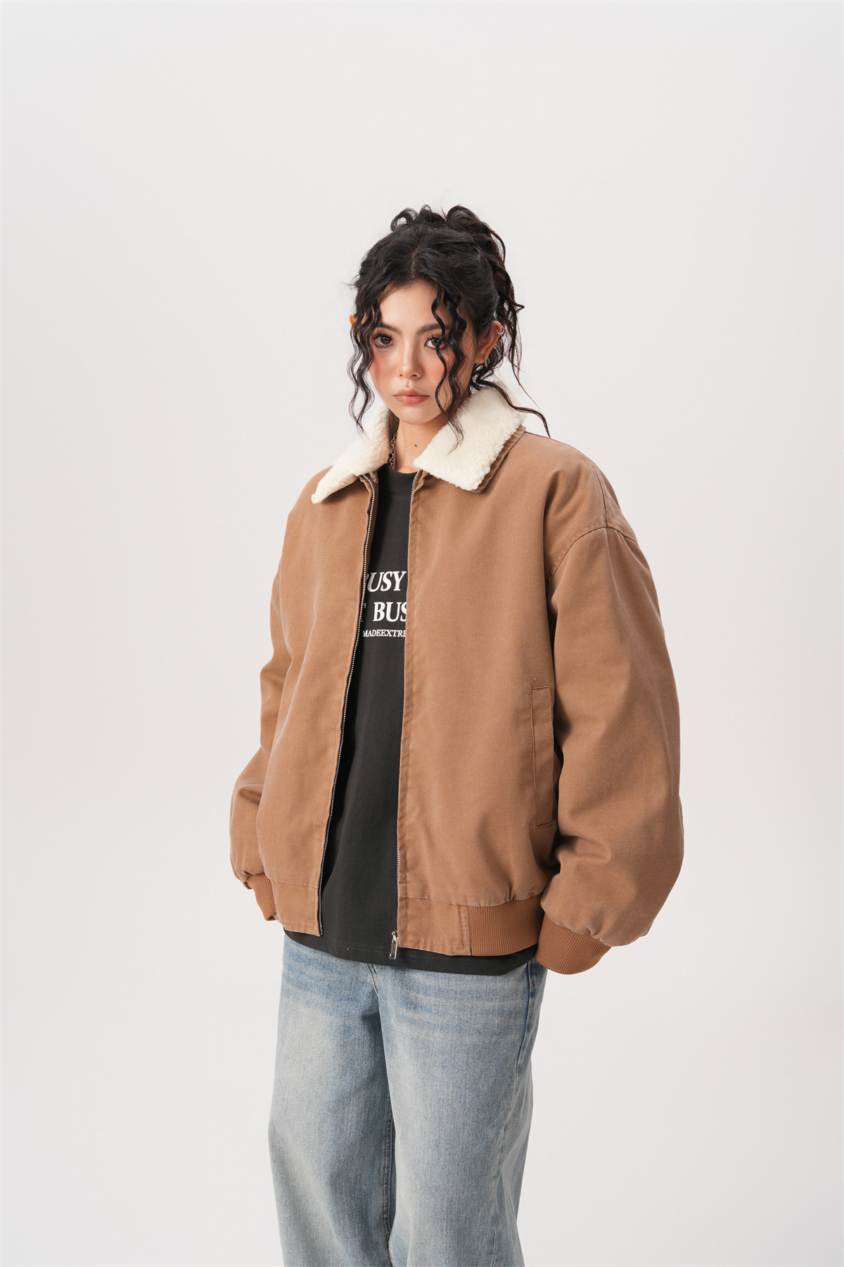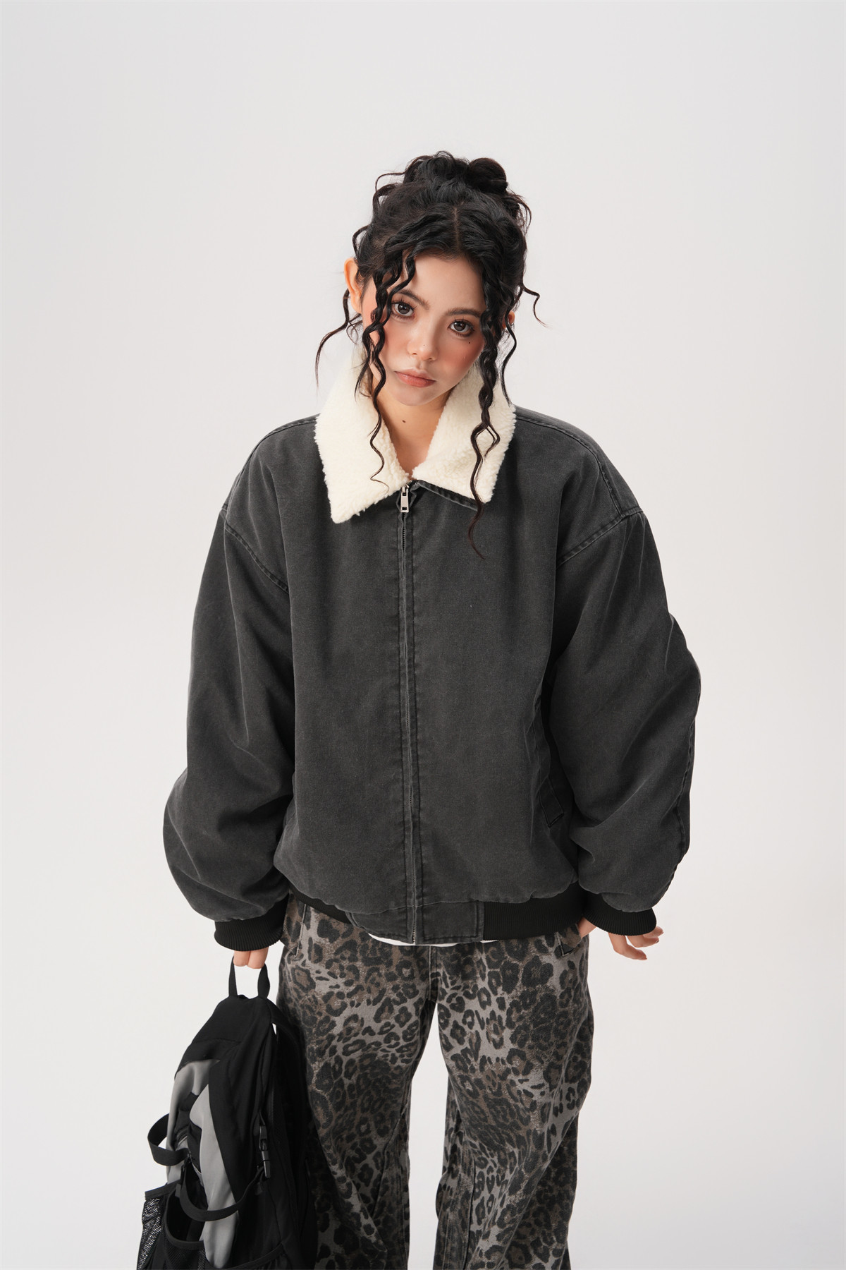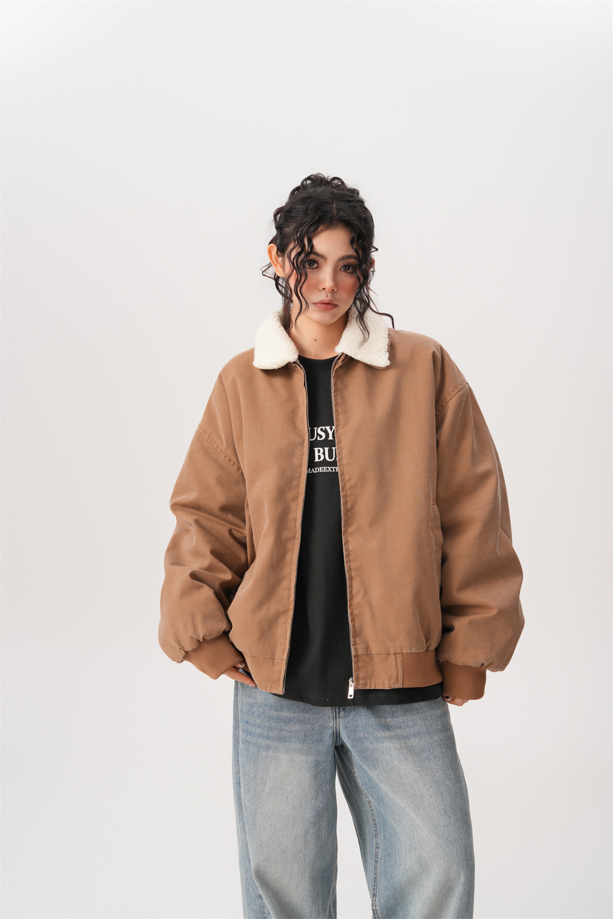 Bwka American Retro Lamb Wool Lapel Jacket for Women and Men, Winter Trendy Brand, Fleece-Lined, Warm Detroit Workwear Cotton Jacket