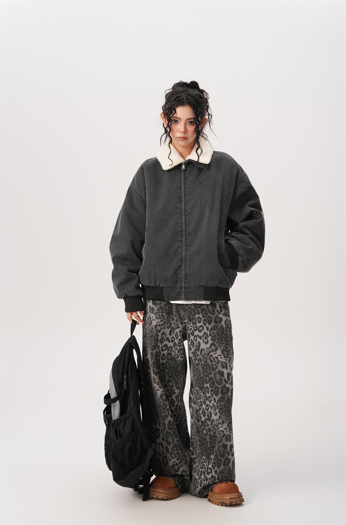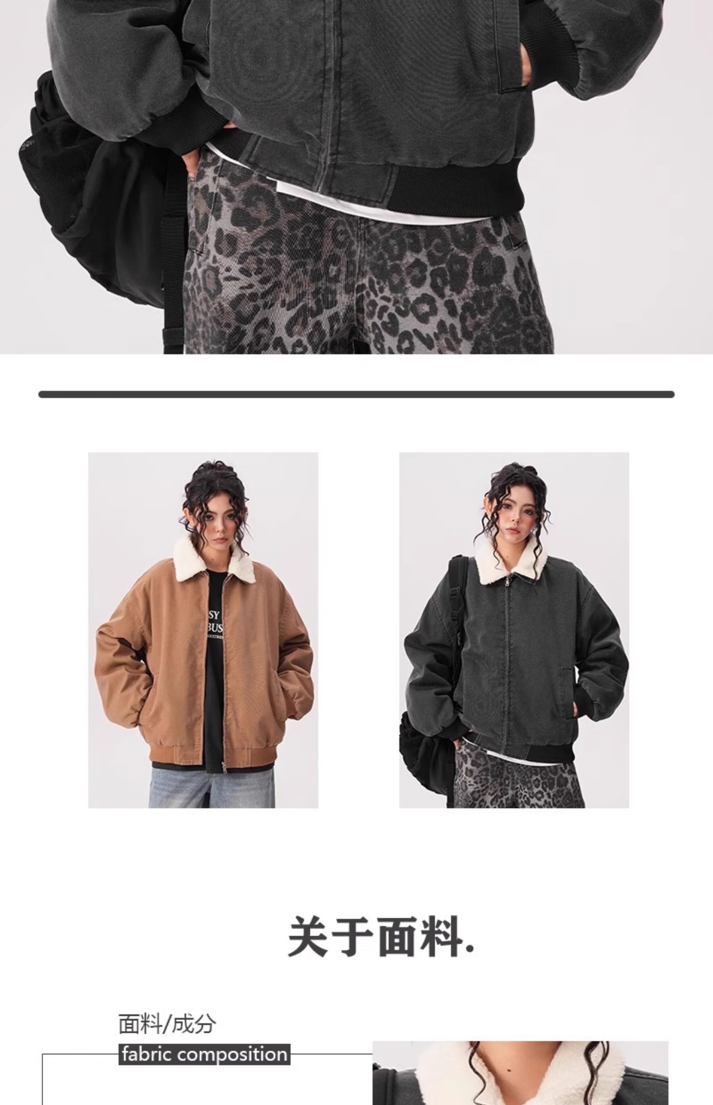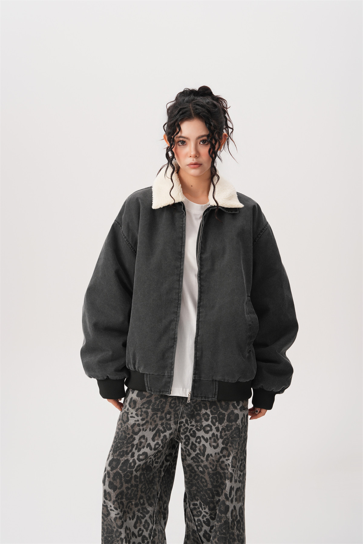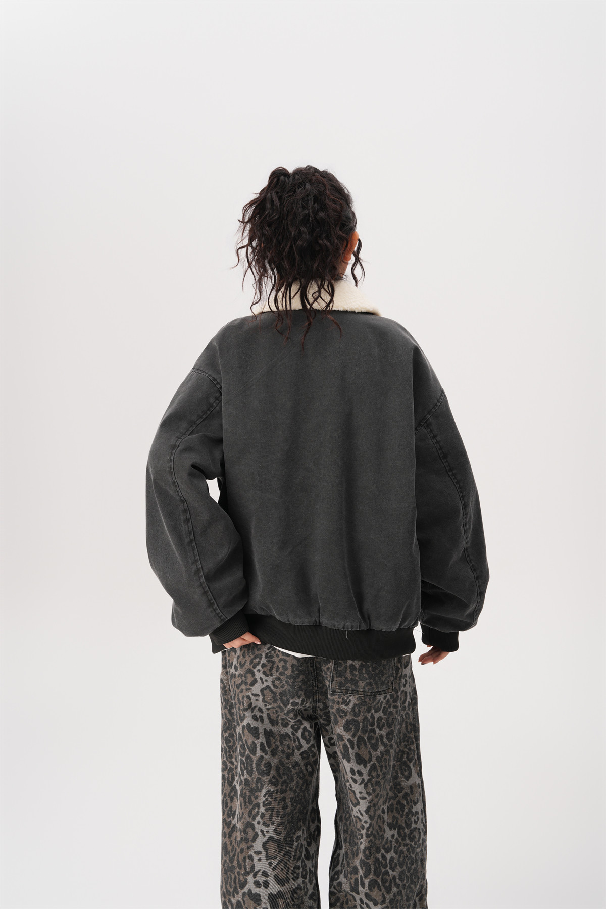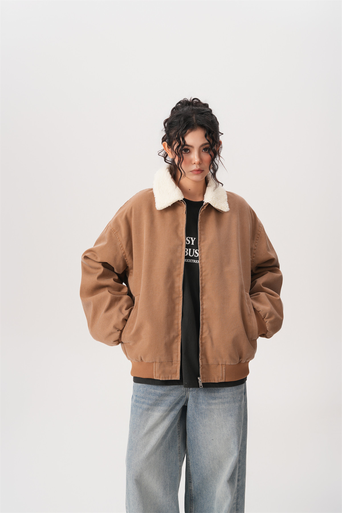Bwka American Retro Lamb Wool Lapel Jacket for Women and Men, Winter Trendy Brand, Fleece-Lined, Warm Detroit Workwear Cotton Jacket