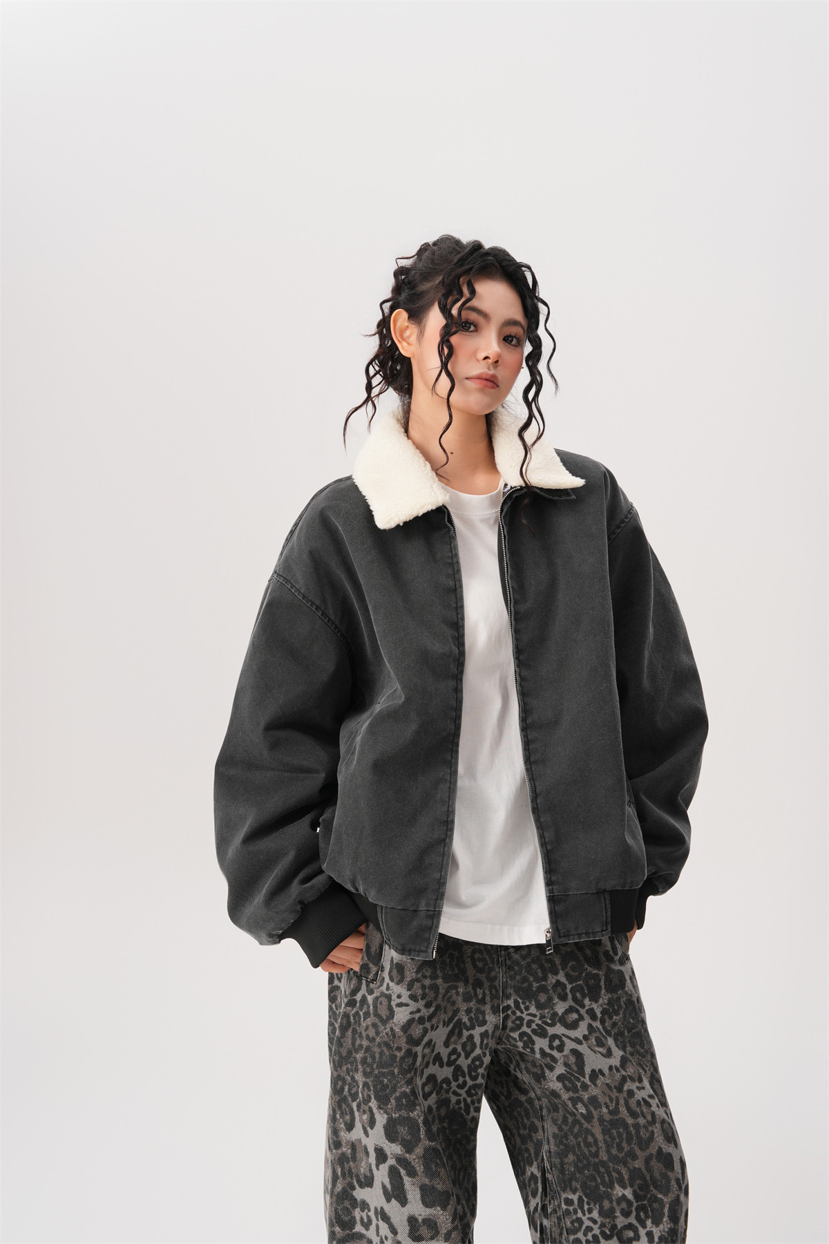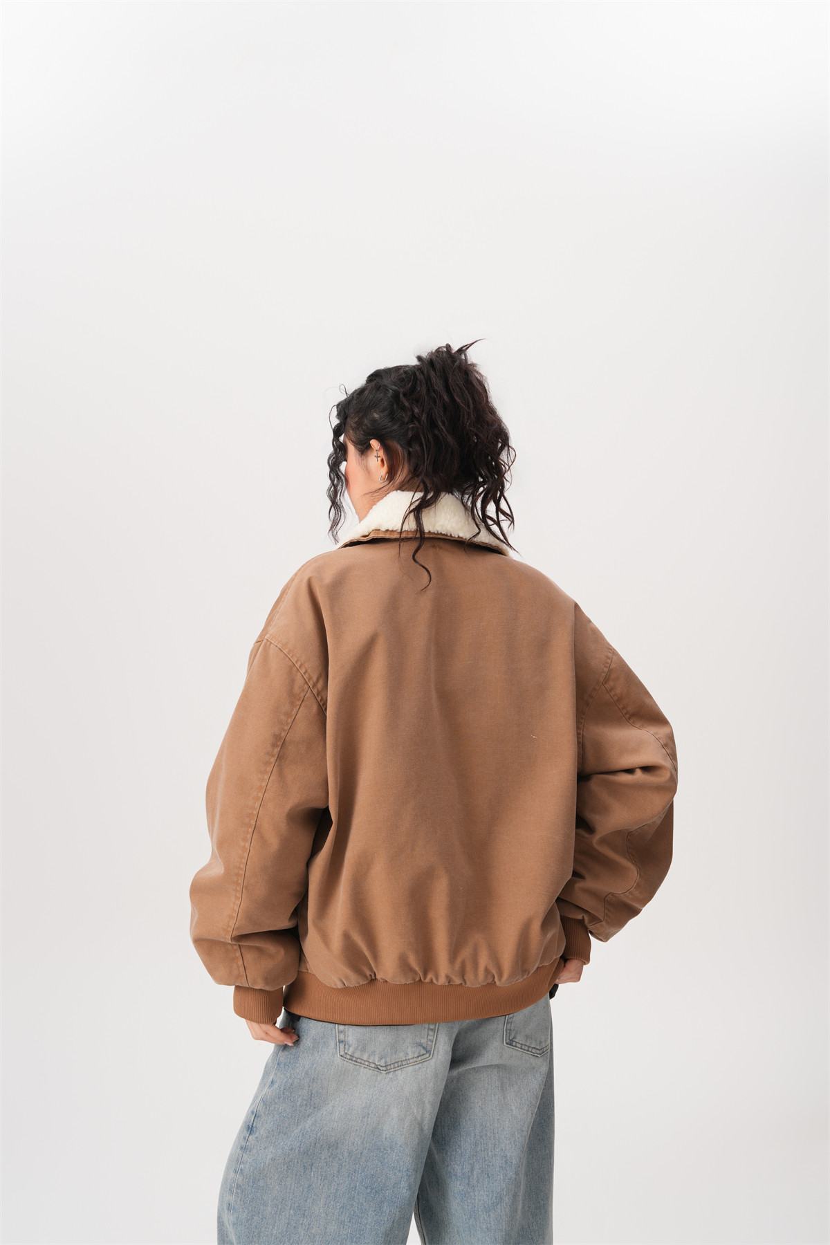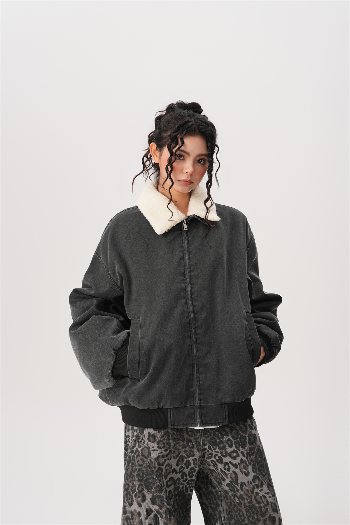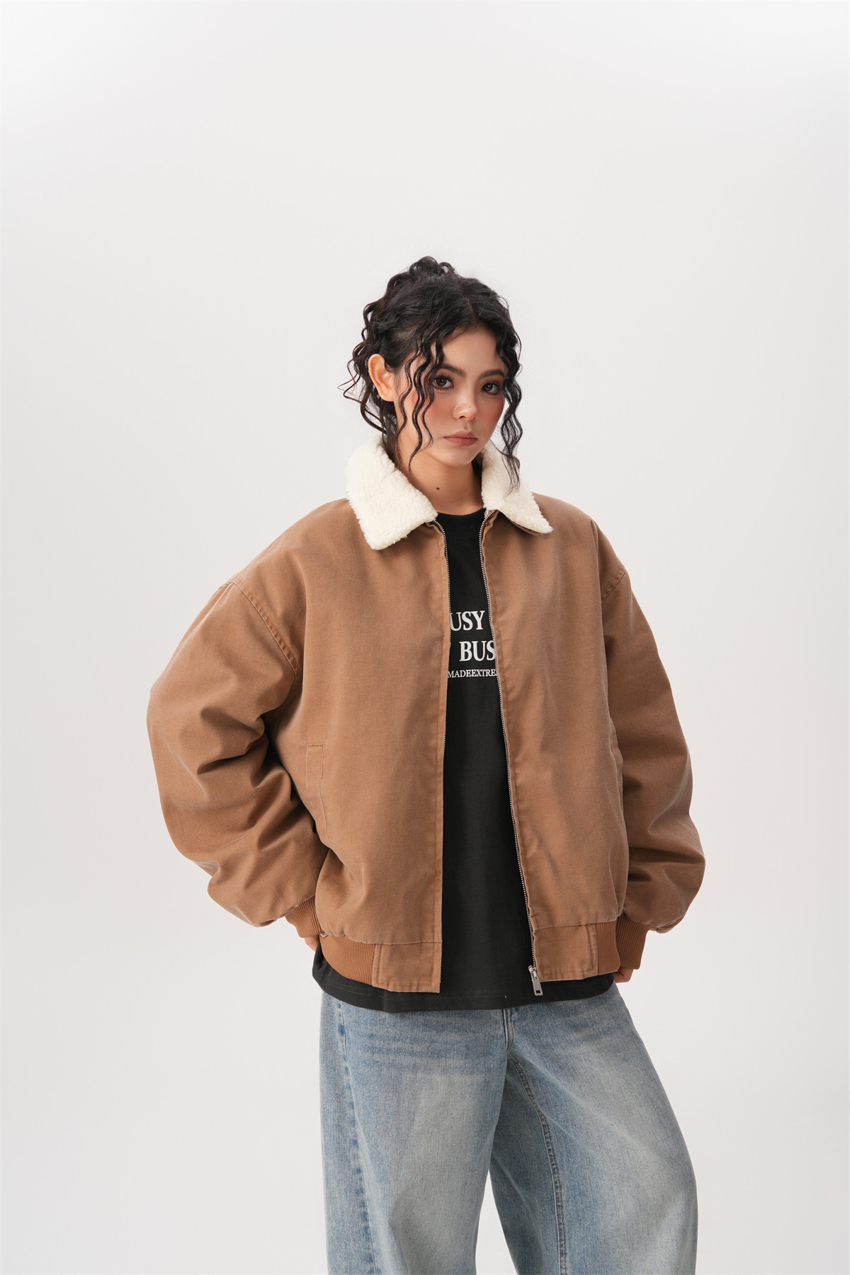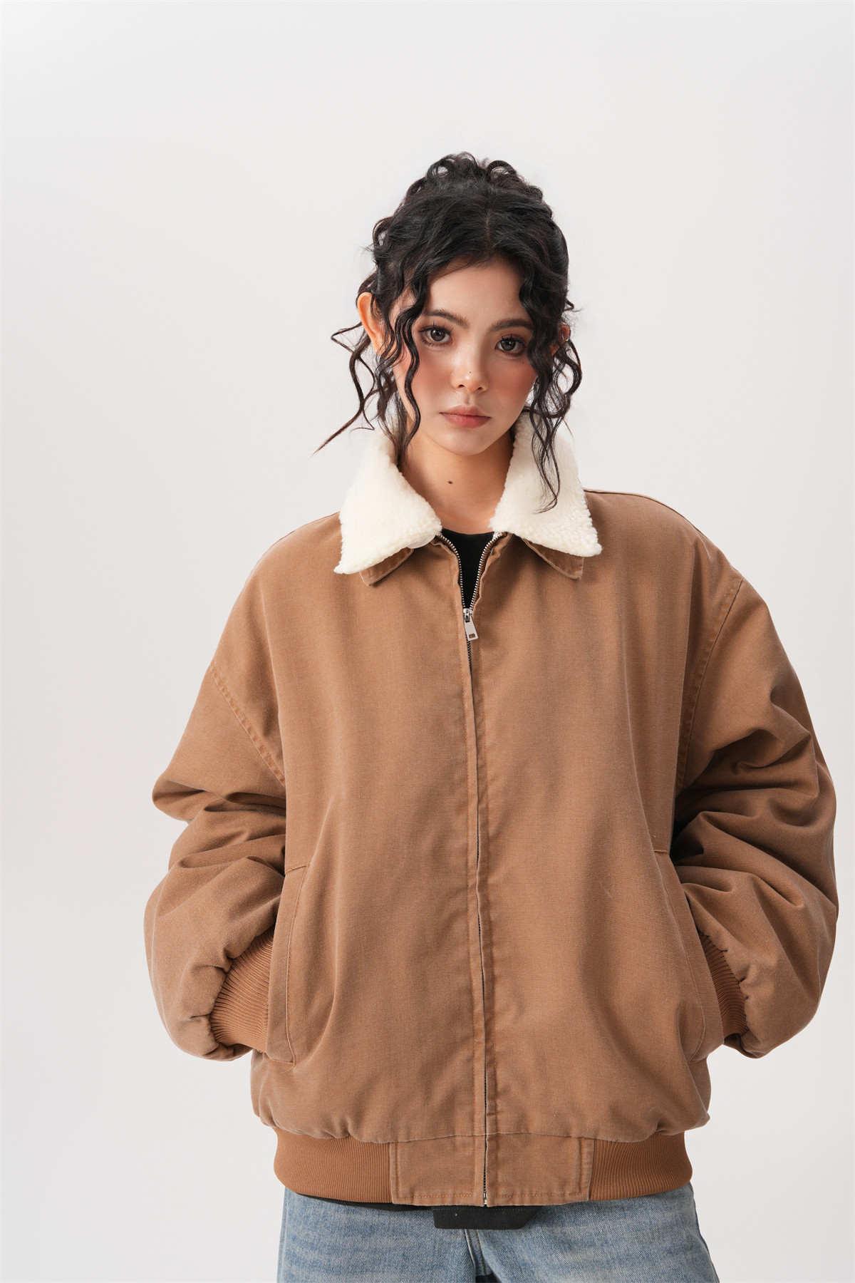 Bwka American Retro Lamb Wool Lapel Jacket for Women and Men, Winter Trendy Brand, Fleece-Lined, Warm Detroit Workwear Cotton Jacket