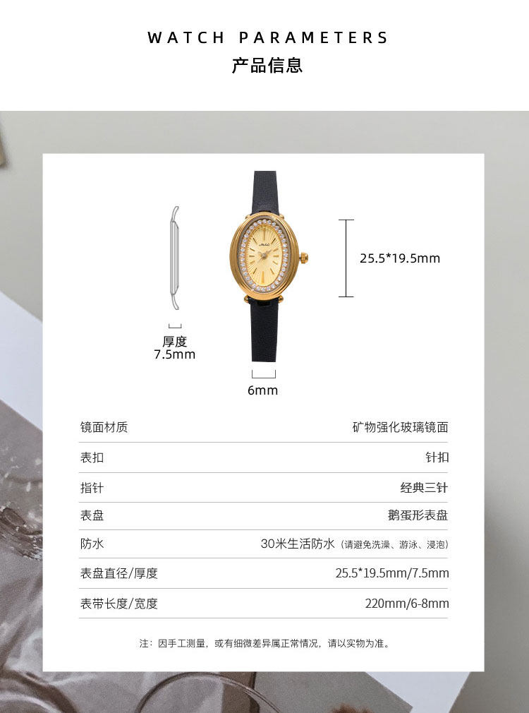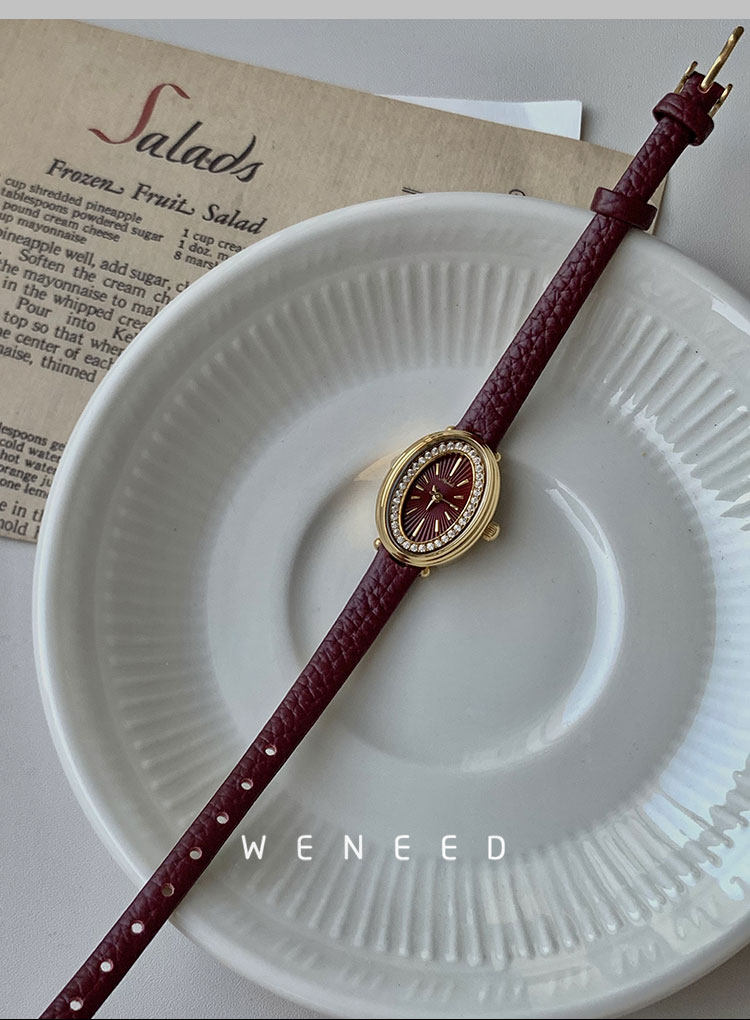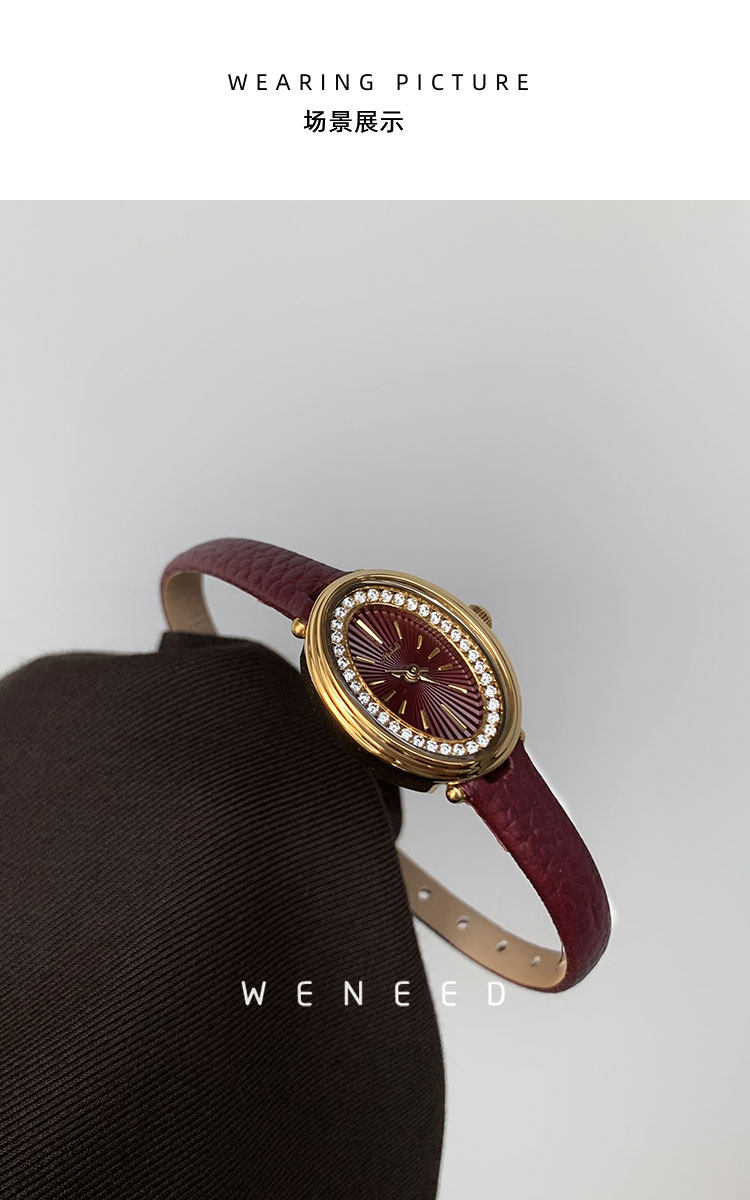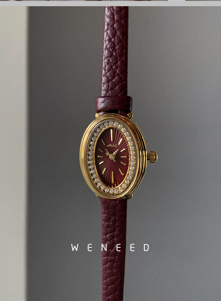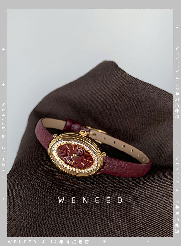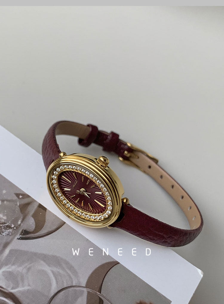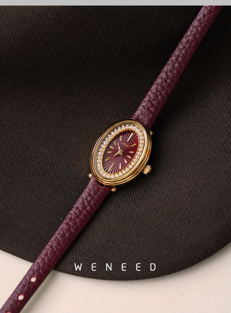 Weneed Ankora Red Watch for Women, Fashionable Oval Diamond-Studded Genuine Leather Niche Light Luxury Retro Women's Quartz Watch