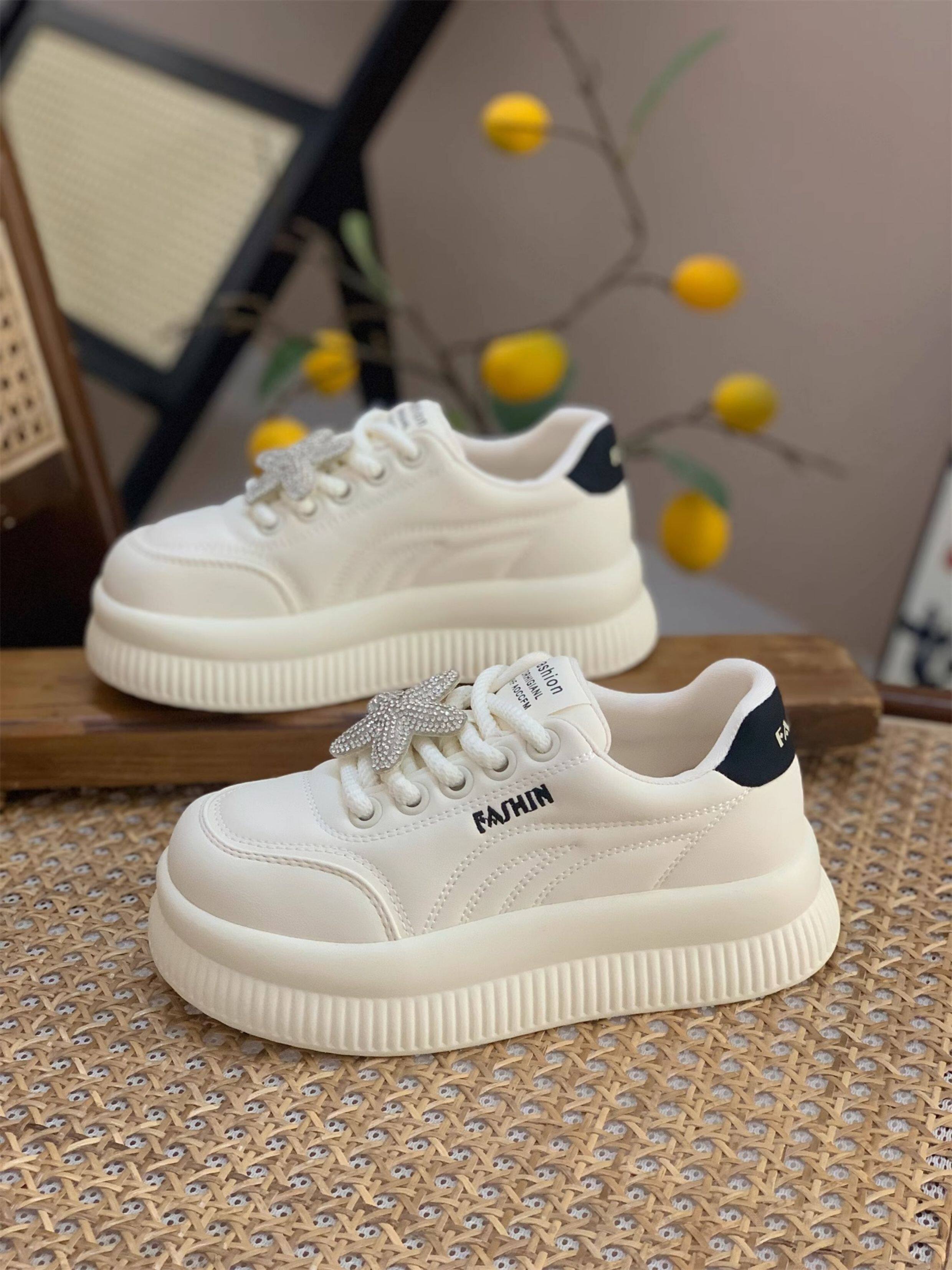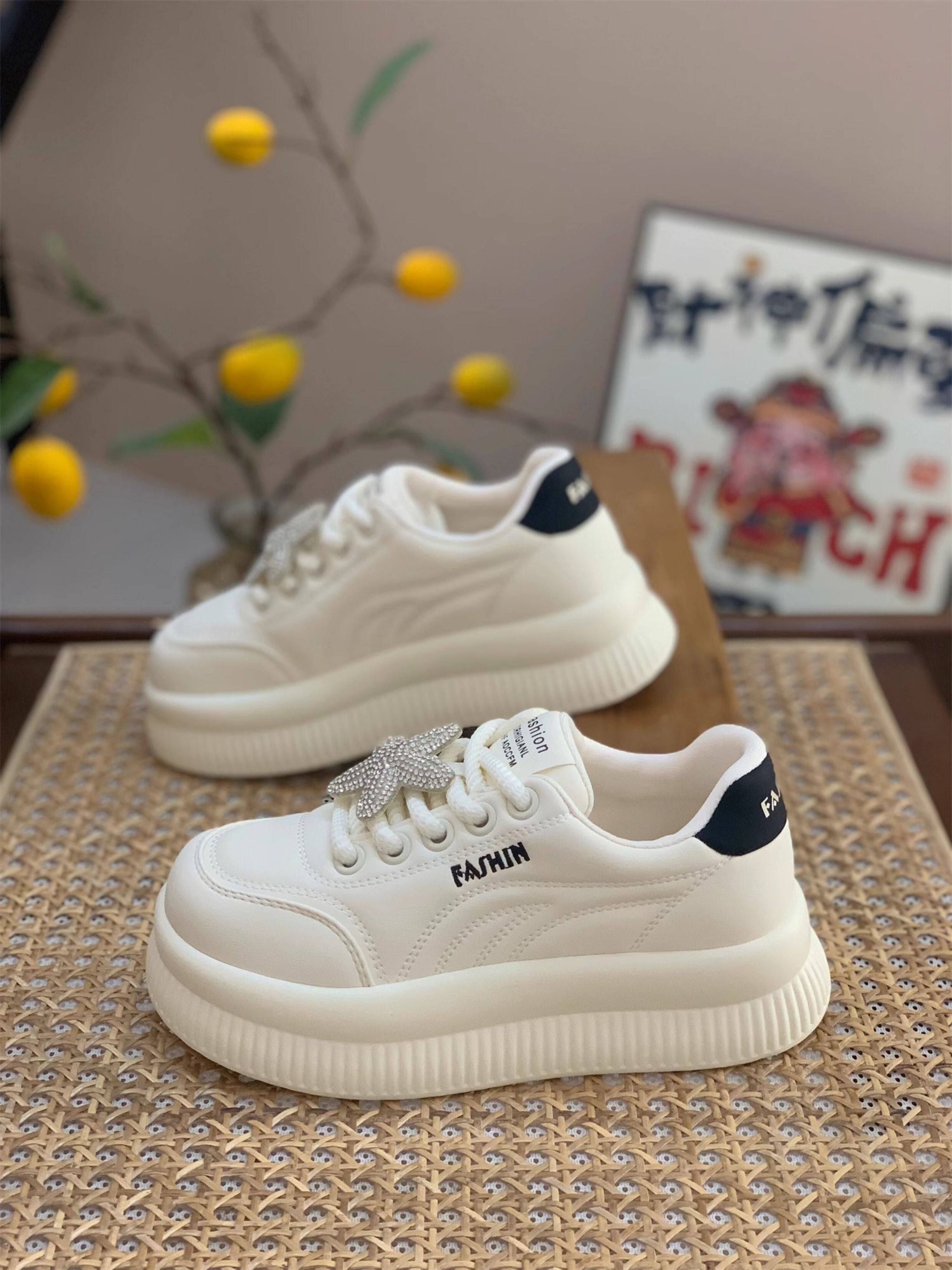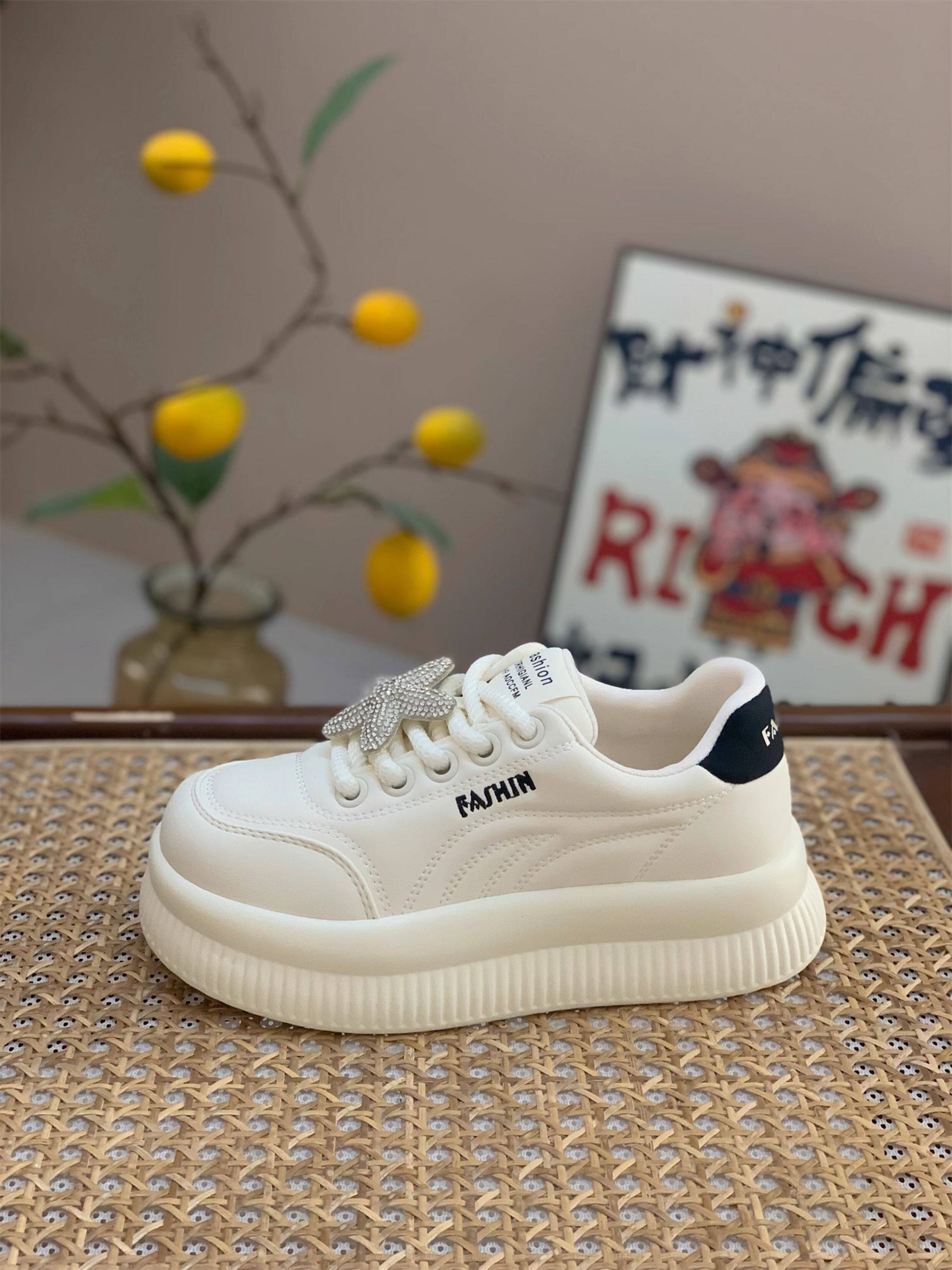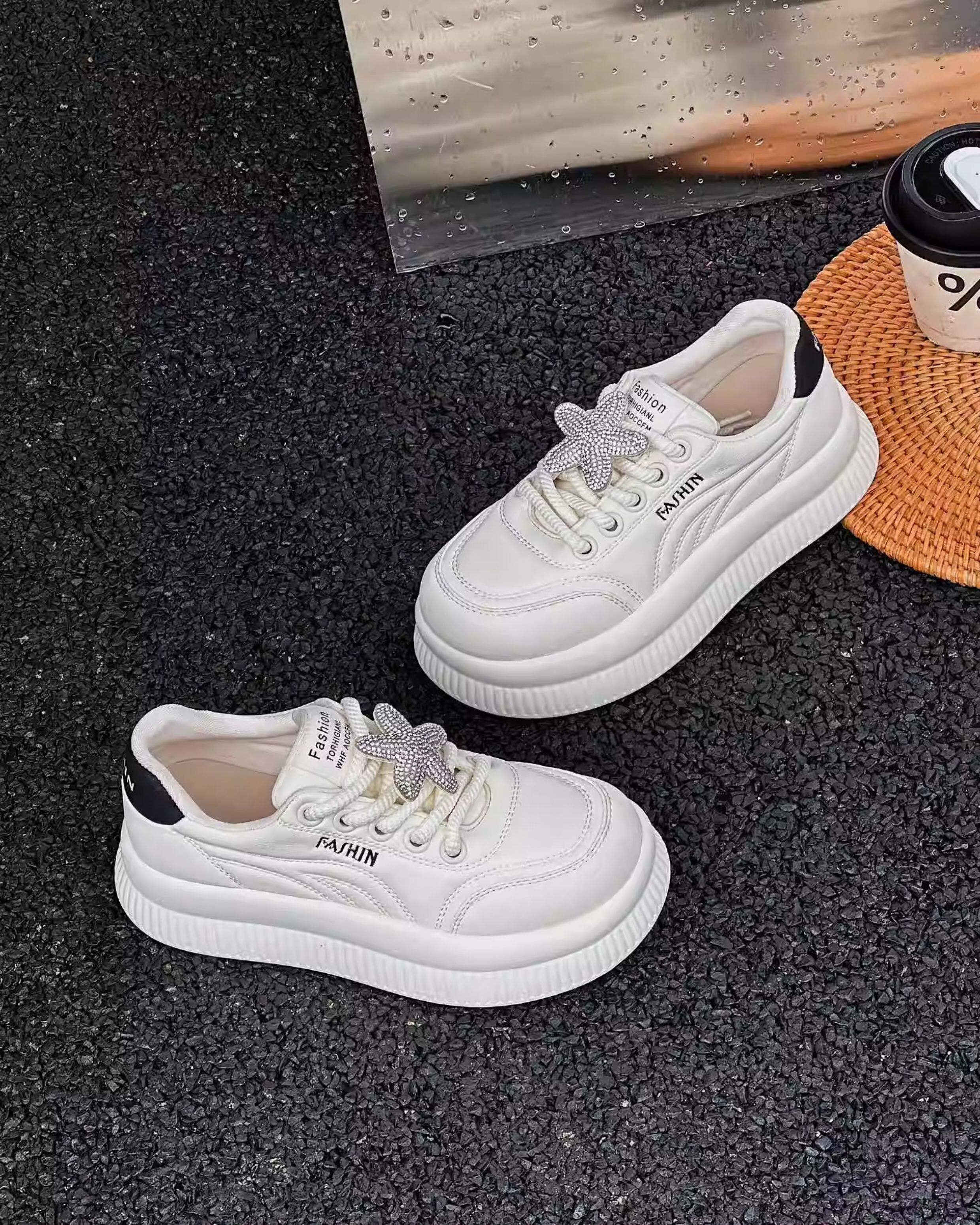 Hong Kong Genuine Leather Thick-Soled Height-Increasing White Sneakers for Women, 2026 Spring New Style, Star-Pattern Platform Shoes, Versatile Lace-Up Loafers