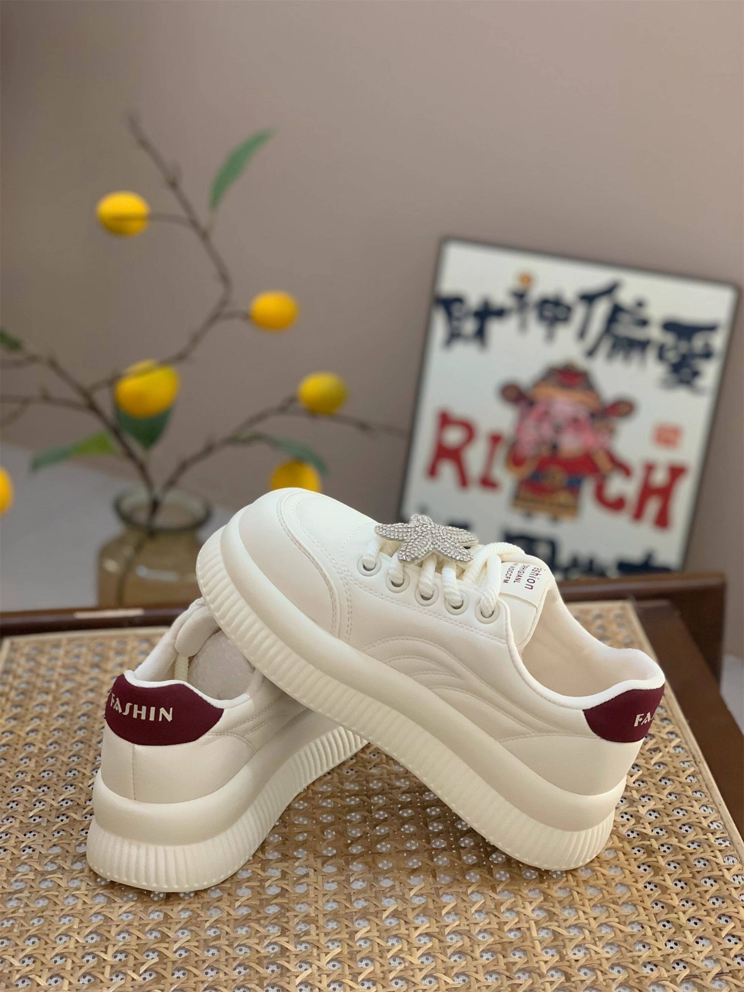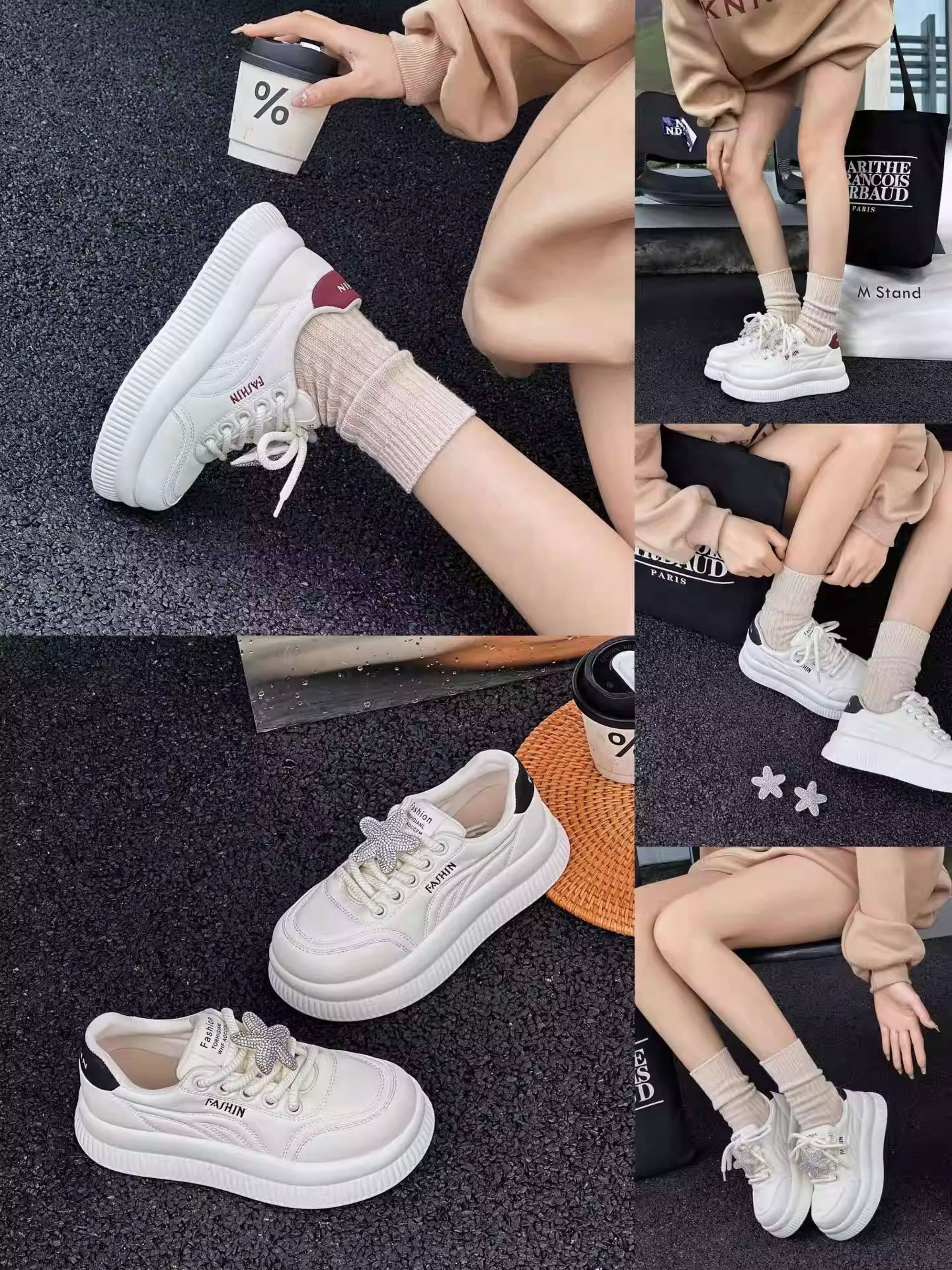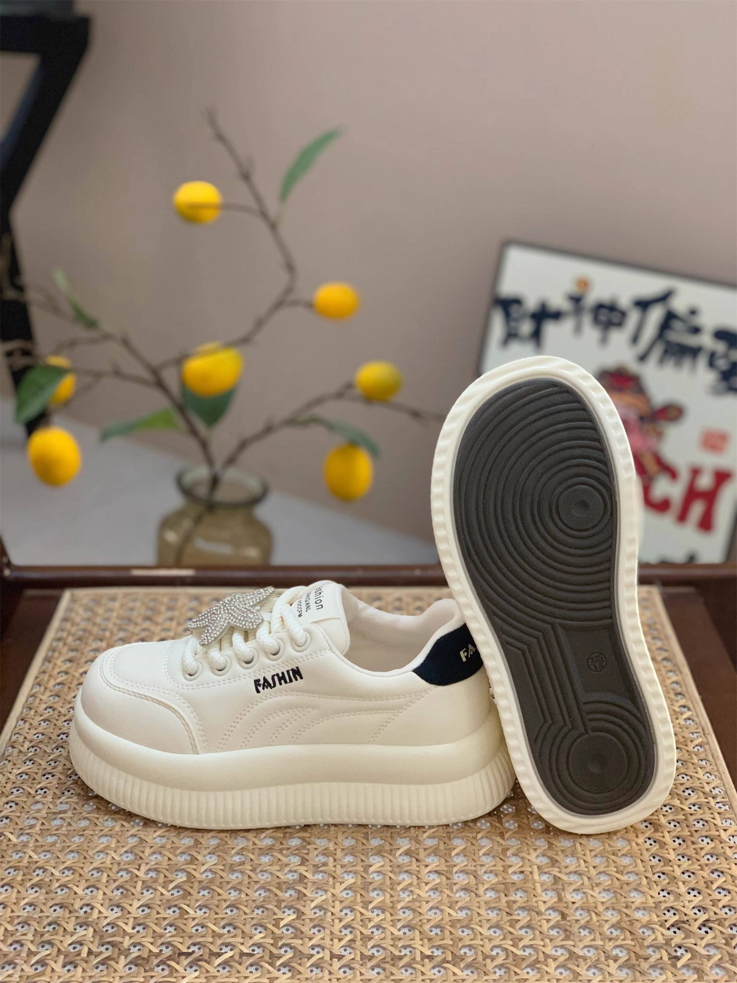 Hong Kong Genuine Leather Thick-Soled Height-Increasing White Sneakers for Women, 2026 Spring New Style, Star-Pattern Platform Shoes, Versatile Lace-Up Loafers
