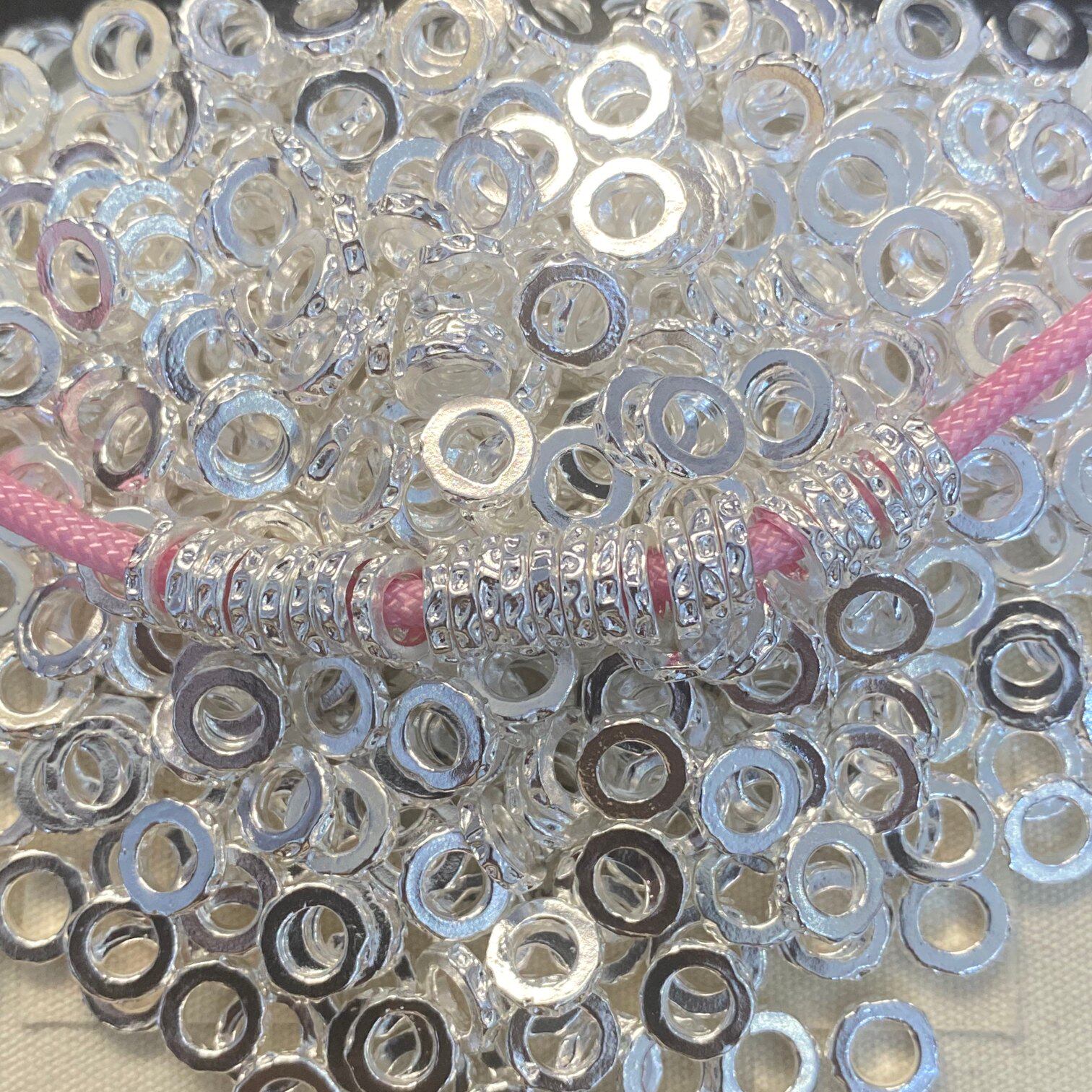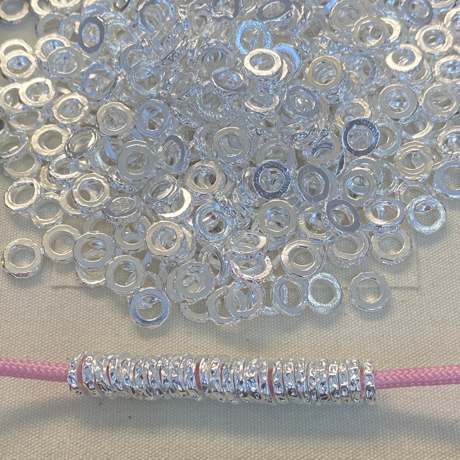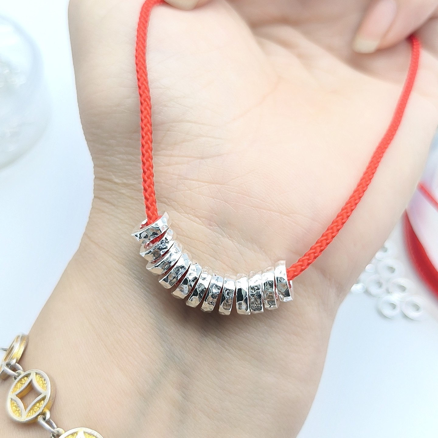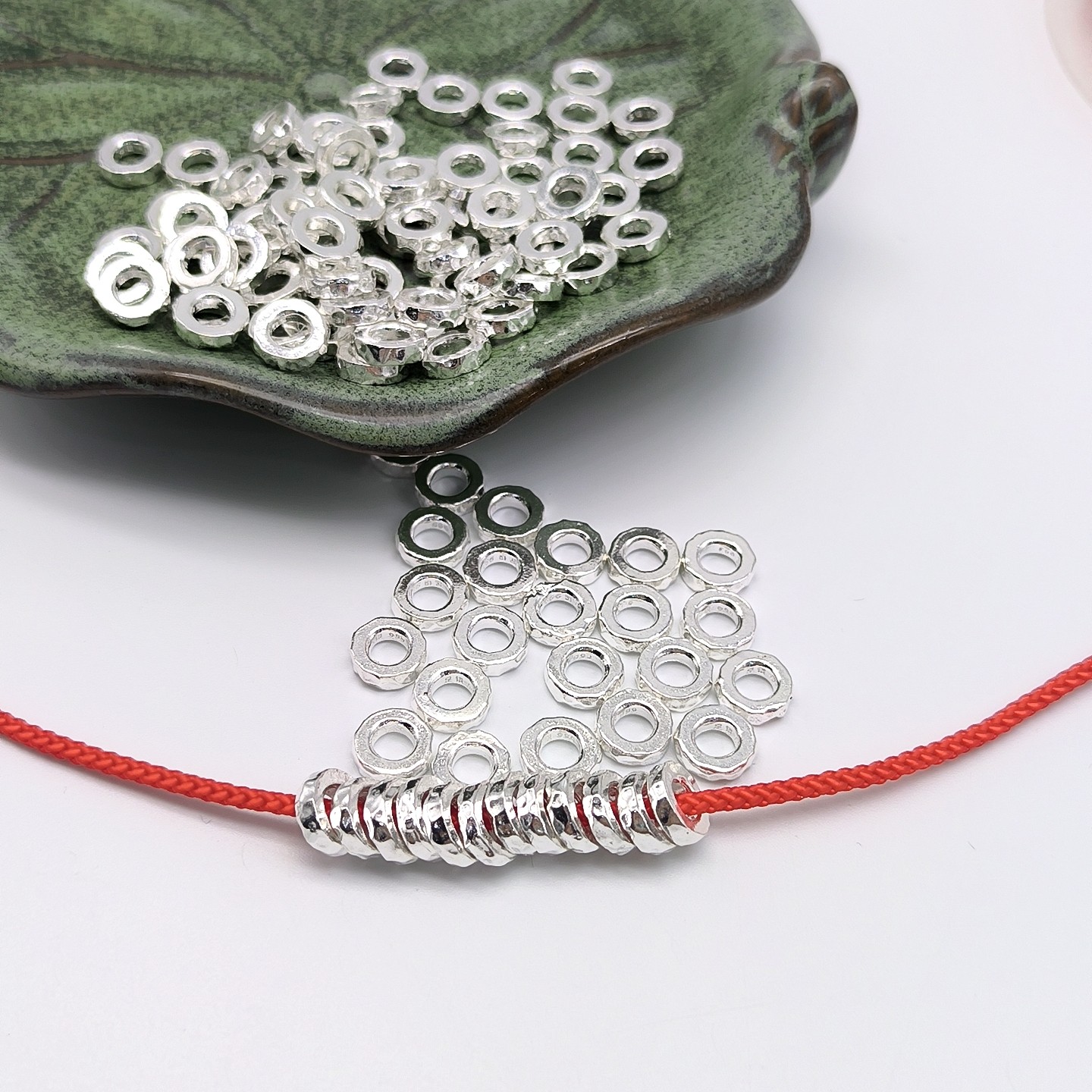 999 Pure Silver Hammered Solid Disc with Beads, Large Hole Spacer, Handmade Braided Cord Accessories