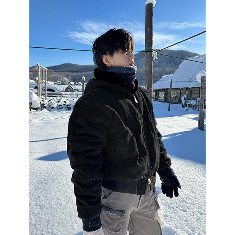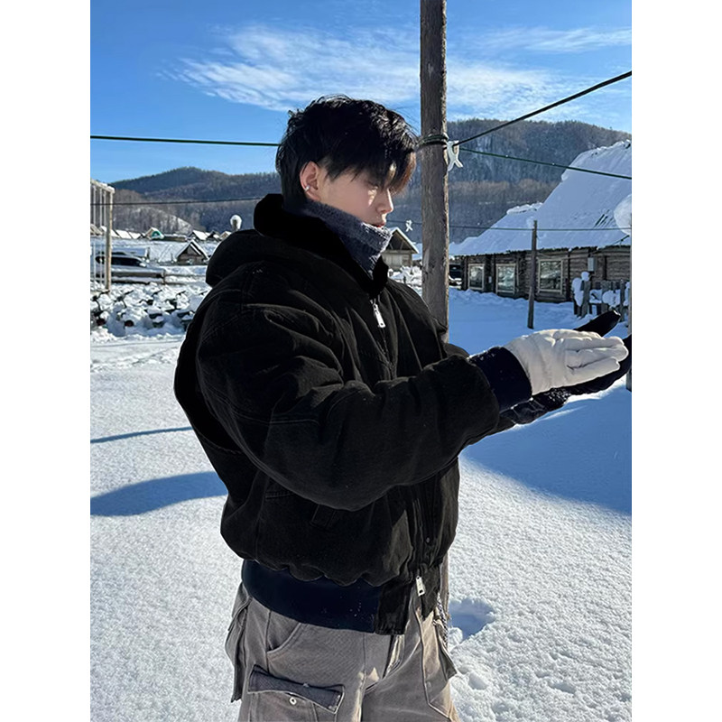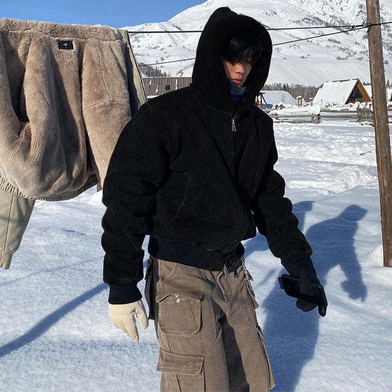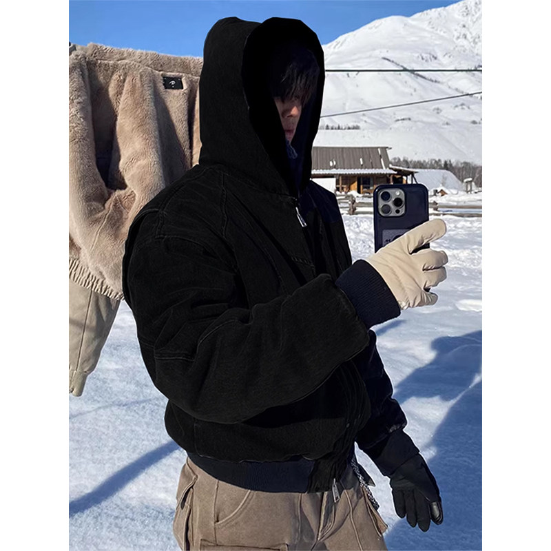 Cleanfit Short Mountain Carving Cotton Jacket for Men, Winter Fleece-Lined Thickened Cotton Coat, American Retro Hooded Jacket
