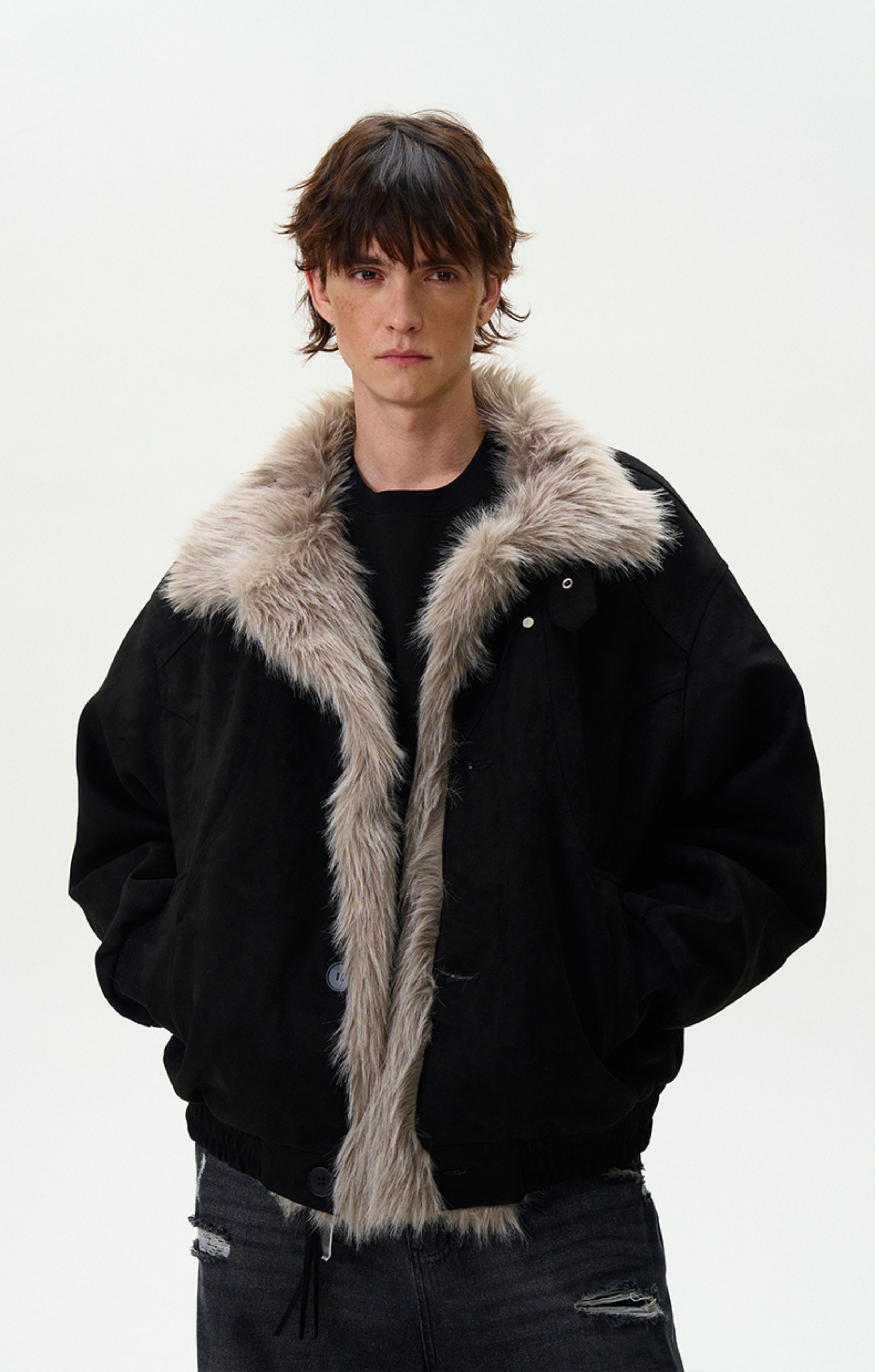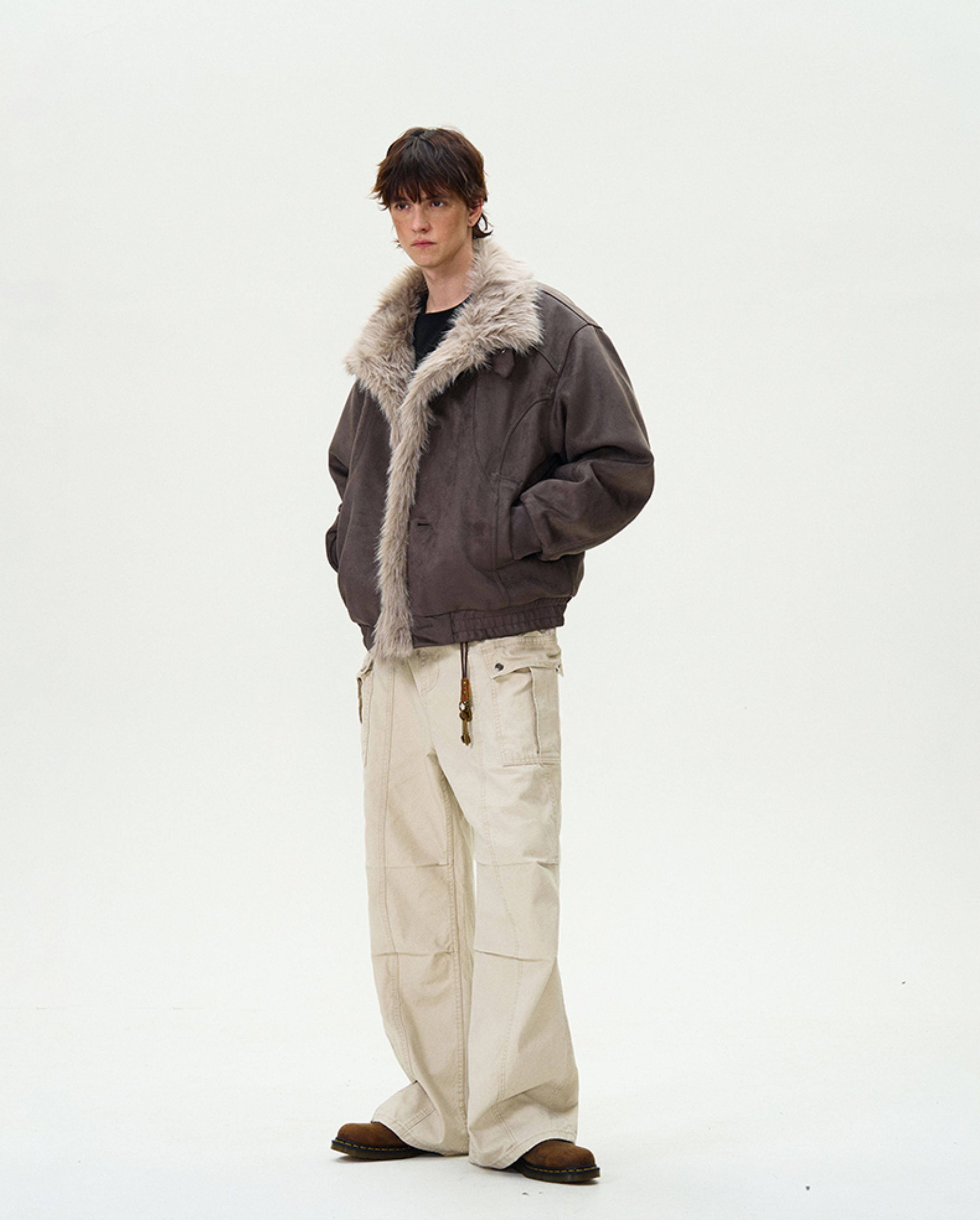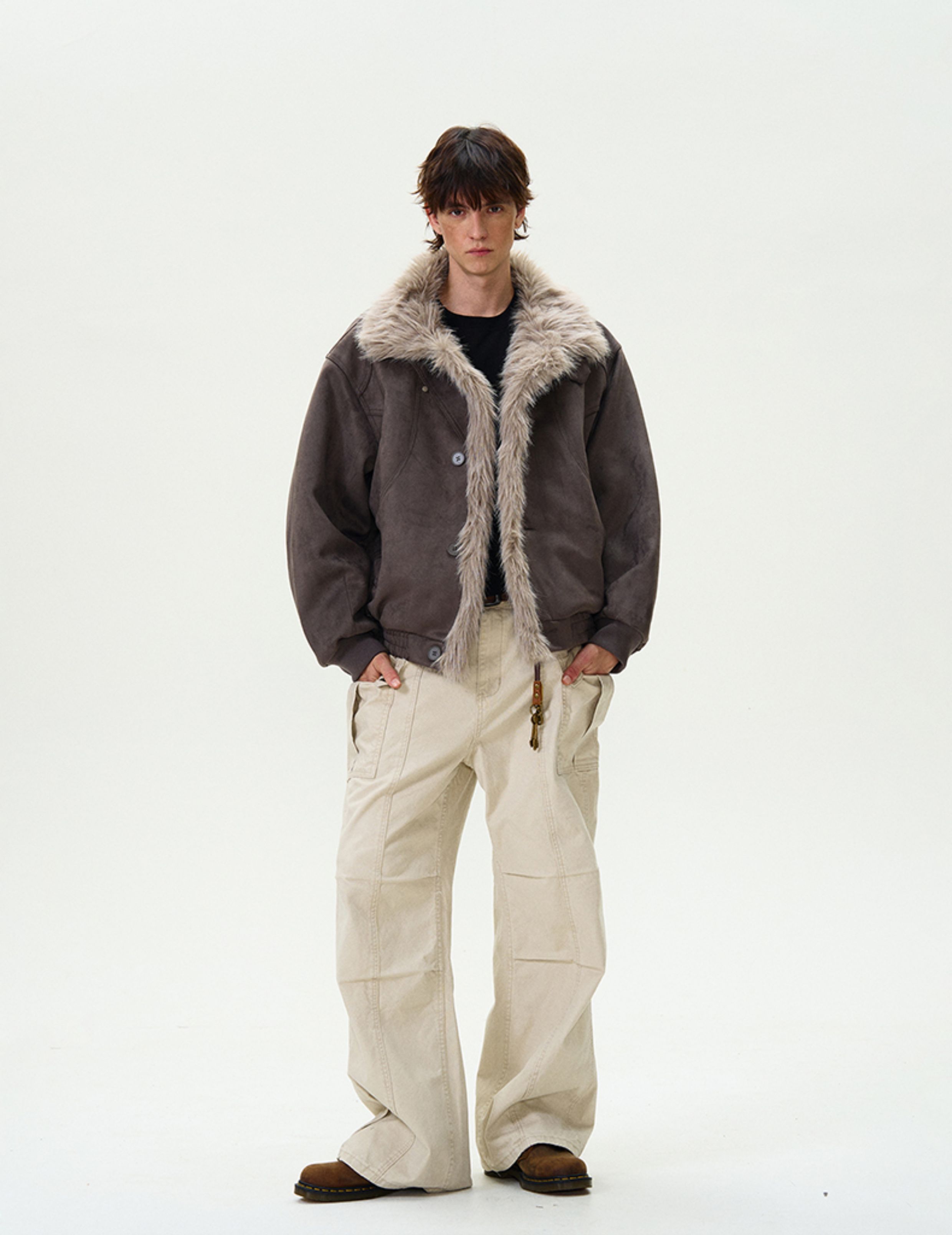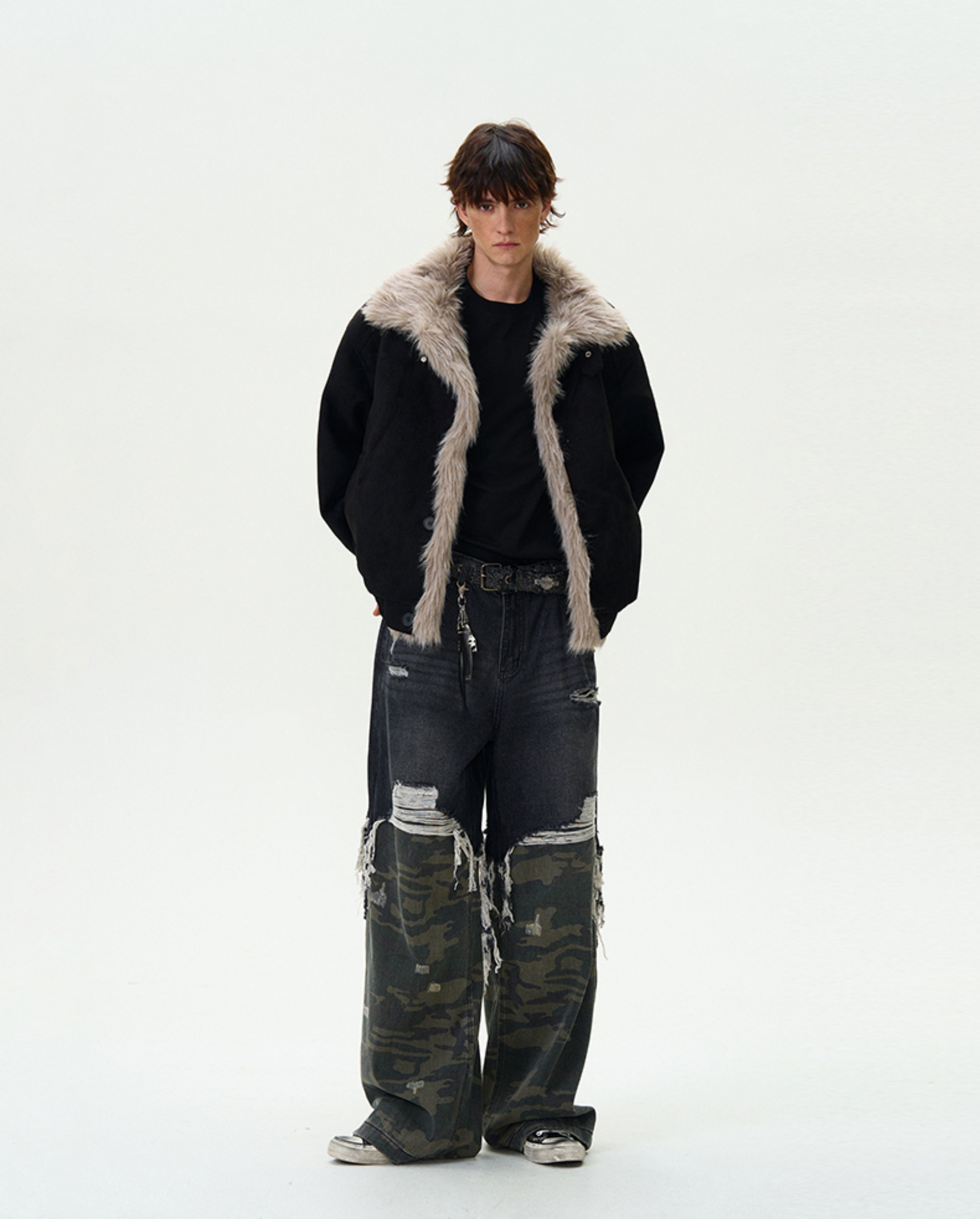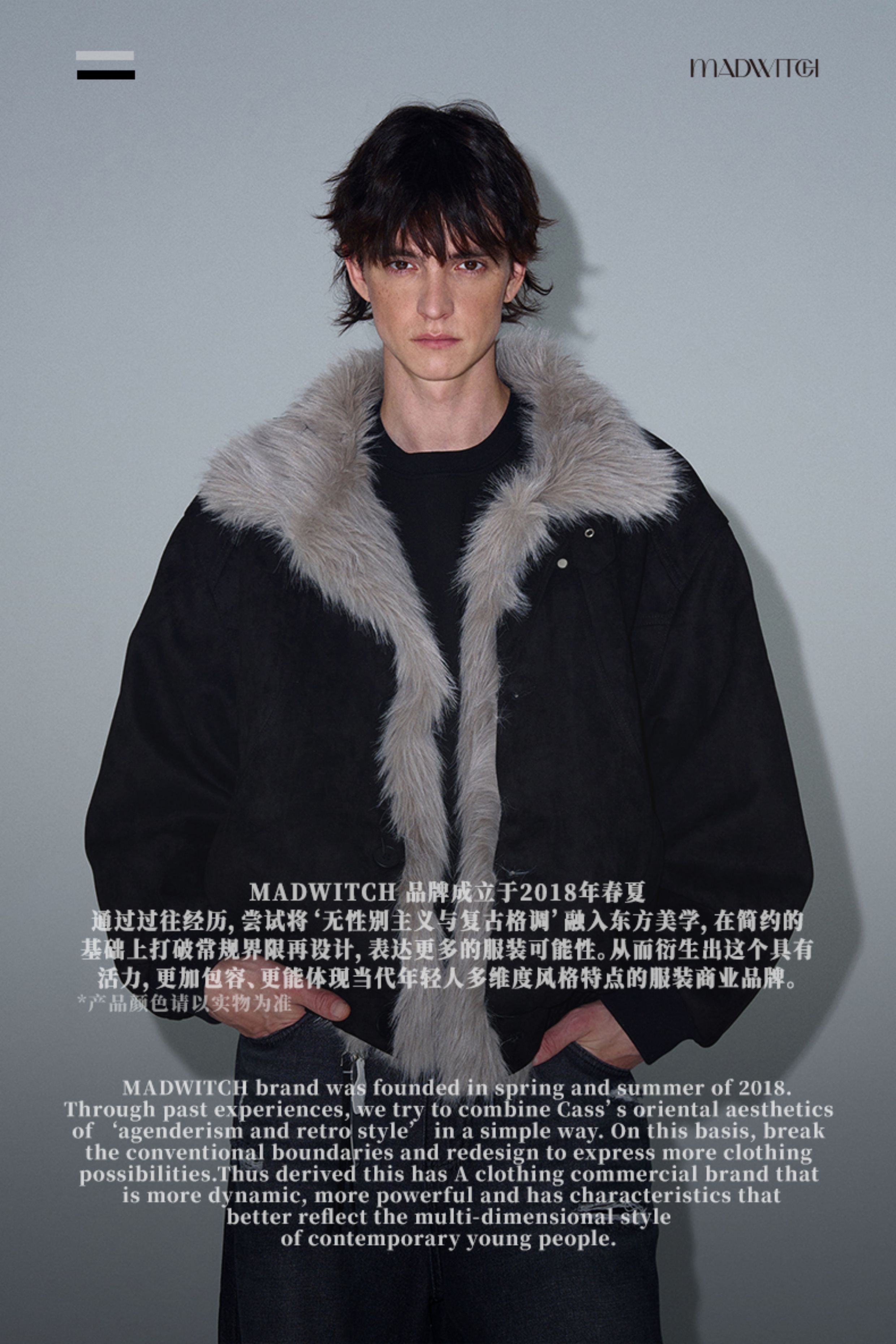 Madwitch Vintage Distressed Mountain Carving Thick Cotton Jacket for Men and Women, Loose Deconstructed Brushed High-End Fur Collar Coat