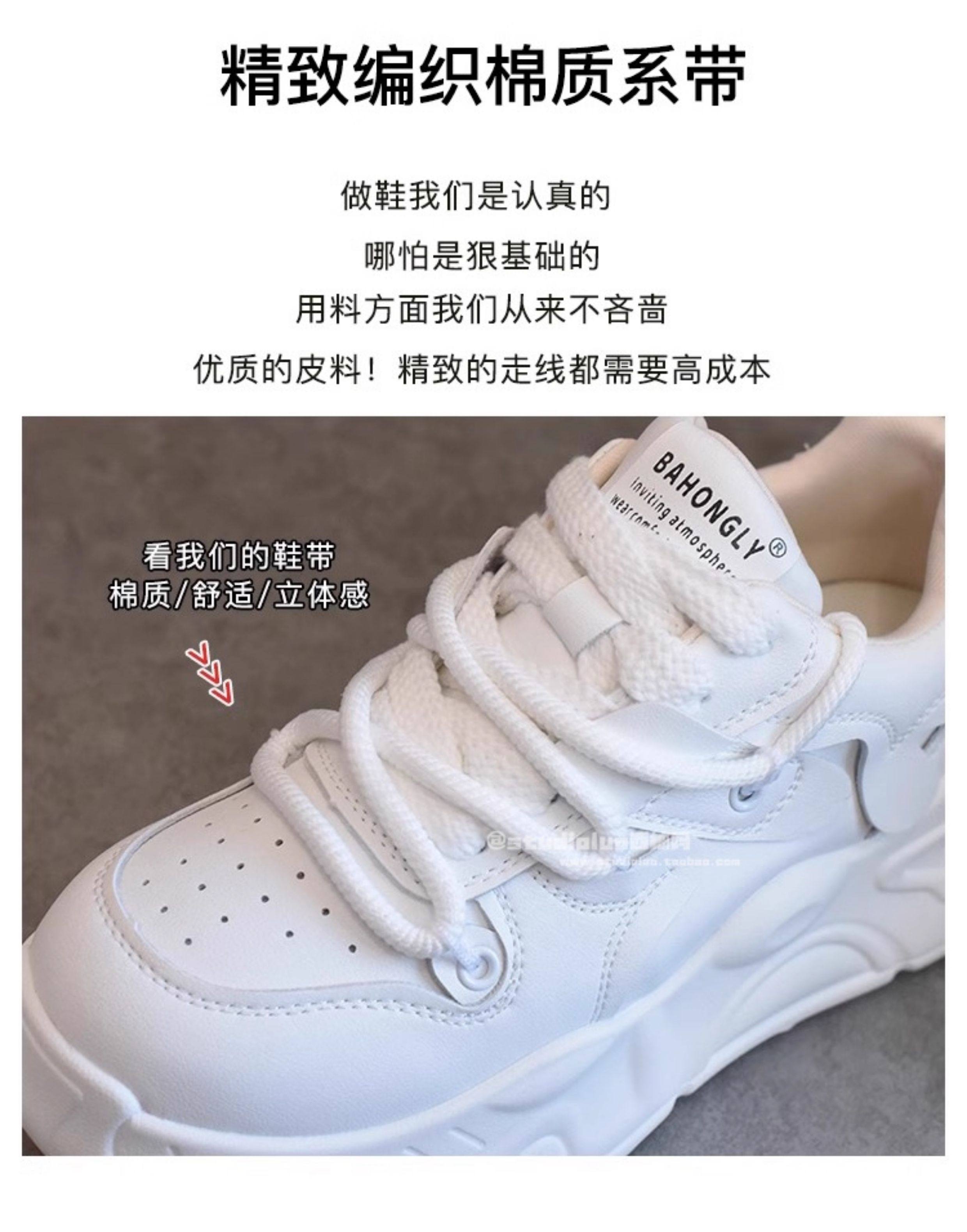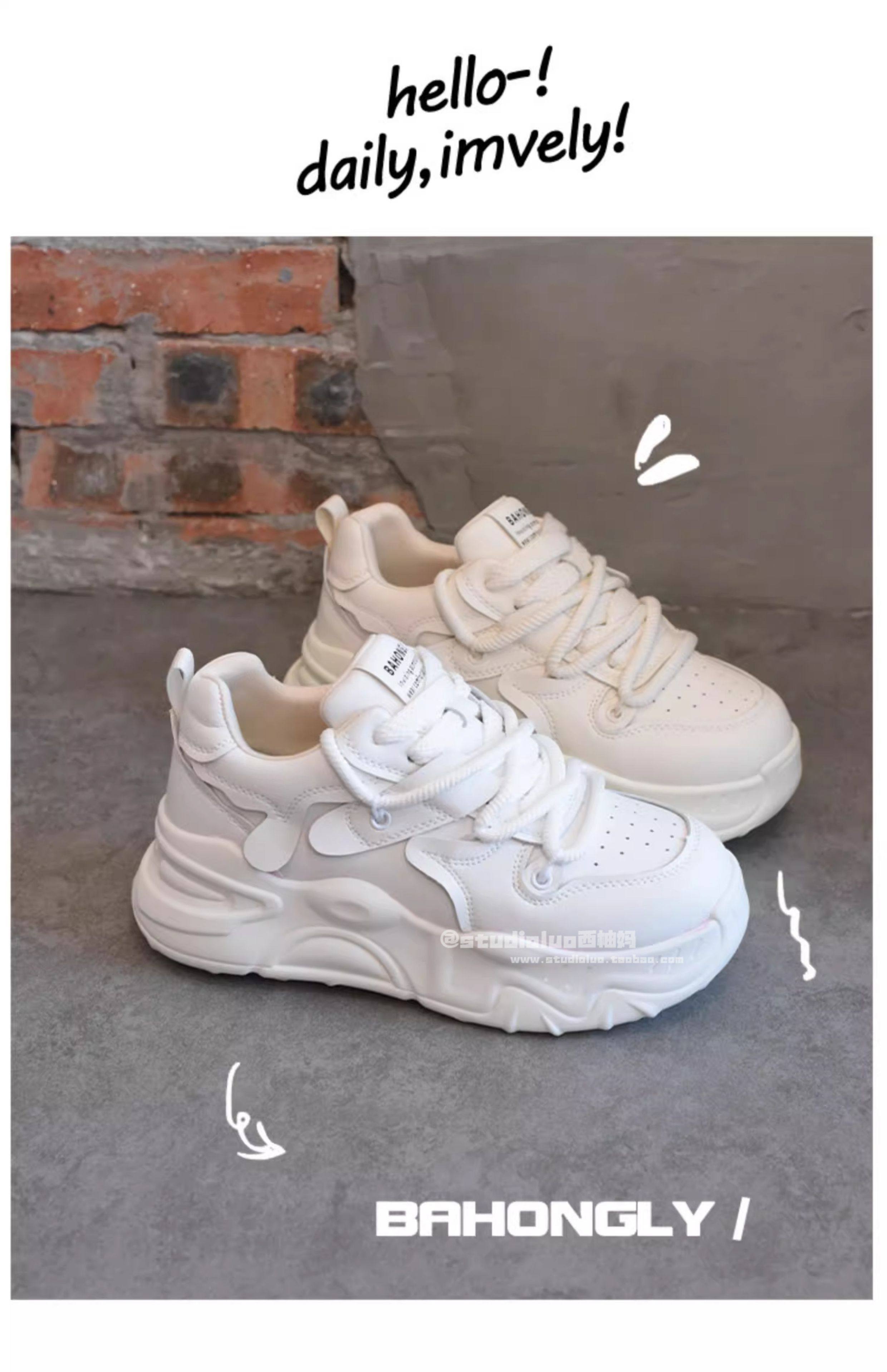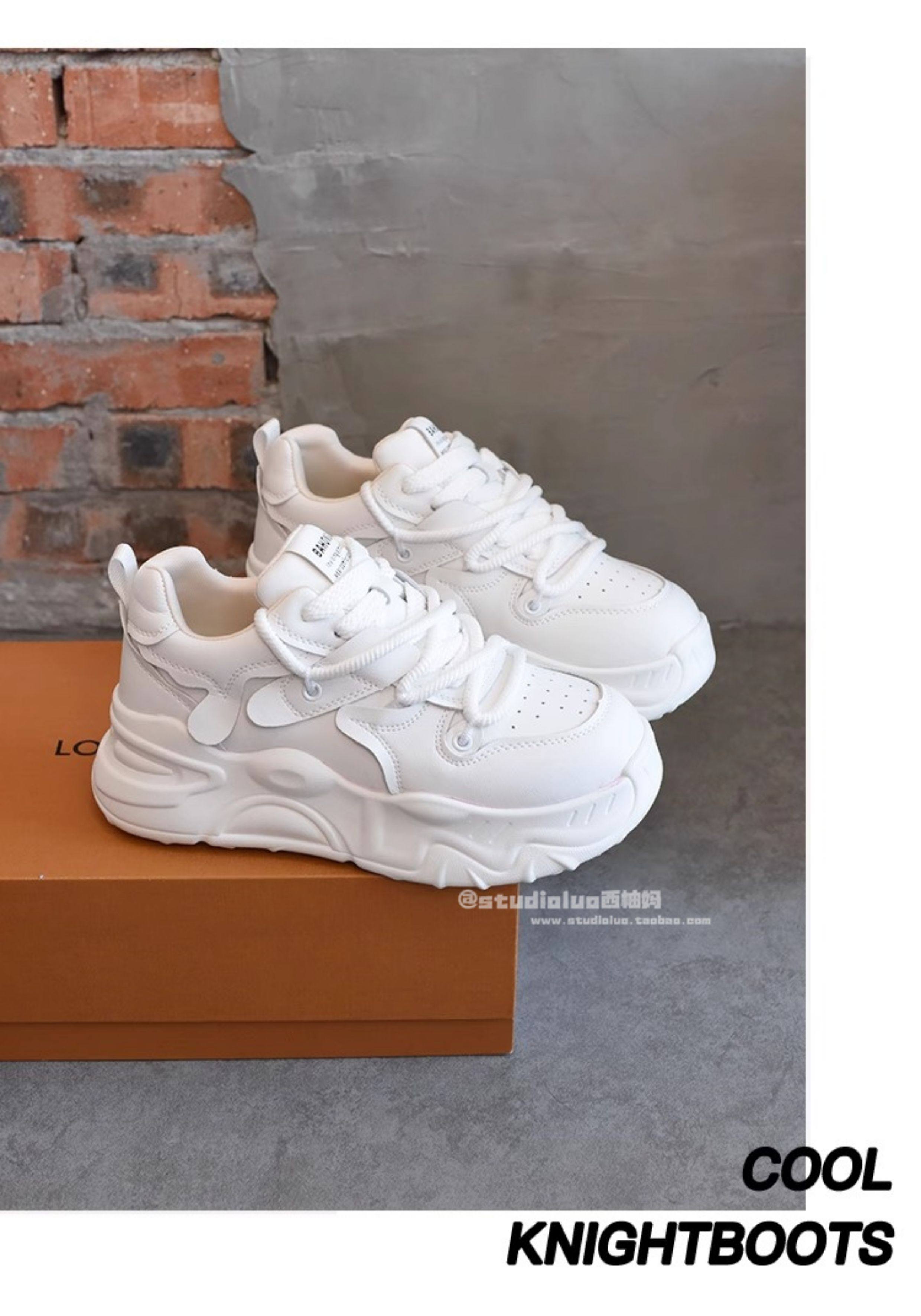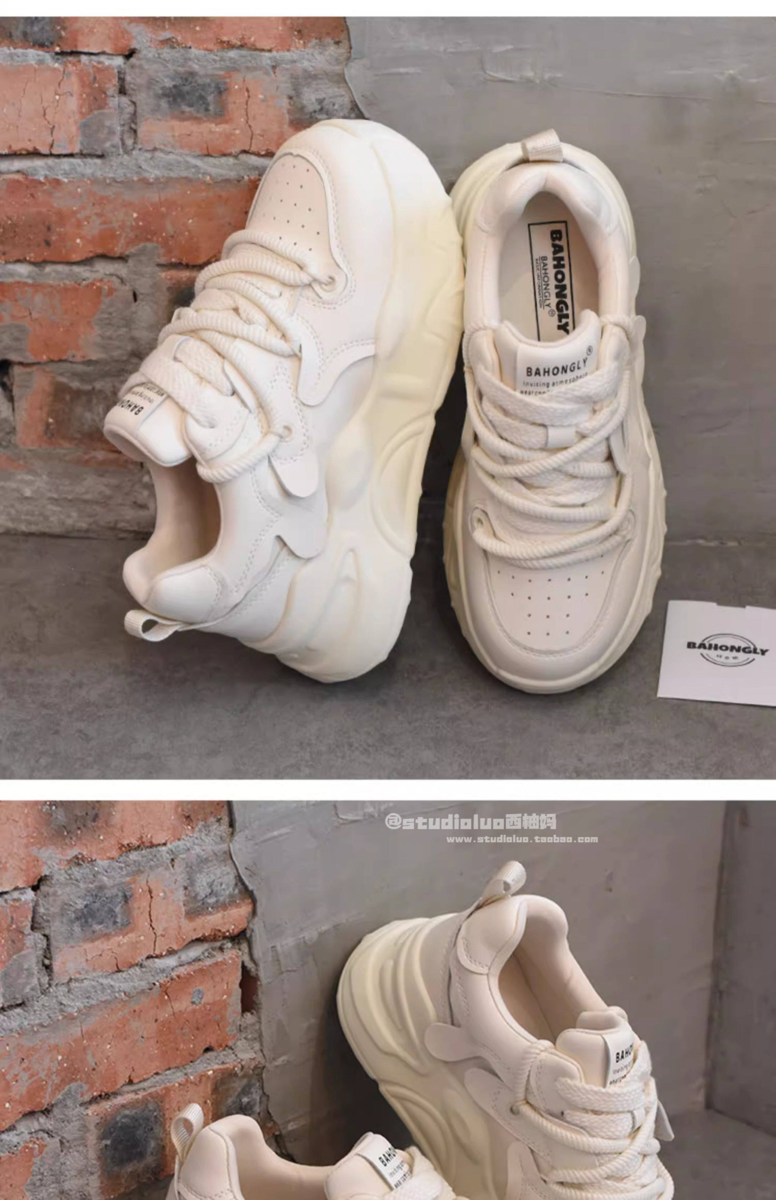 Hong Kong Genuine Leather Casual Versatile White Sneakers for Women 2025 Spring New Lace-Up Fleece-Lined Fashionable Height-Increasing Thick-Soled Dad Shoes