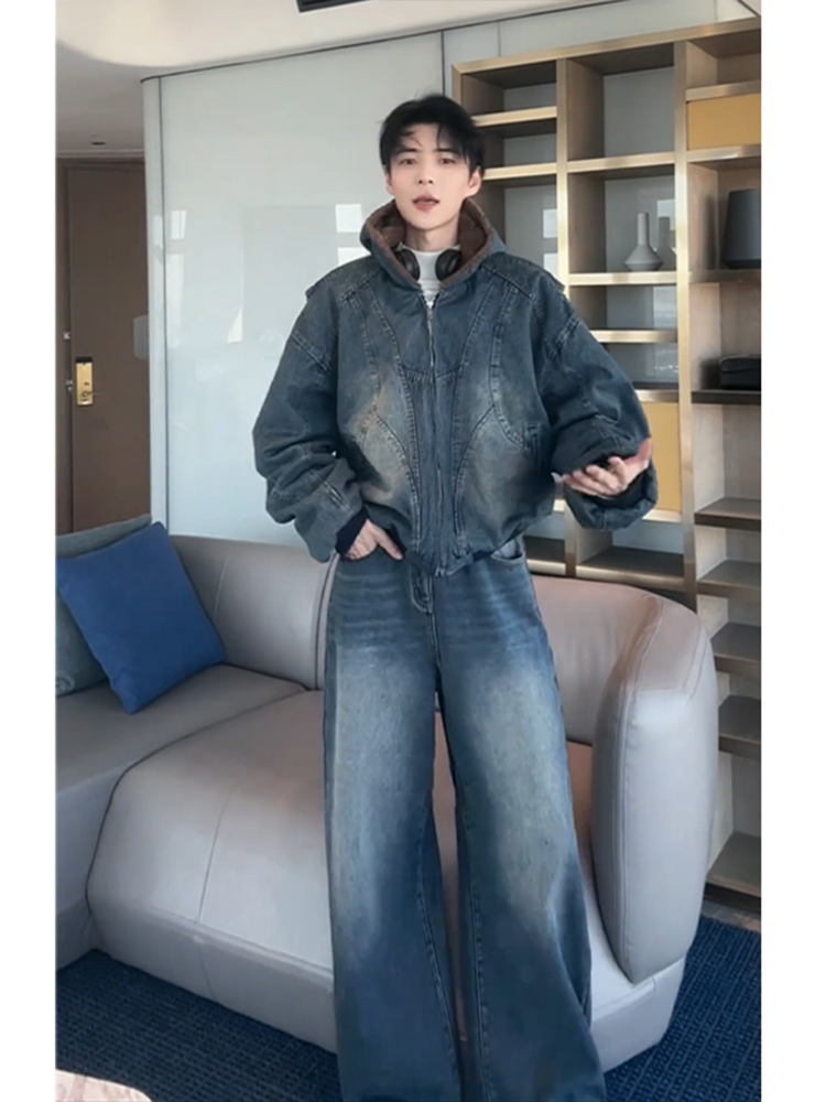 American Retro Blue Denim Suit for Men, Thickened Double-Sided Lamb Wool Cotton Jacket, Winter Outfit Set