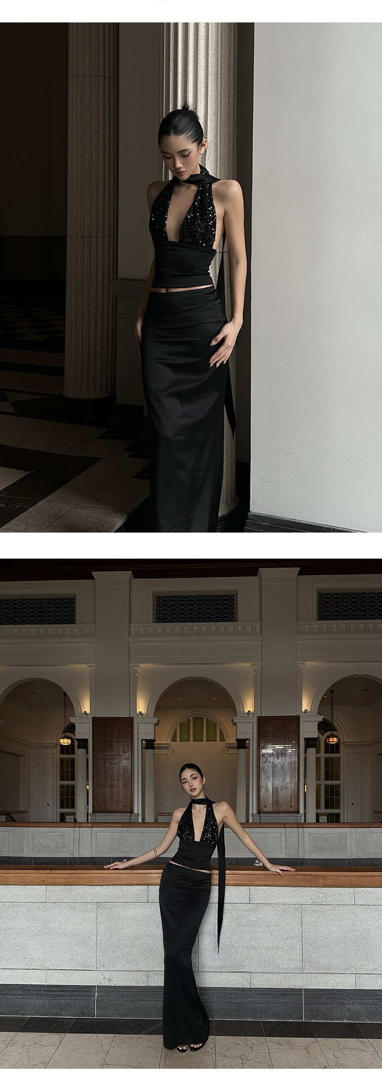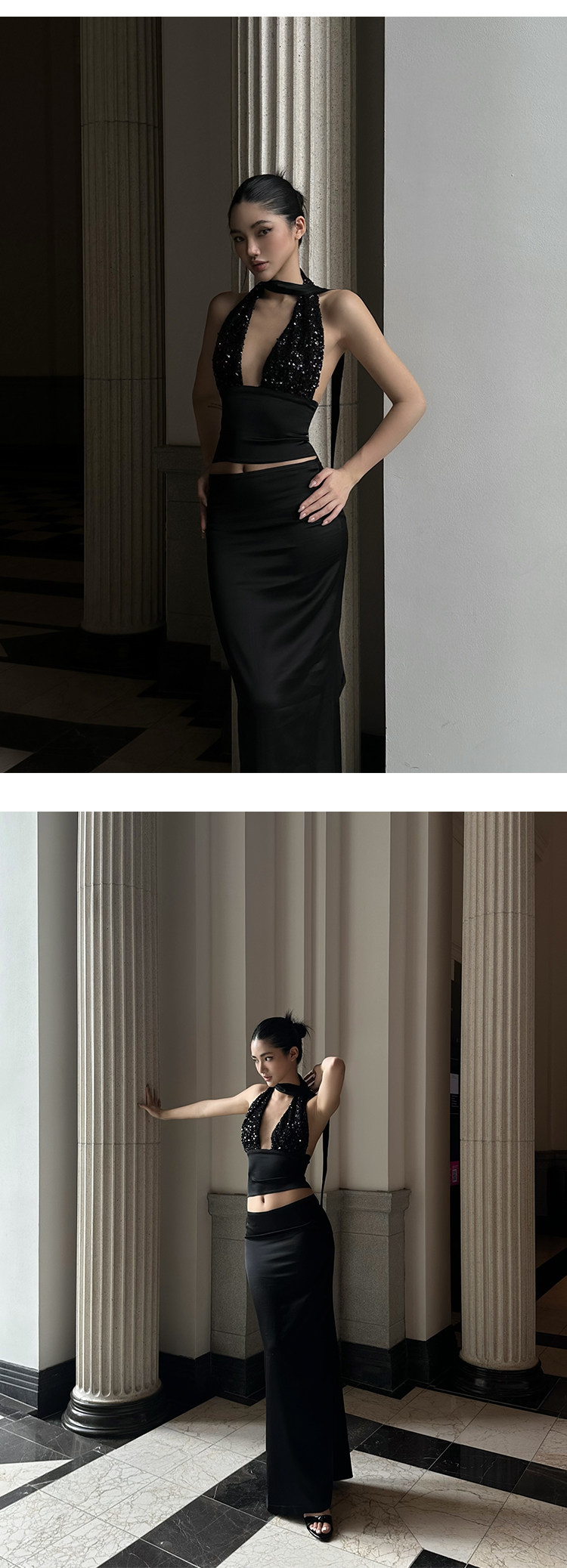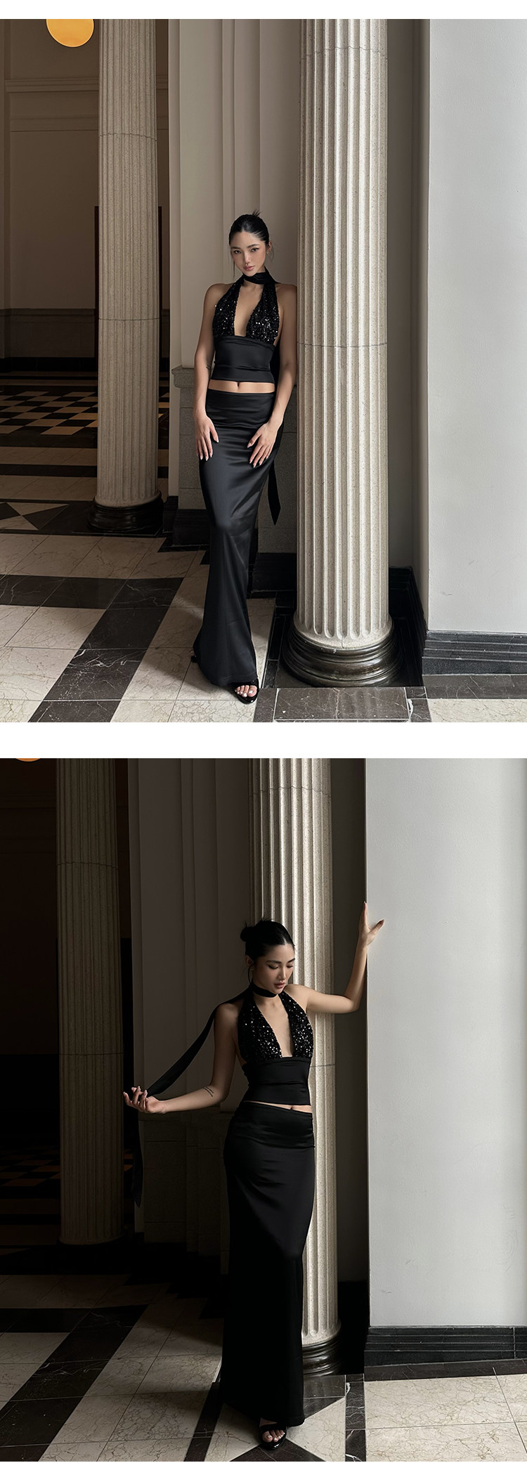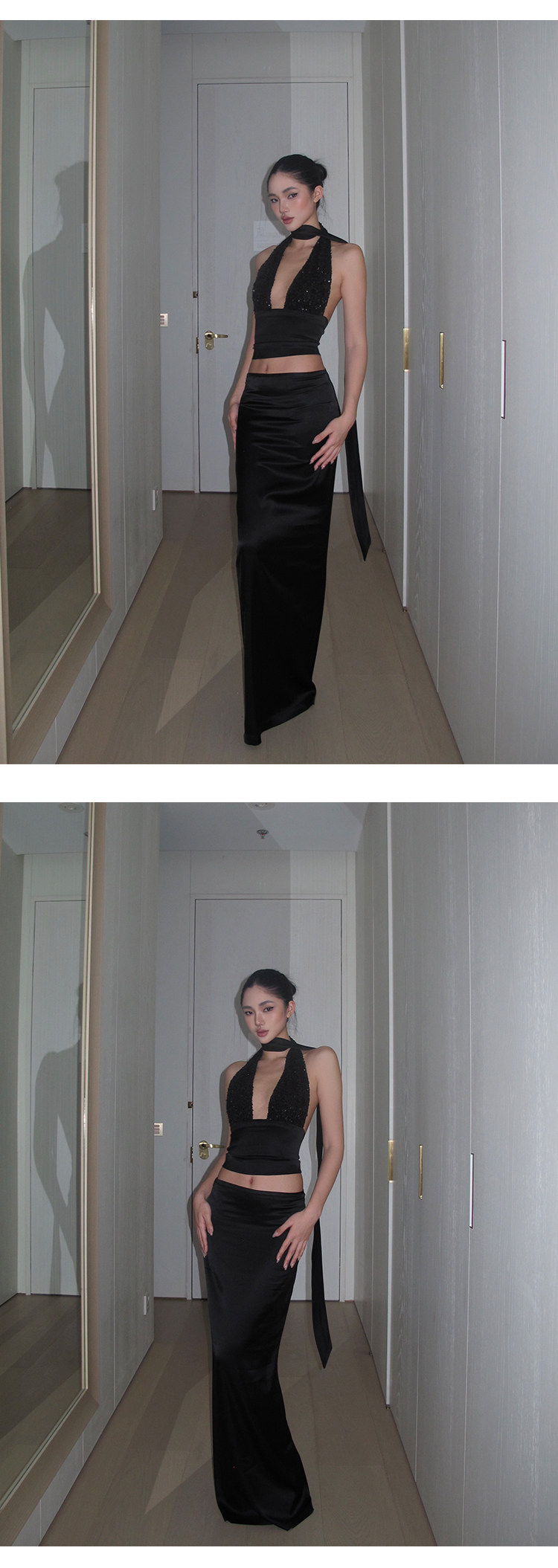 Rovente under the Night Sky High-End Black Satin Skirt Elegant Slim Low-Waist Long Bodycon Skirt
