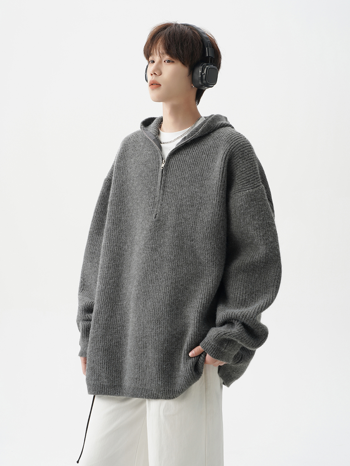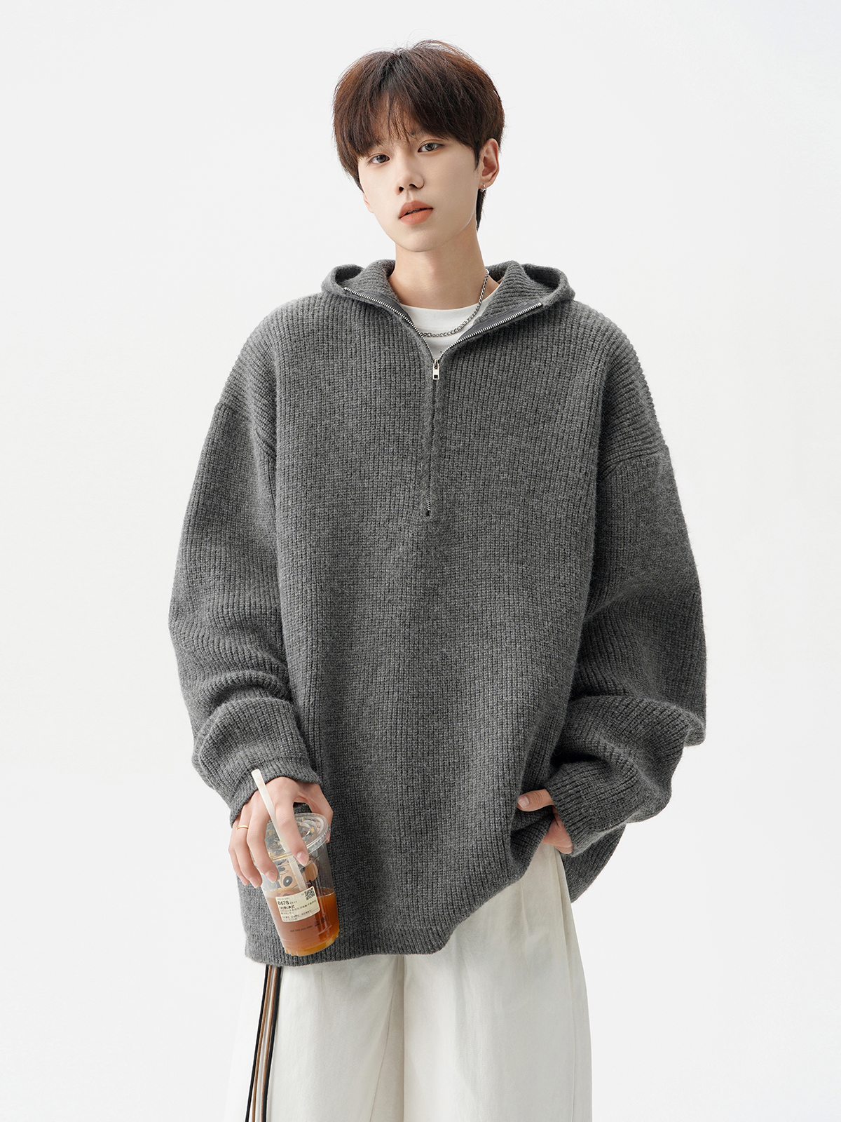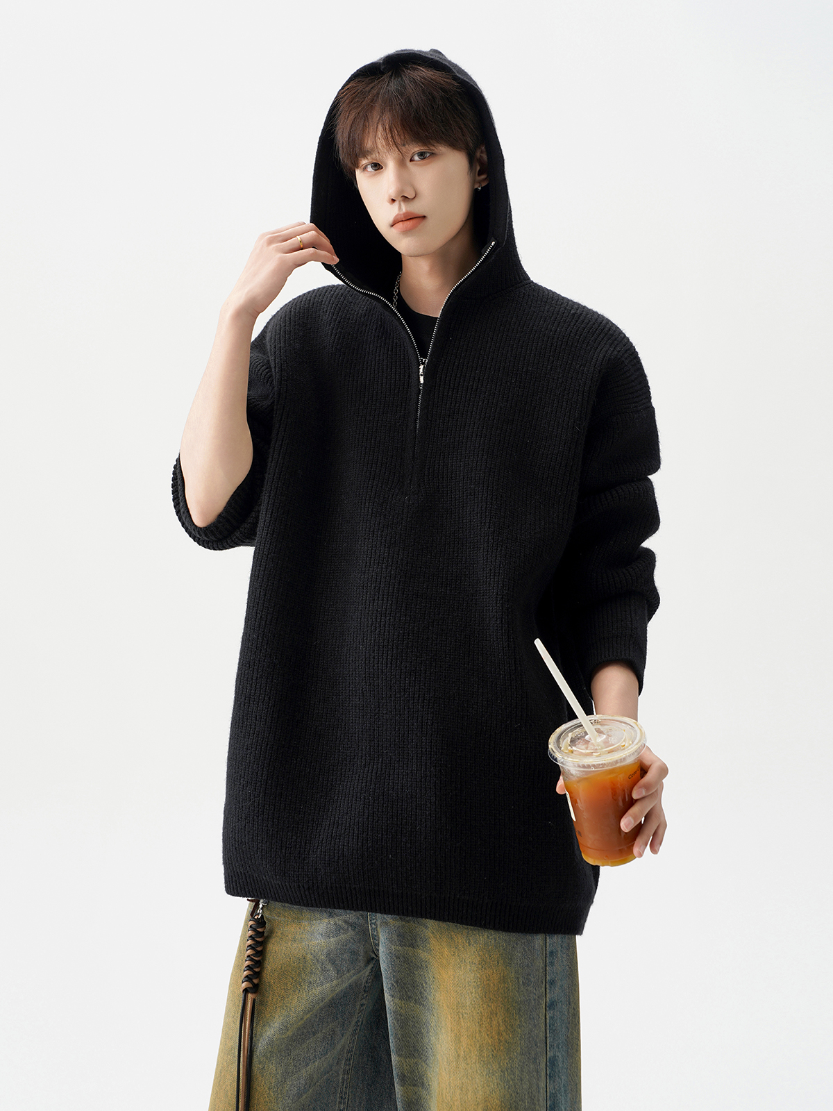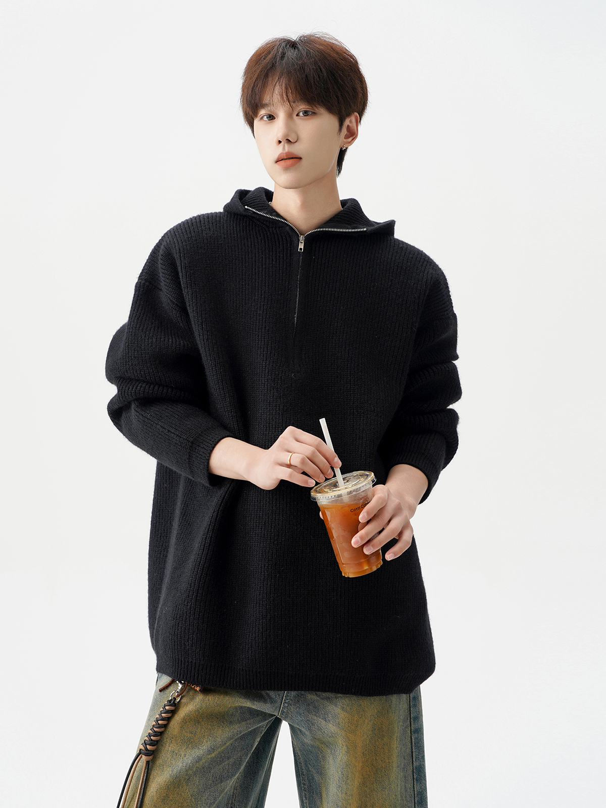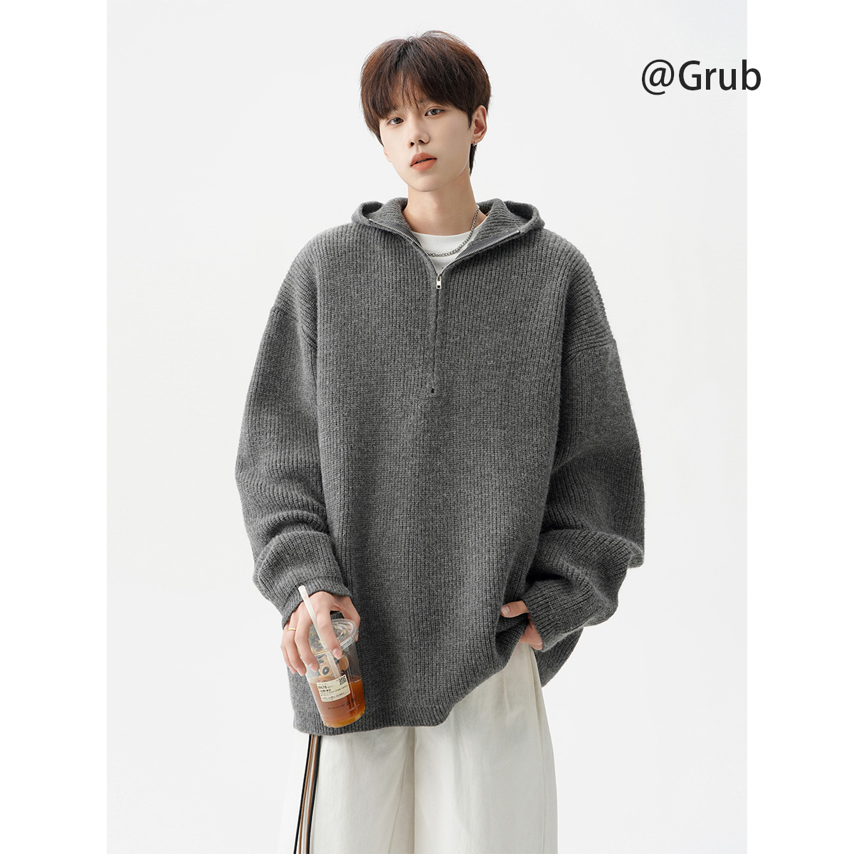 Half-Zip Hooded Knit Sweater for Men, Winter Trendy Brand, Loose Fit, Cleanfit Sweater, Casual High-End Couple's Jacket