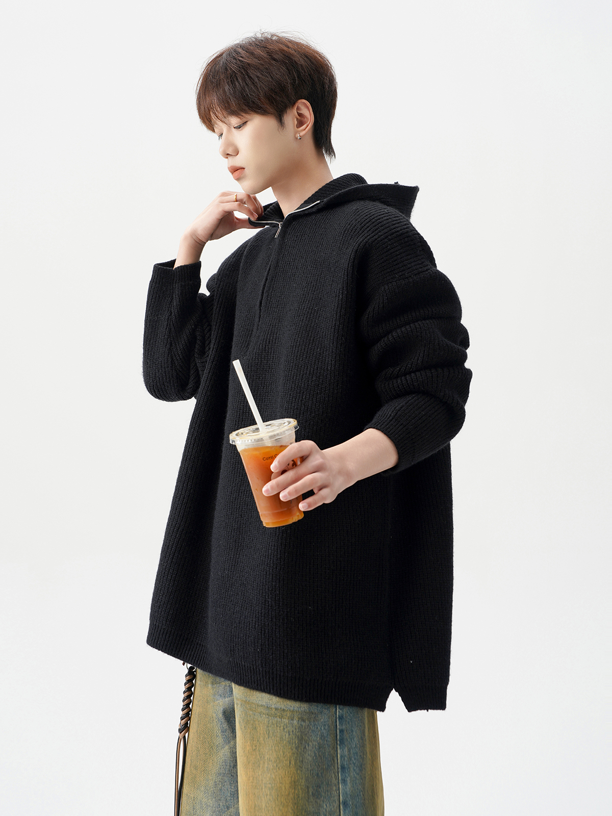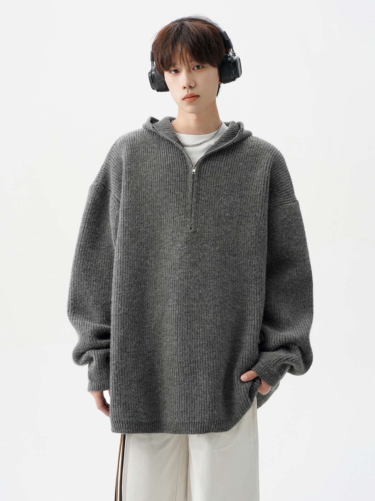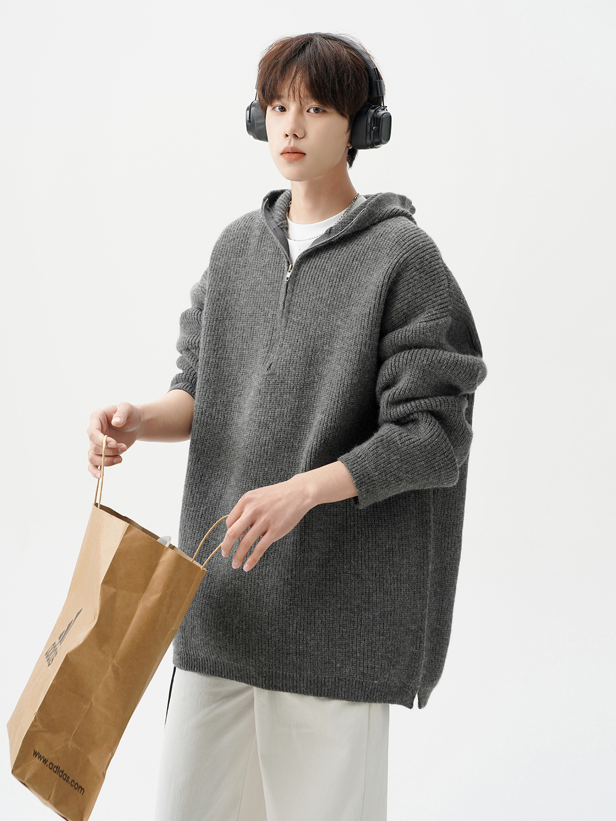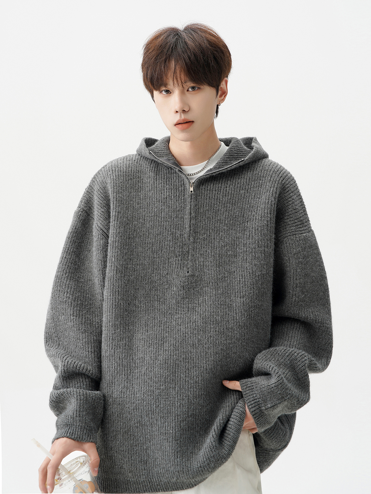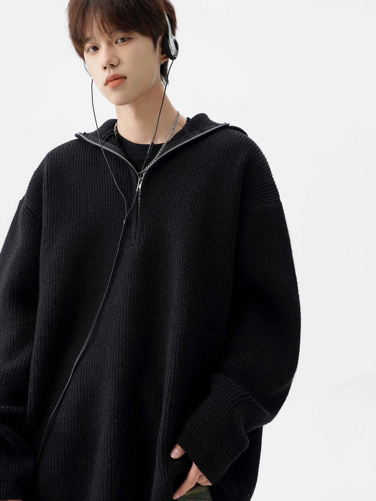 Half-Zip Hooded Knit Sweater for Men, Winter Trendy Brand, Loose Fit, Cleanfit Sweater, Casual High-End Couple's Jacket