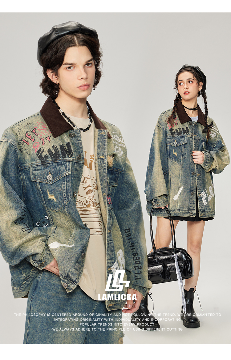 Lamlicka American Retro Graffiti Denim Jacket for Men, Autumn and Winter Lapel Contrasting Color Street Distressed Loose Jacket for Women