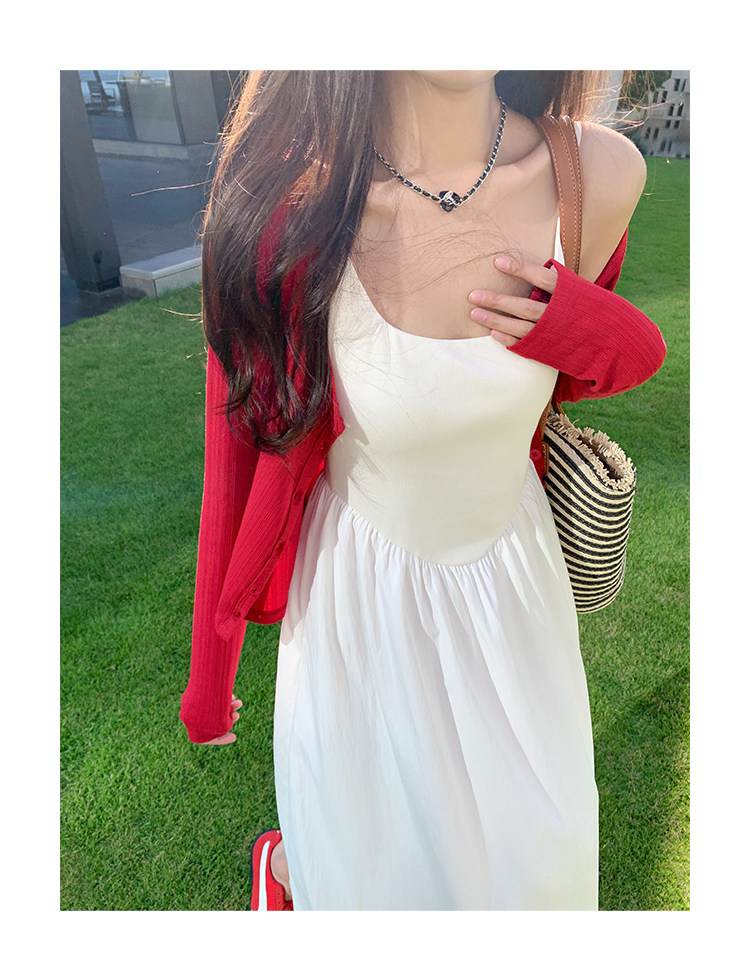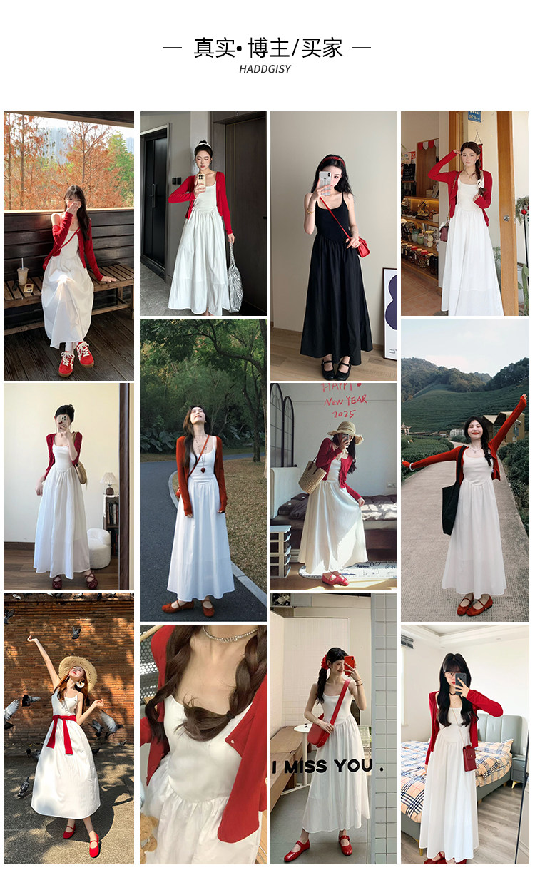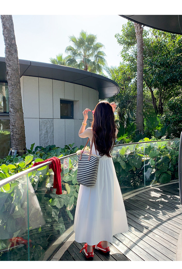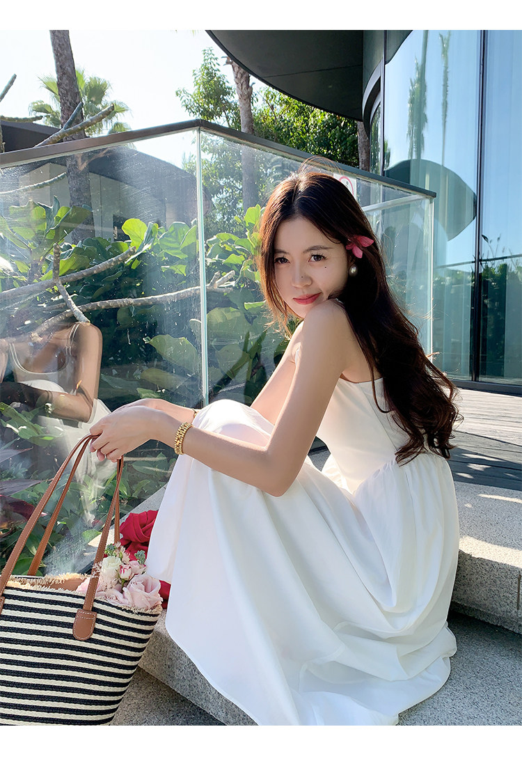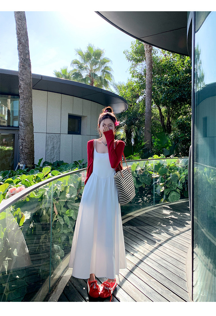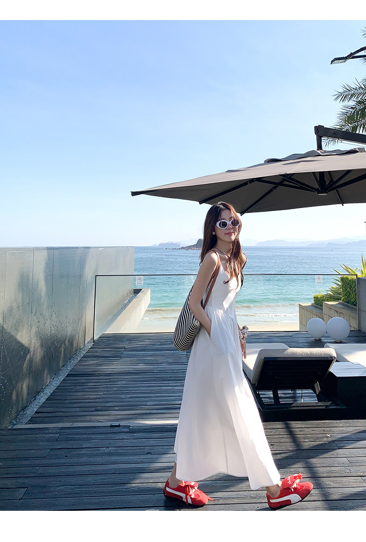 Zeng Xiaoxian High-End White Spaghetti Strap Dress for Women, Summer Beach Vacation Long Dress Set