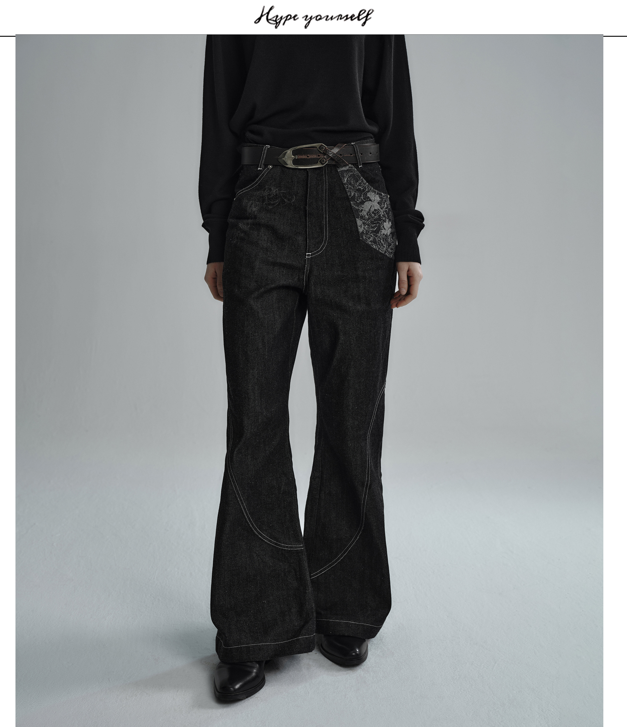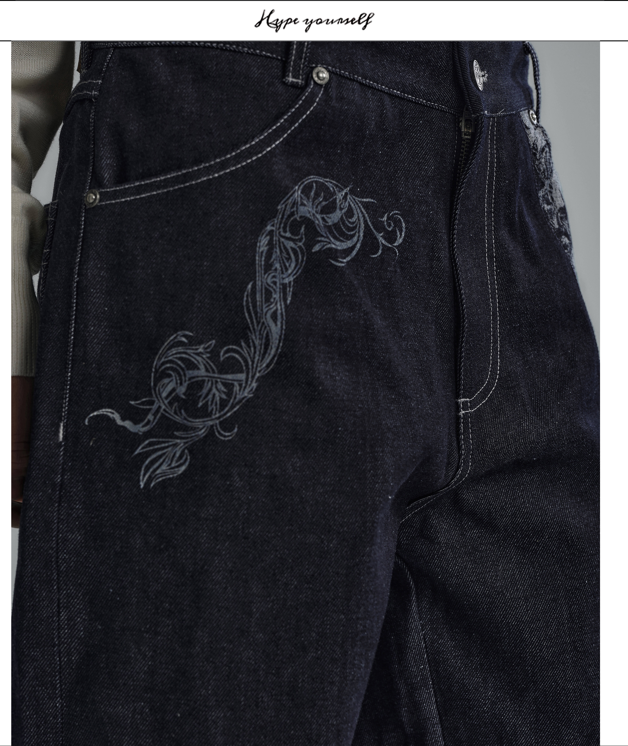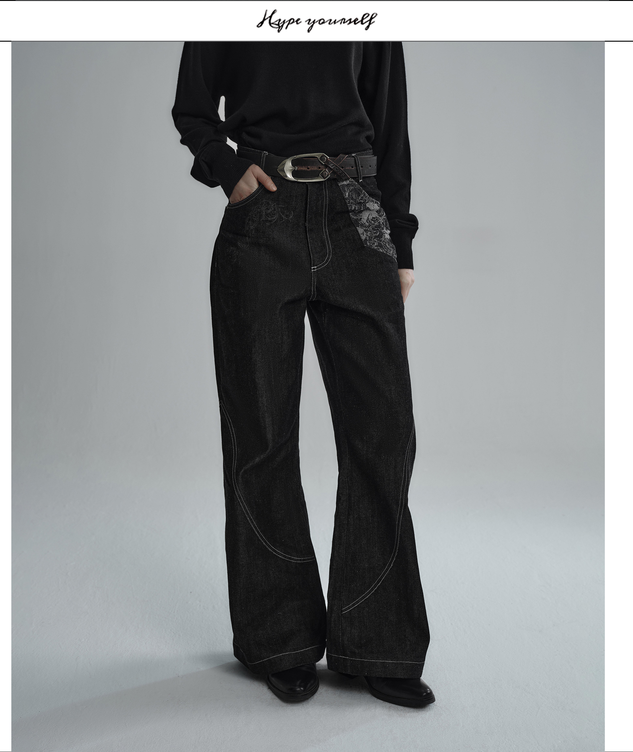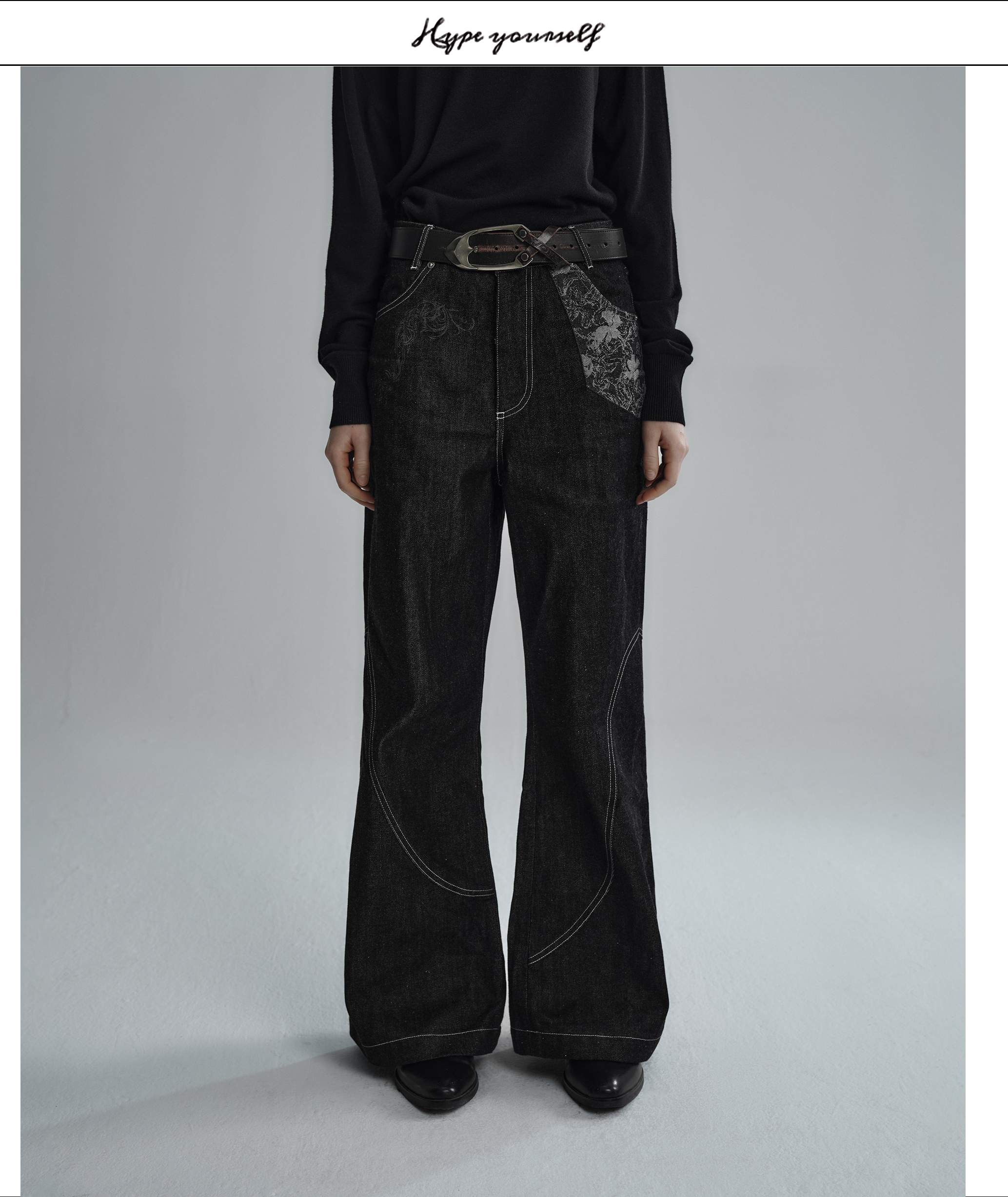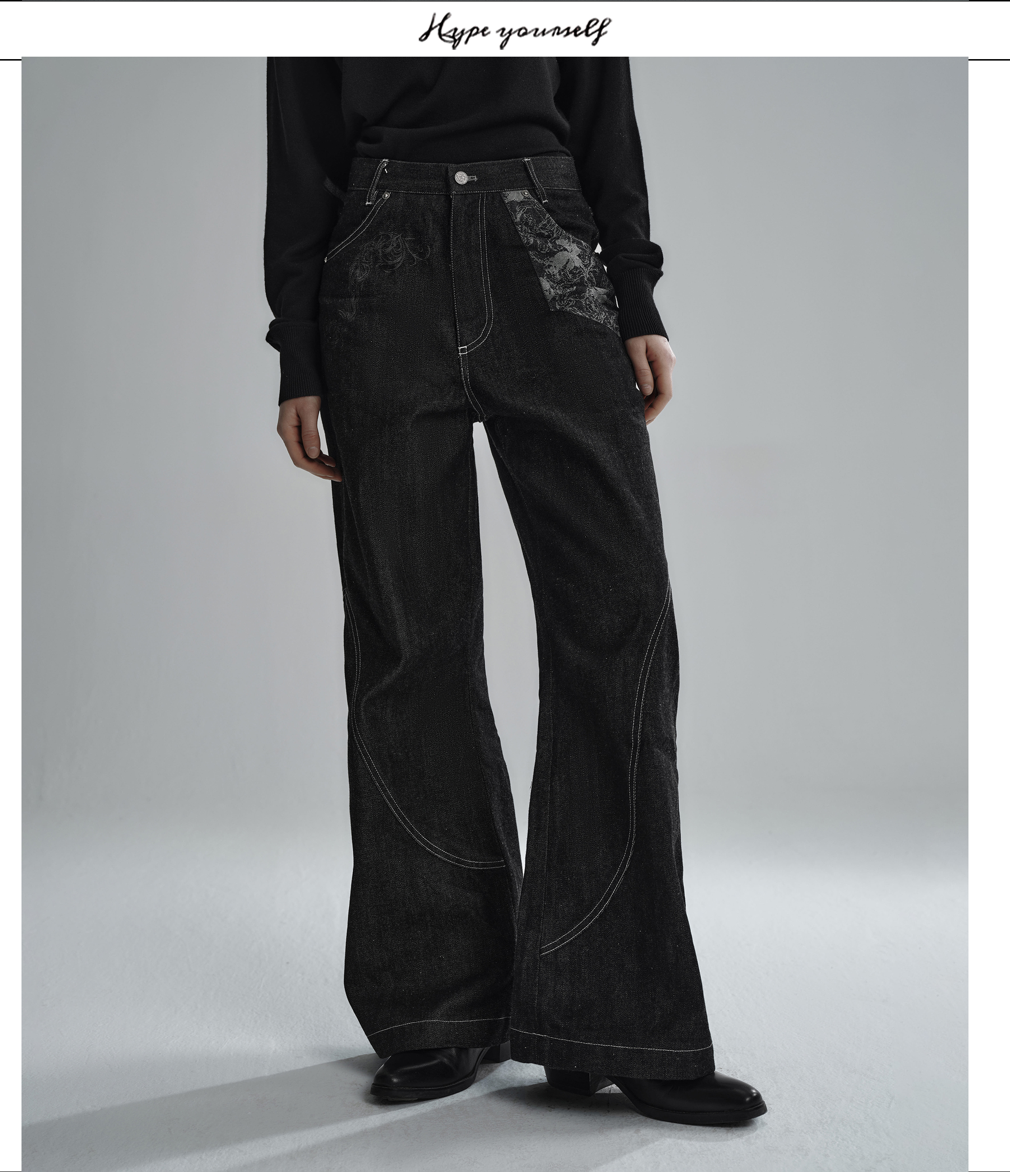 Hypeyourself “Snake Print” Original Wide-Leg Denim Jeans with Narrow Hem, Distressed Floral Jacquard Patchwork, and Slightly Flared Design