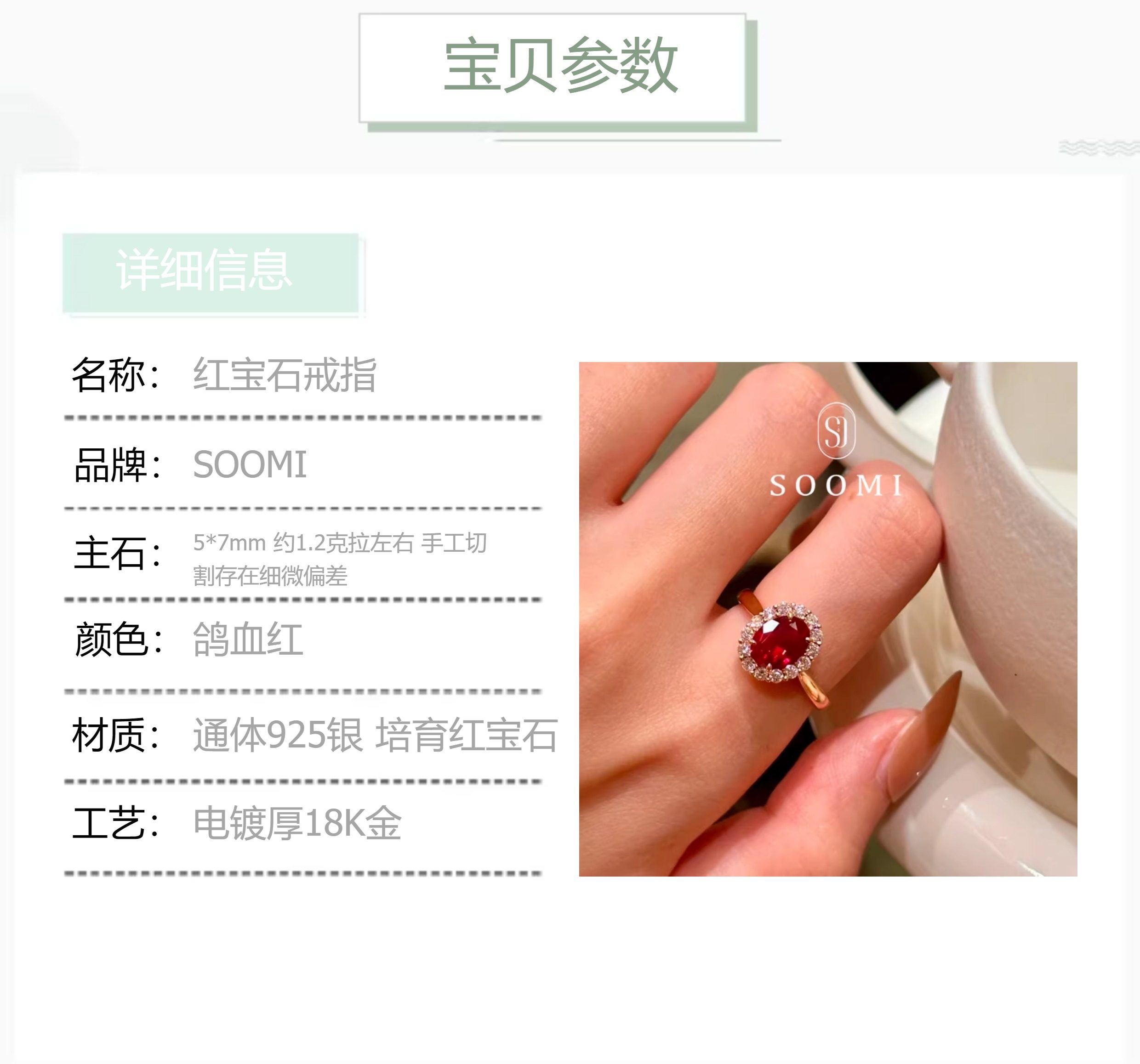【Soomi】Red Ruby Ring 1.2Ct Cultivated Gemstone Burmese Pigeon Blood Red Princess Diana Silver Setting Women's Ring