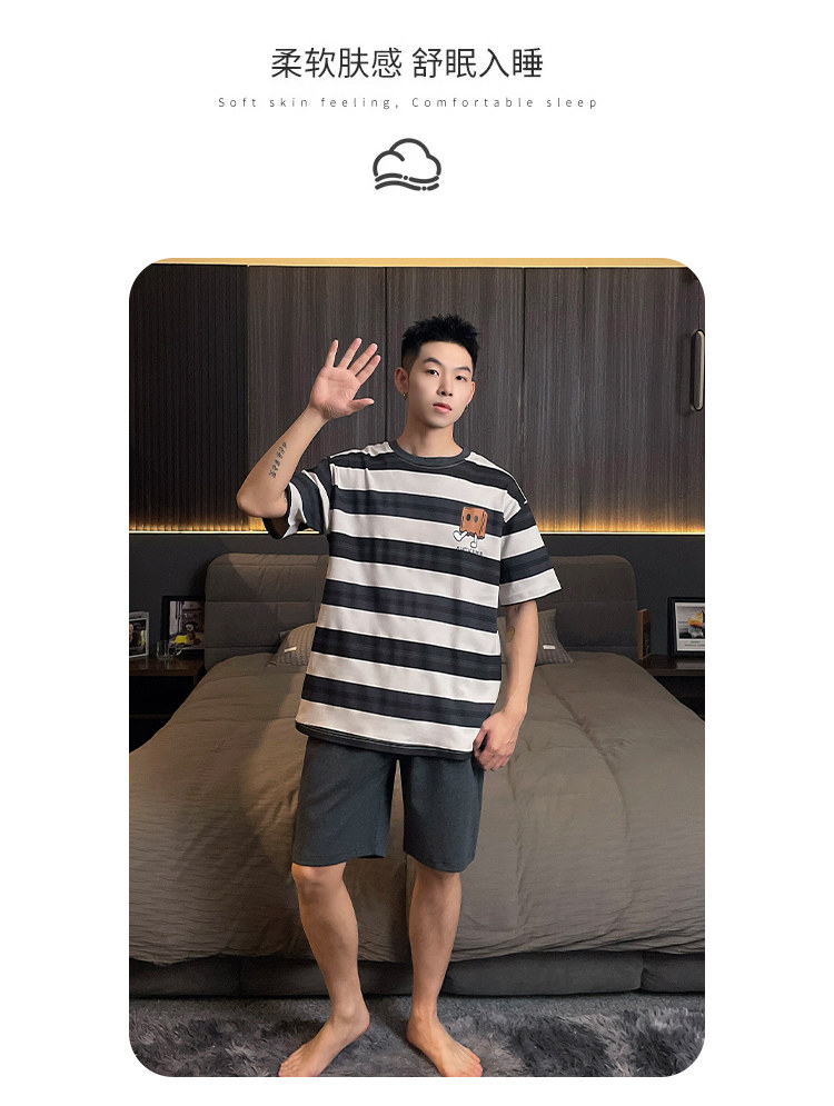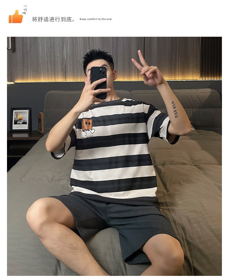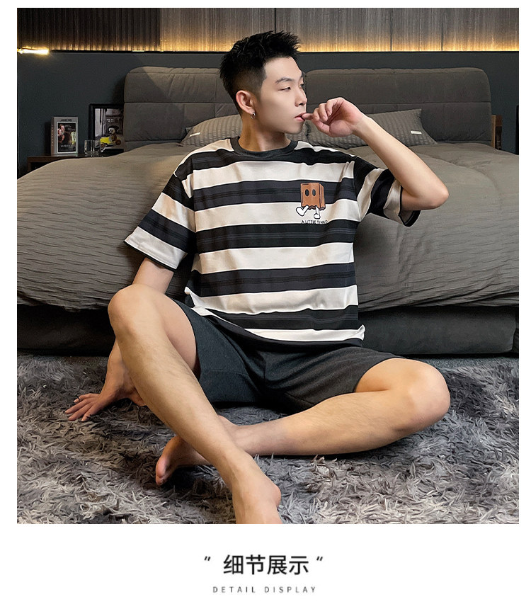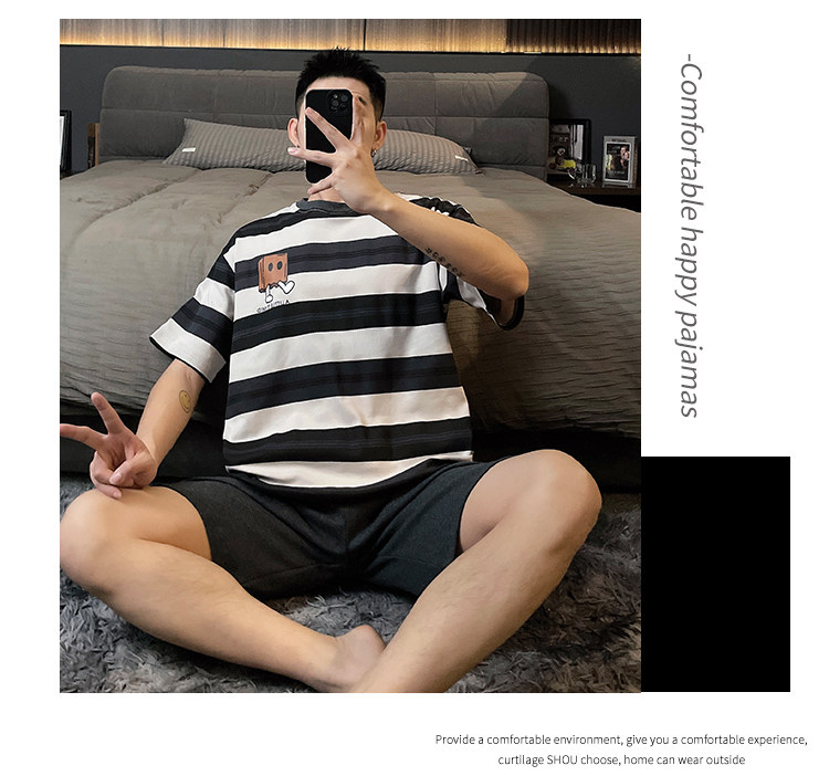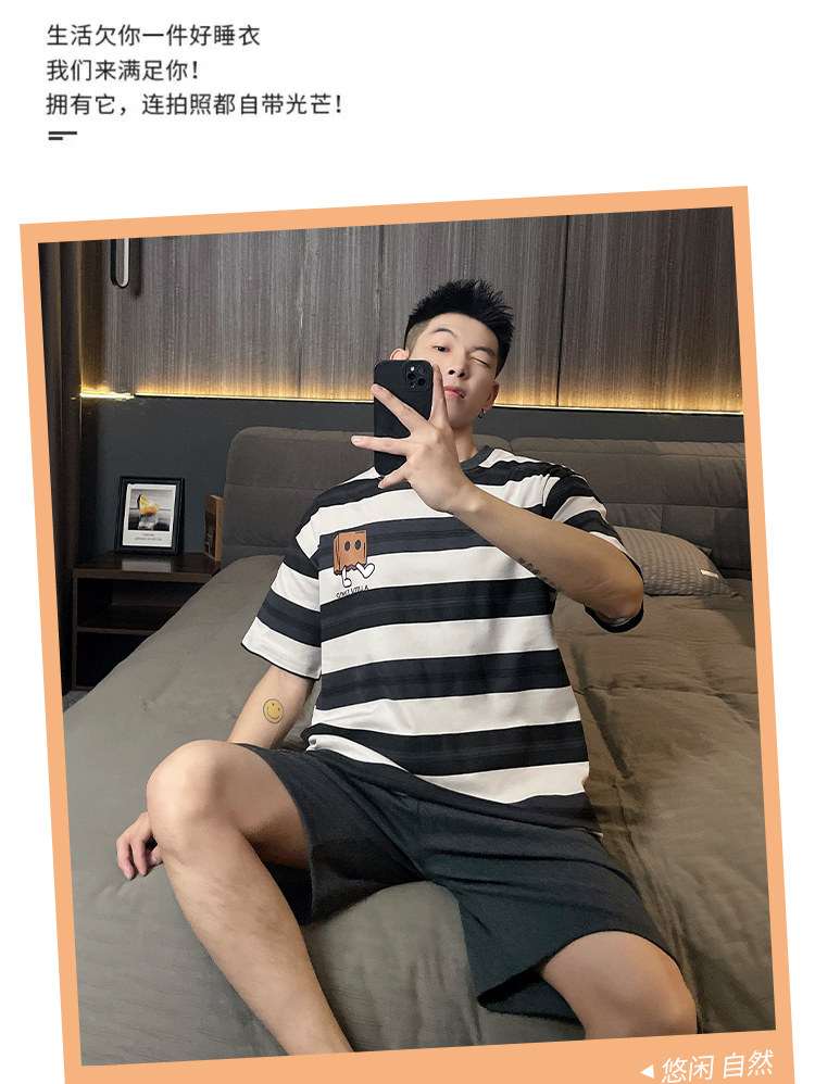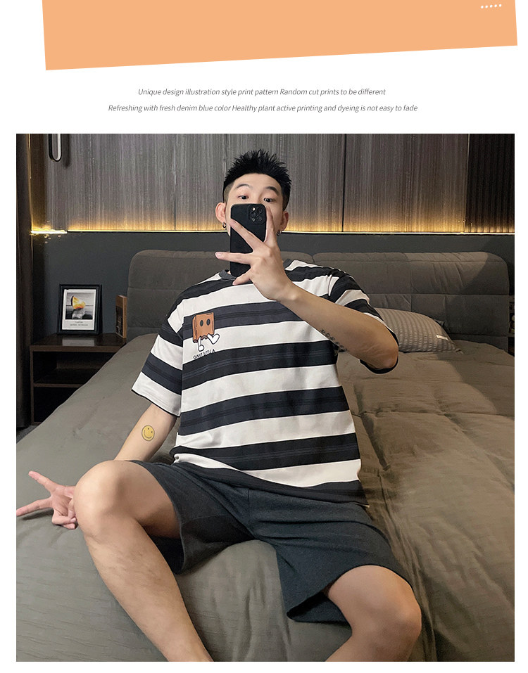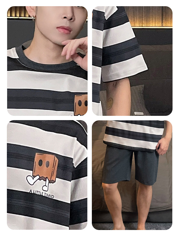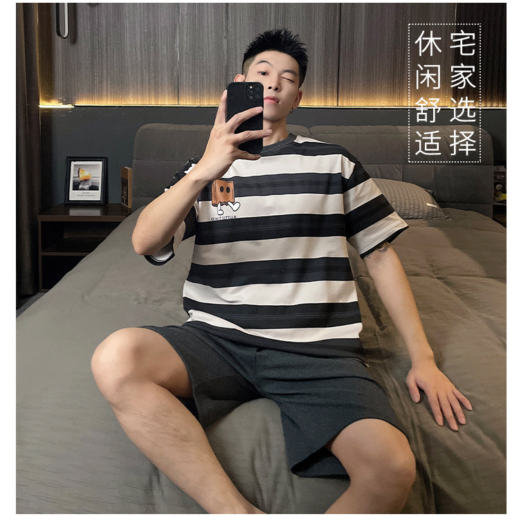 Summer New Men's Pajamas, Large Size, Can Be Worn Outside, Striped Cartoon Short-Sleeved Shorts, Loose Casual Home Wear Set