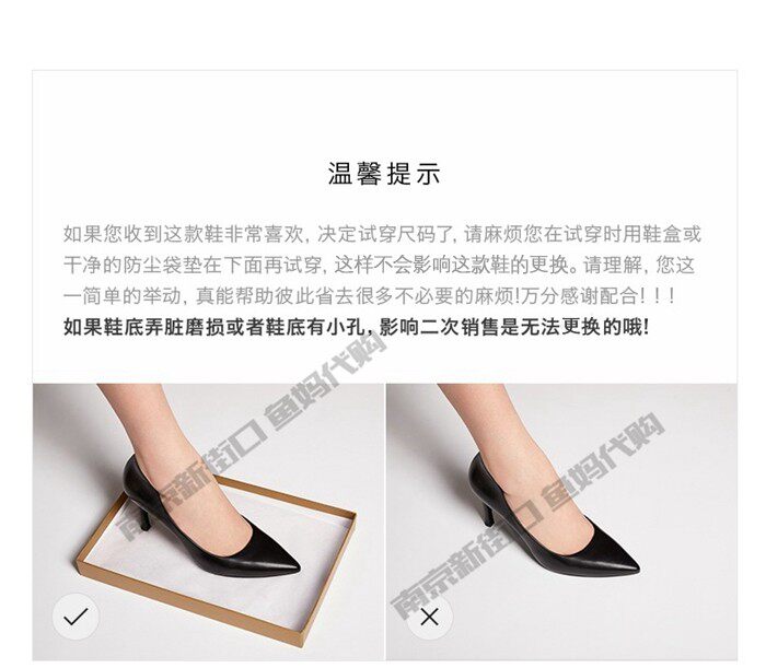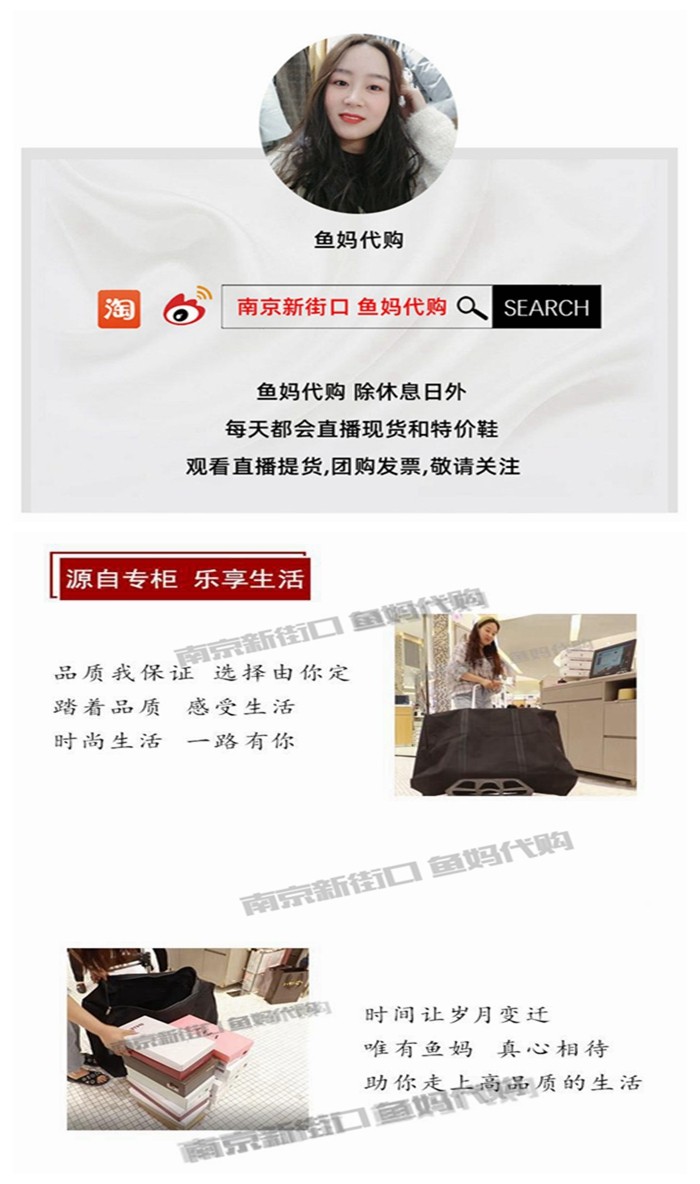 1.本店所有货品主要出自南京各大商场专柜,支持全国任何形式的验货,假一罚十。南京的亲们有时间的话可以选择在商场当面交易的,电话或者微信联系都可以。本店代购的鞋子均为全新第一次出售,由于鞋子都是半手工的,生产过程中如有少许胶印是难以避免的,专柜的鞋子避免不了被个别顾客试穿,如有少许皮纹褶皱属于正常现象,介意的MM慎拍。