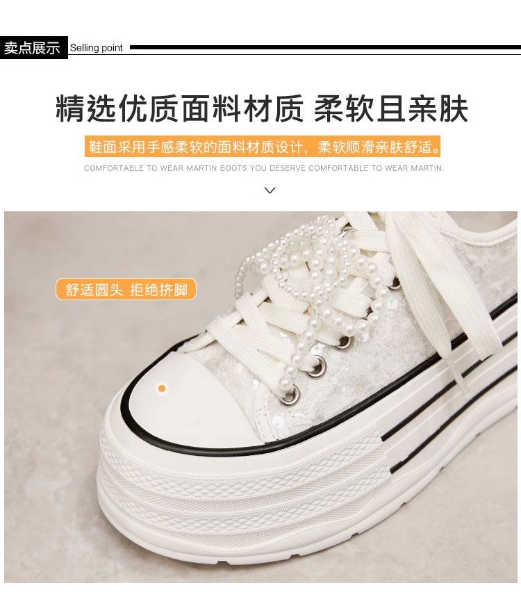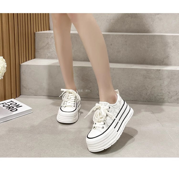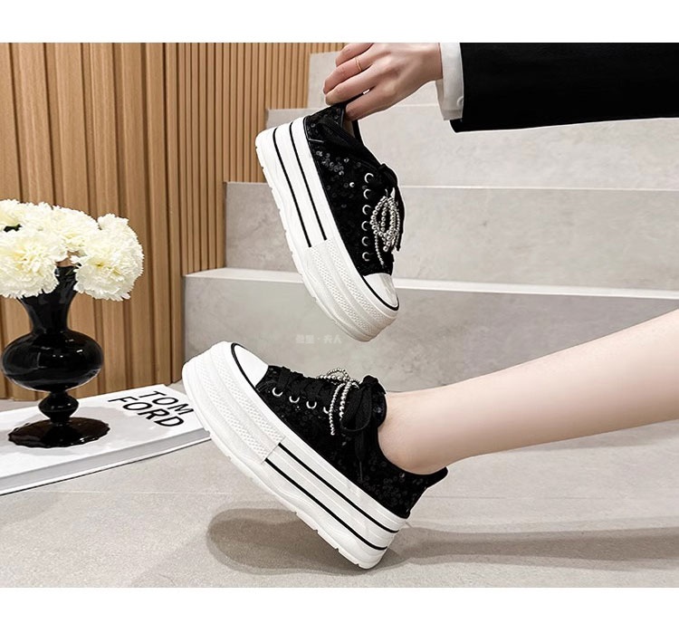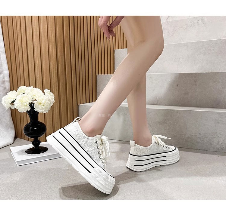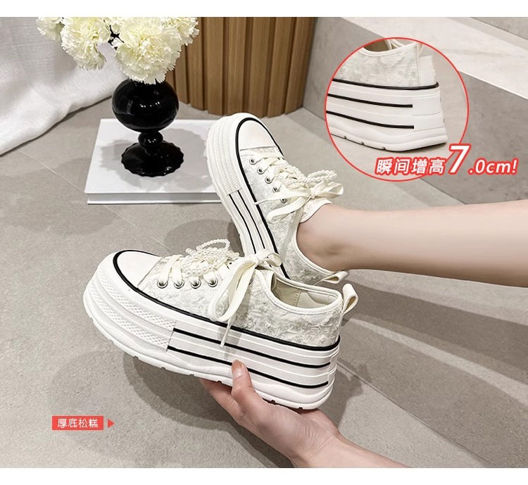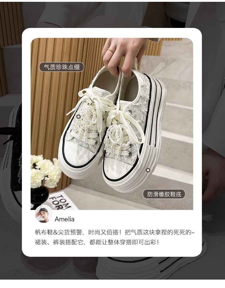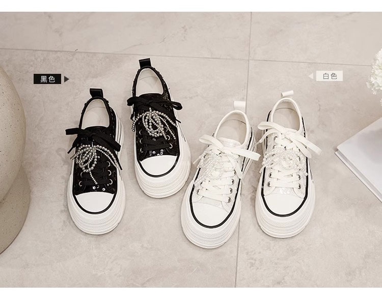 Sanli Small-Sized Thick-Soled Height-Increasing Canvas Shoes for Women, 2025 Spring and Summer New Style, Pearl Lace-Up Round-Toe Casual Sneakers, Trendy