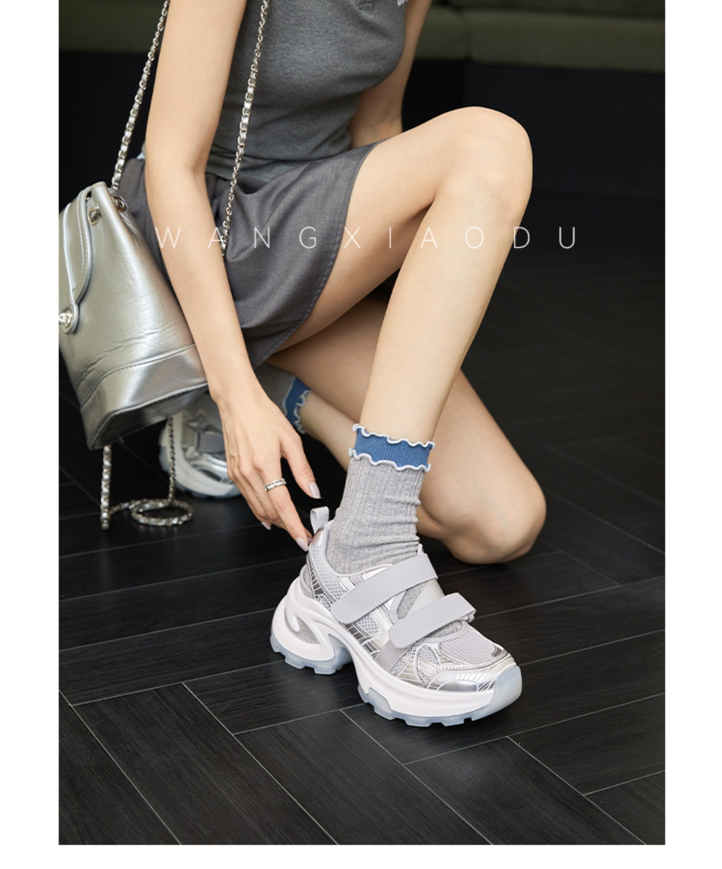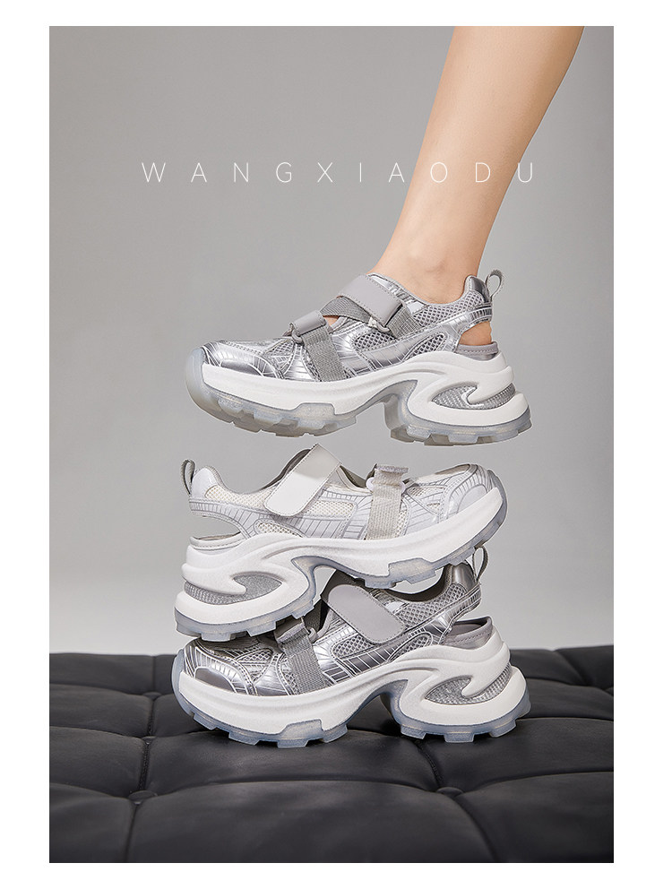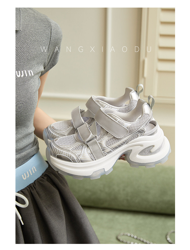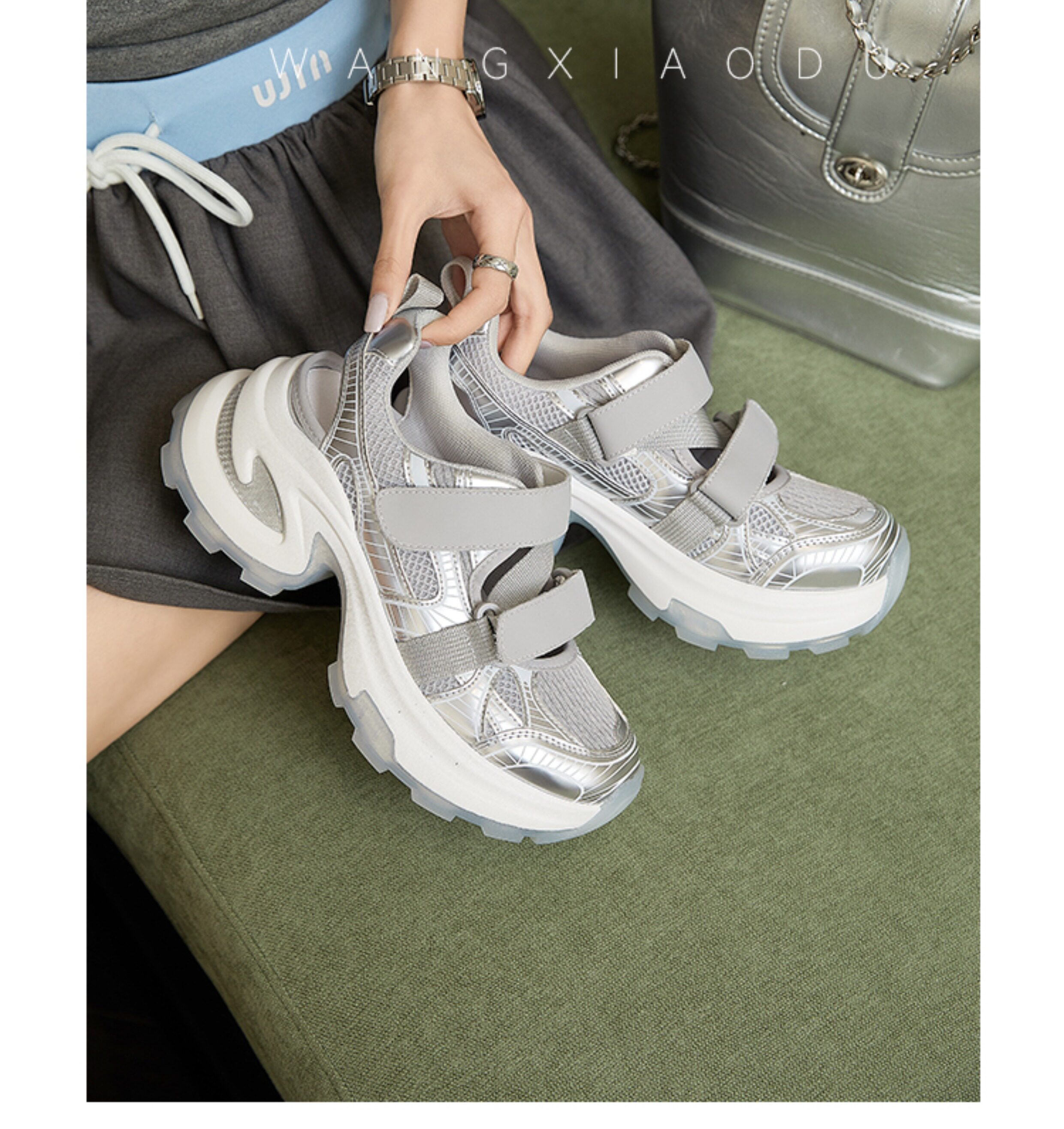 【Wang Xiaodu】At the Crossroads of Haijie Alley ○ 7.5cm Taller ~ Velcro Sports Sandals for Women, Silver Breathable Casual Shoes