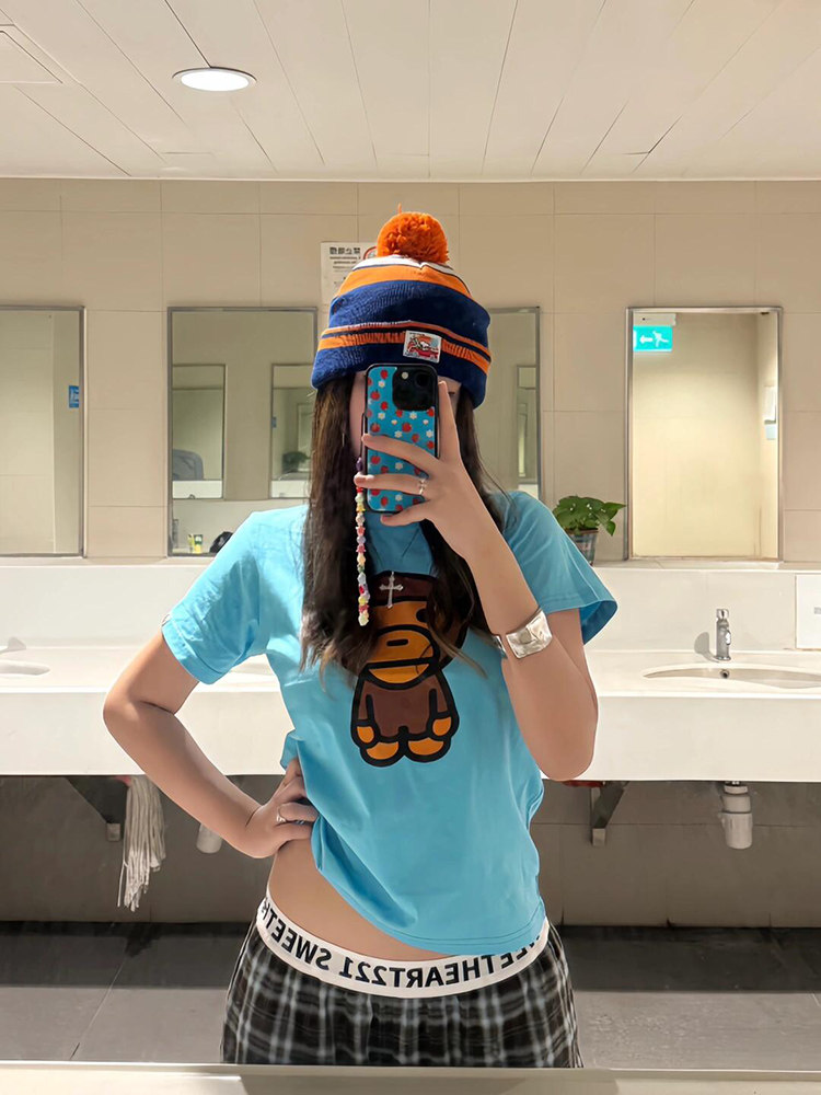 American-Style Cartoon Monkey Short-Sleeved T-Shirt for Women, Summer Pure Cotton, Slim Fit, Super Cute Short Top