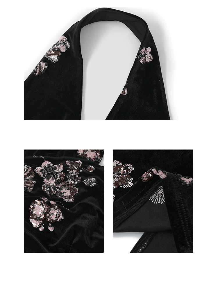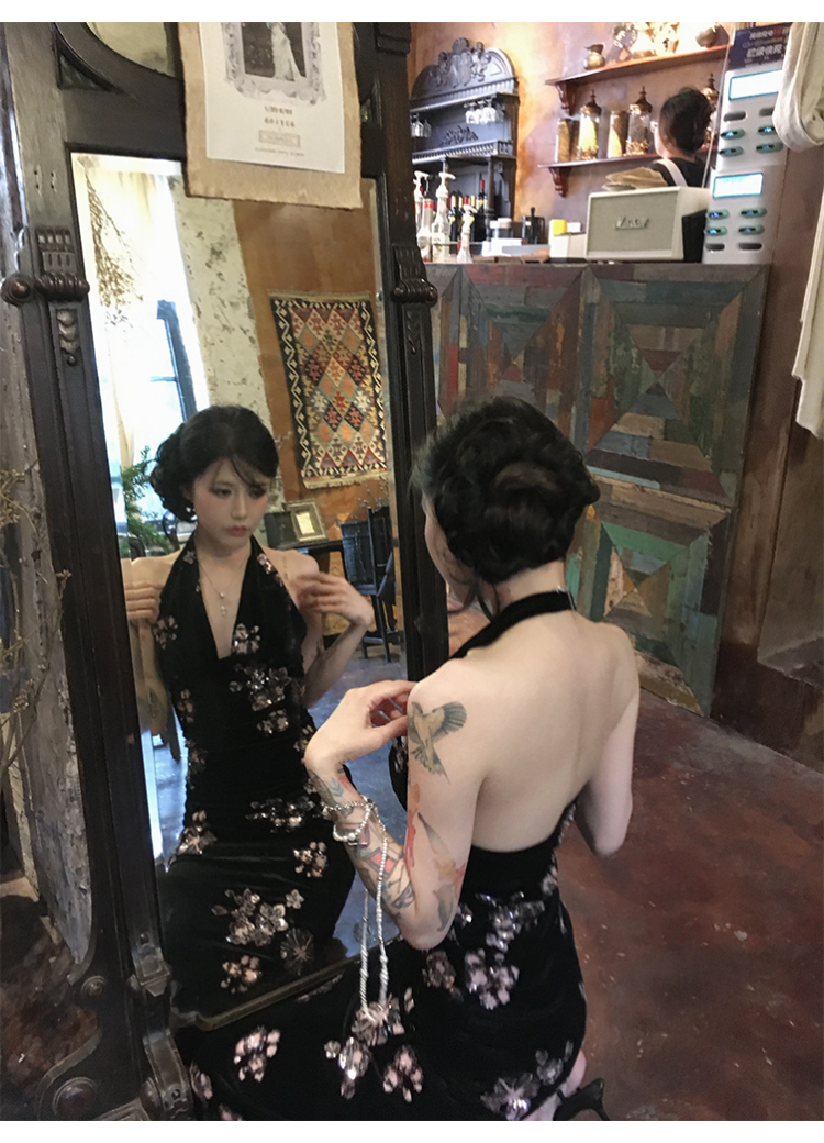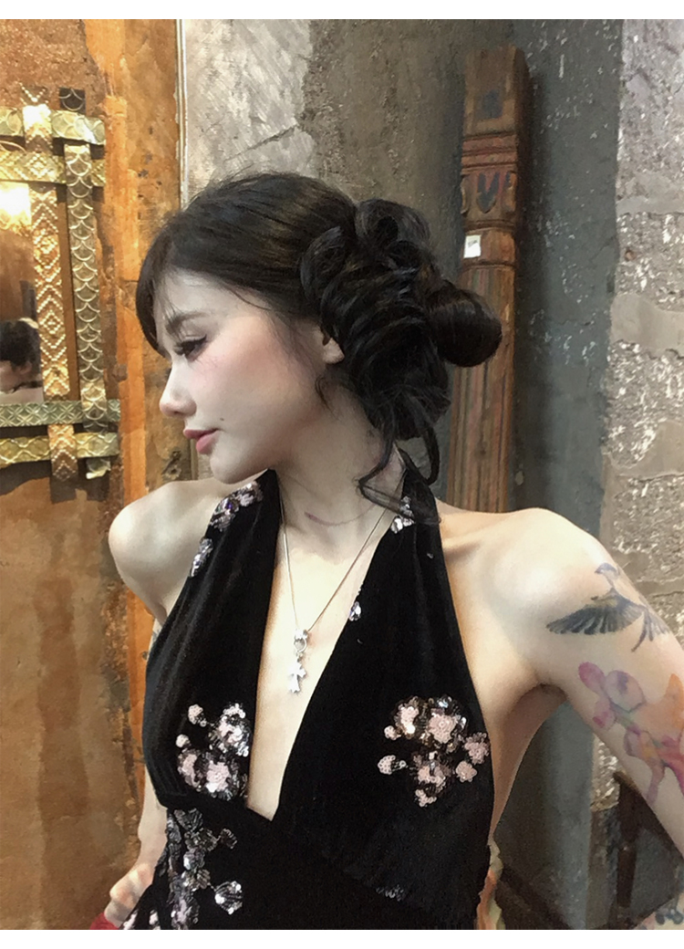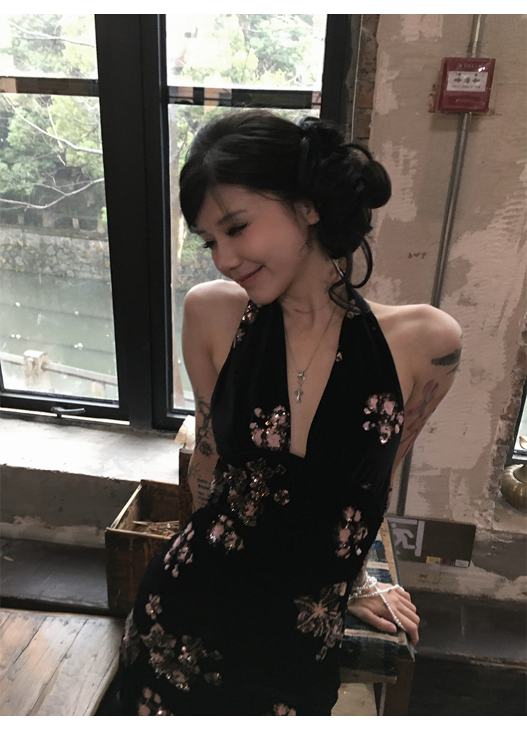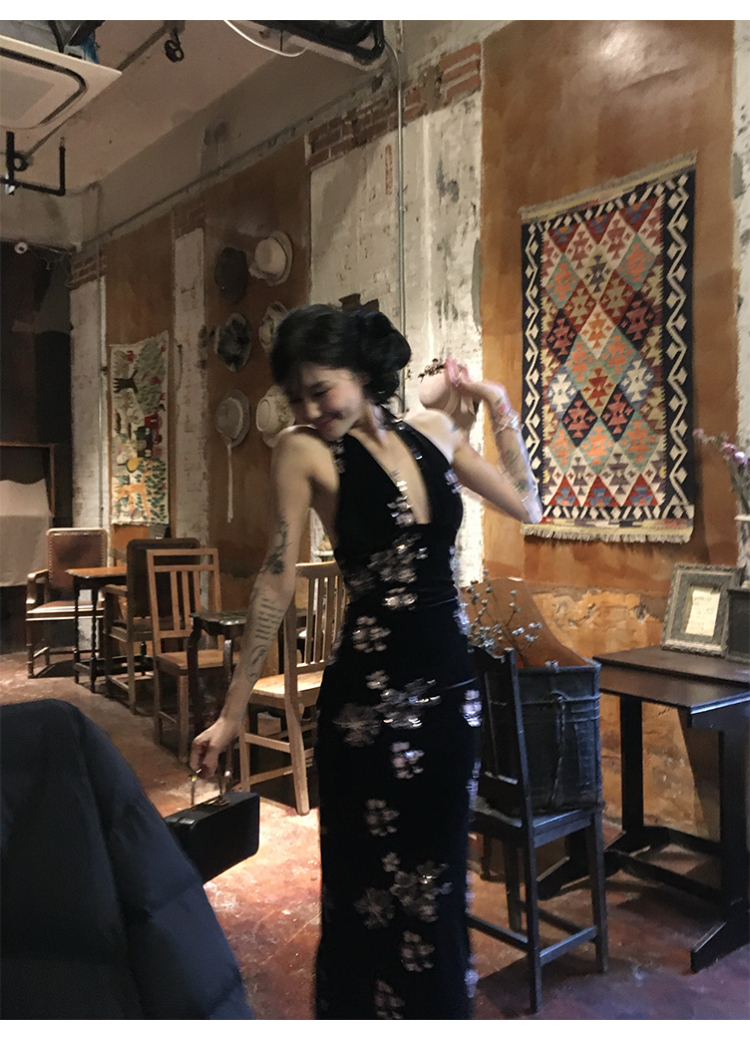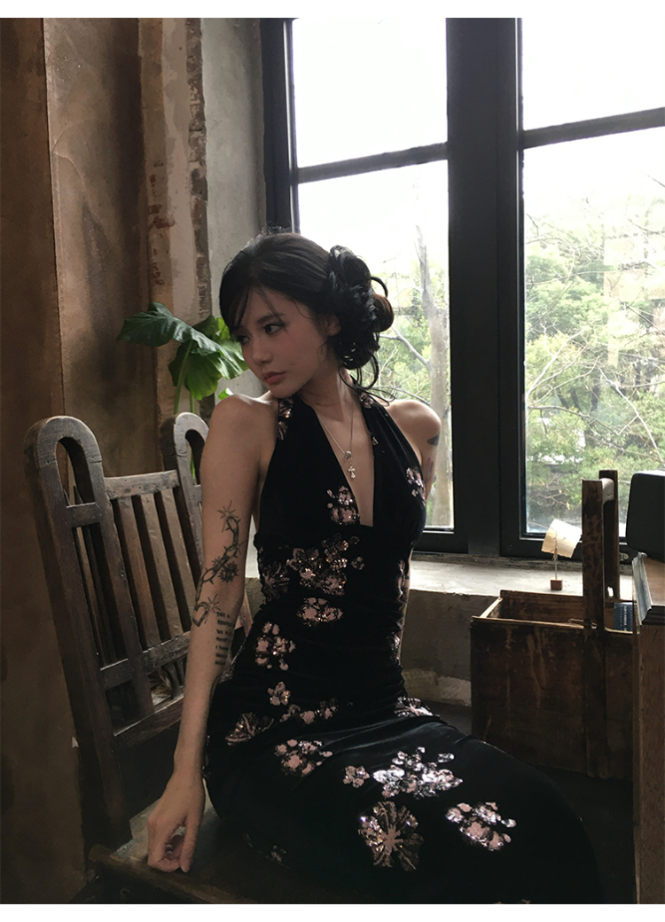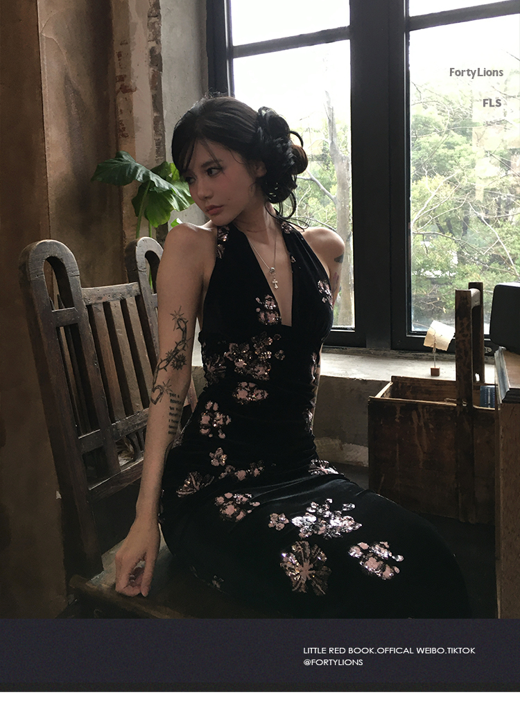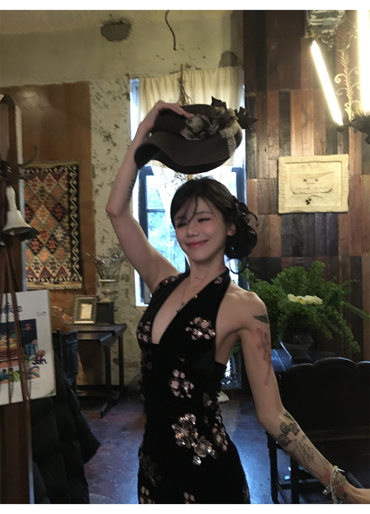 Fortylions French-Style Elegant Dress, Feminine Waist-Cinching Black Halter Neck Slip Dress, Velvet Long Dress