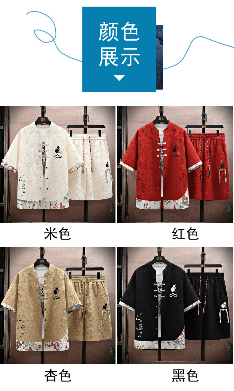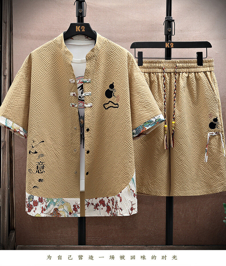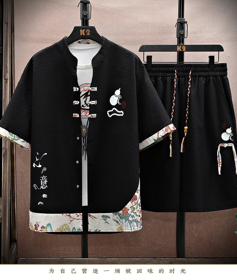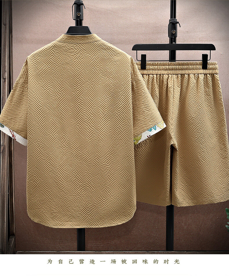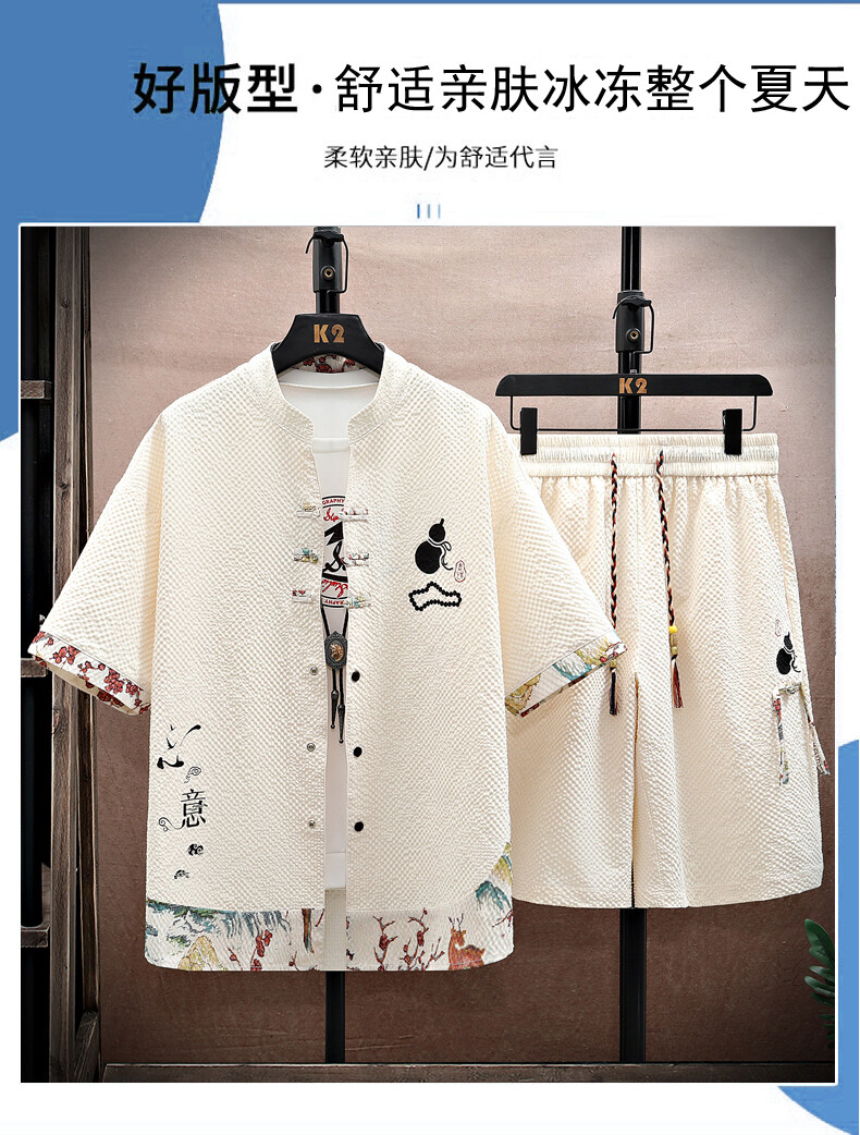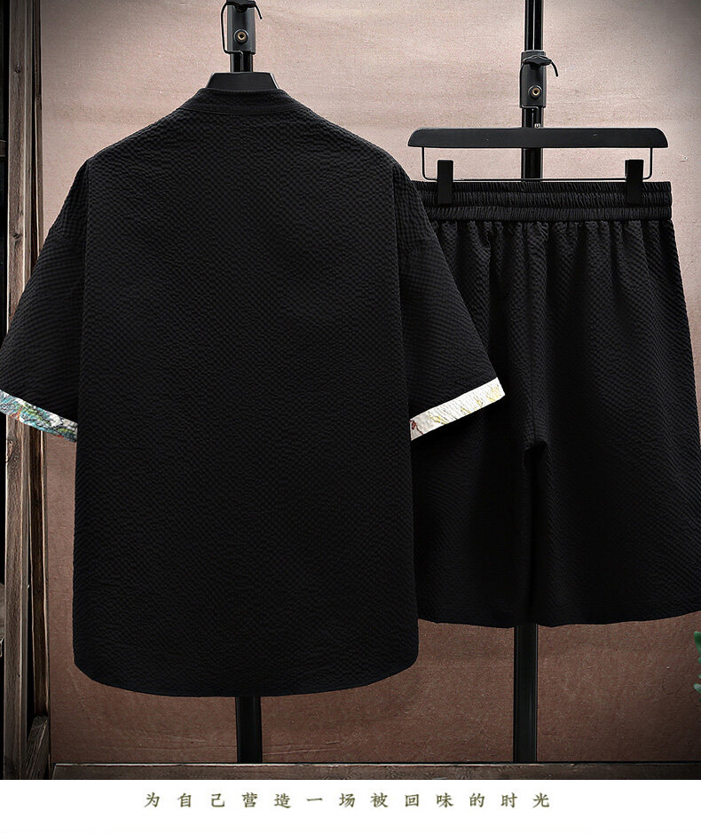 Chinese Style Short-Sleeved Suit for Men, Summer Thin Shirt and Shorts Two-Piece Set, Loose Casual National Trend Hanfu Tang Suit