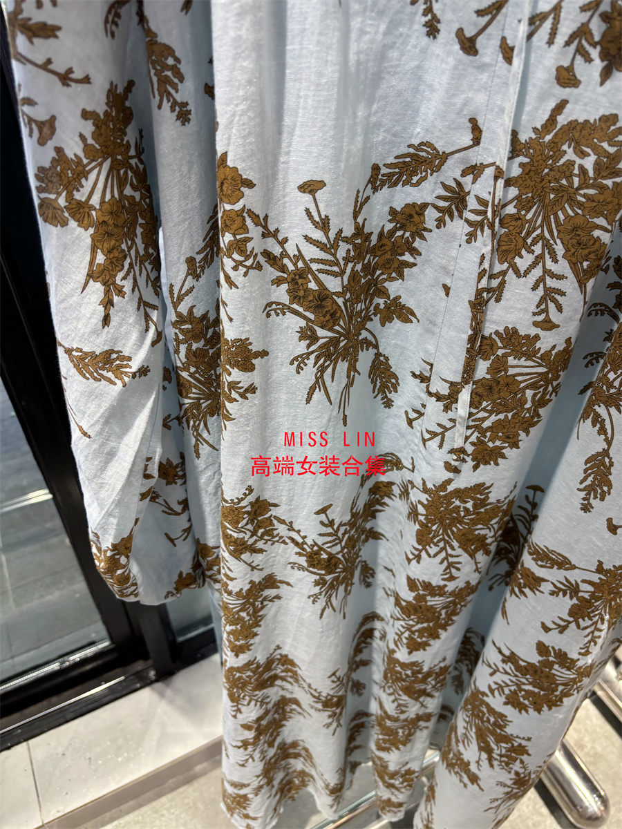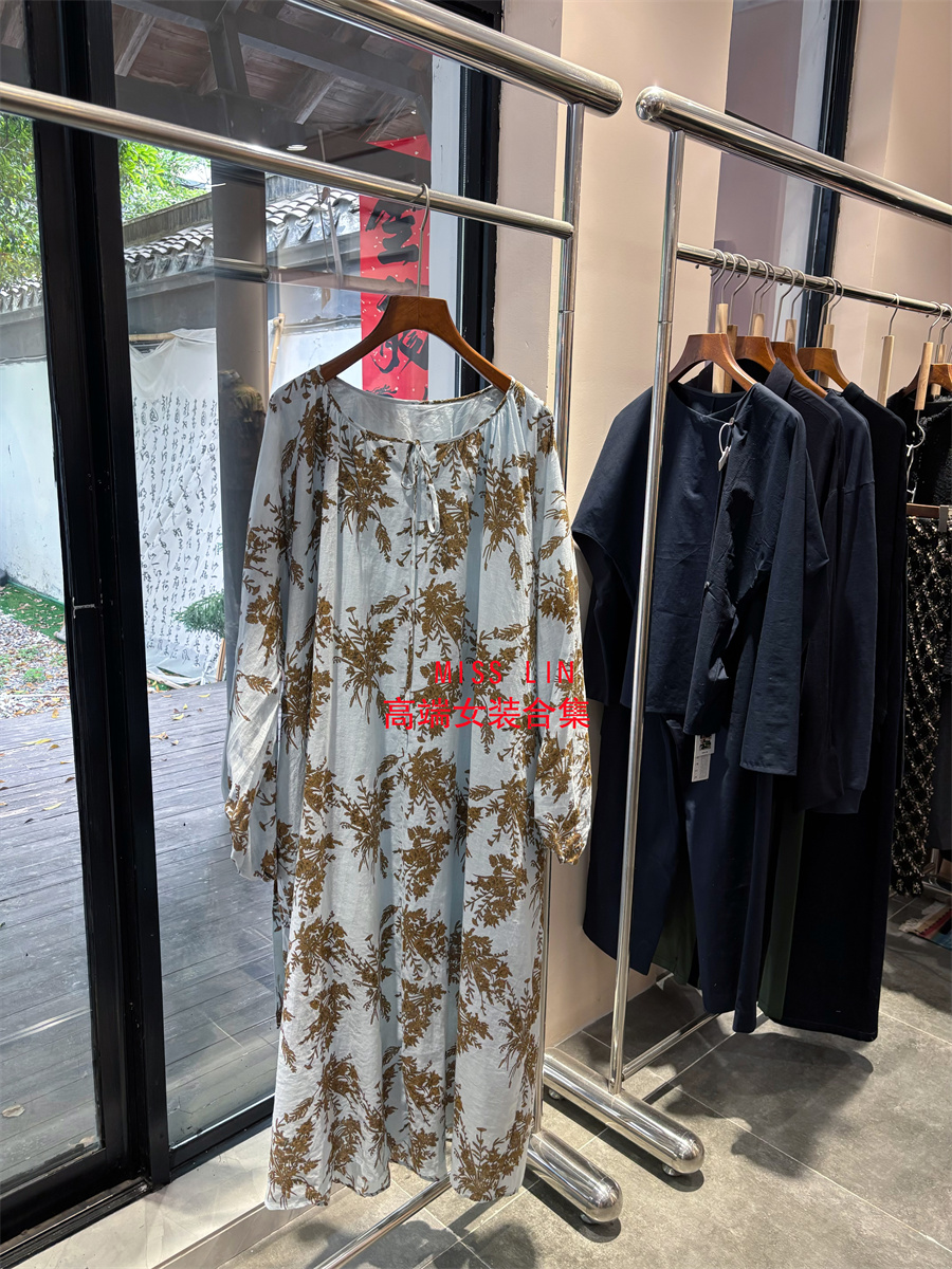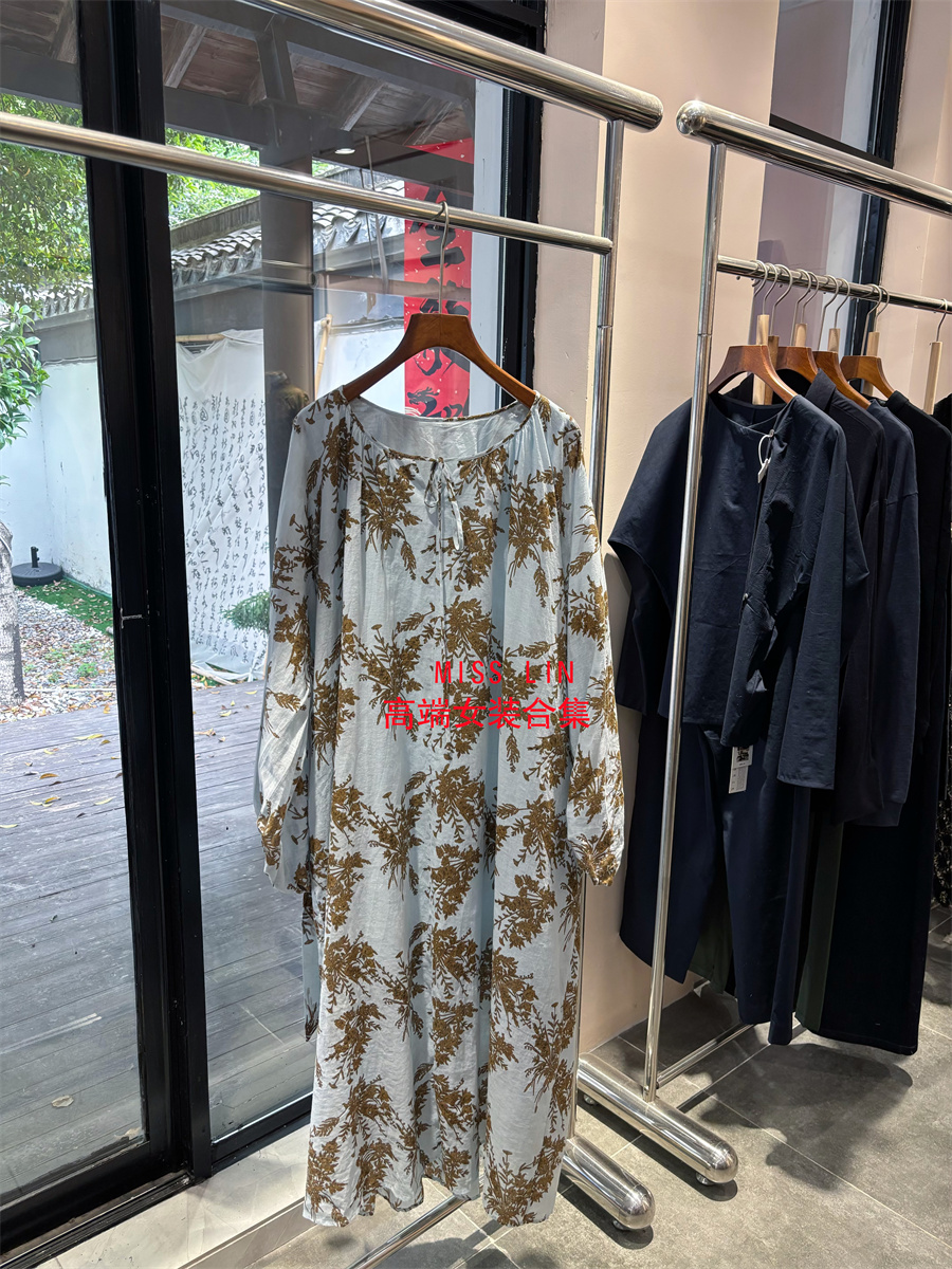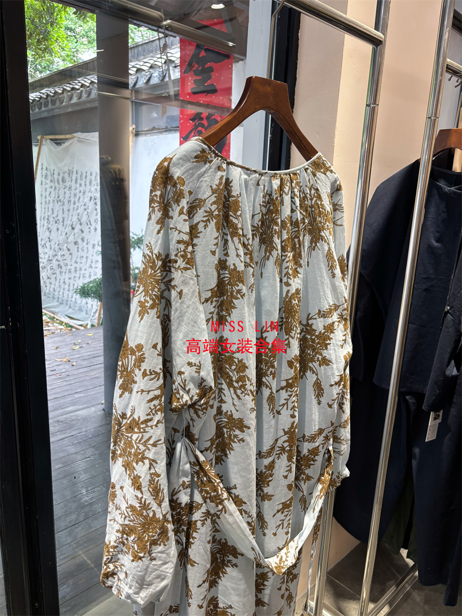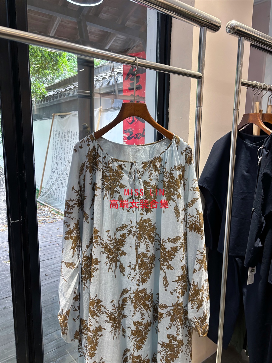 Spring Is Dawning. Designed with a V-Neck, Linen-Cotton Printed Long-Sleeved Loose Dress, Holiday-Style Long Dress