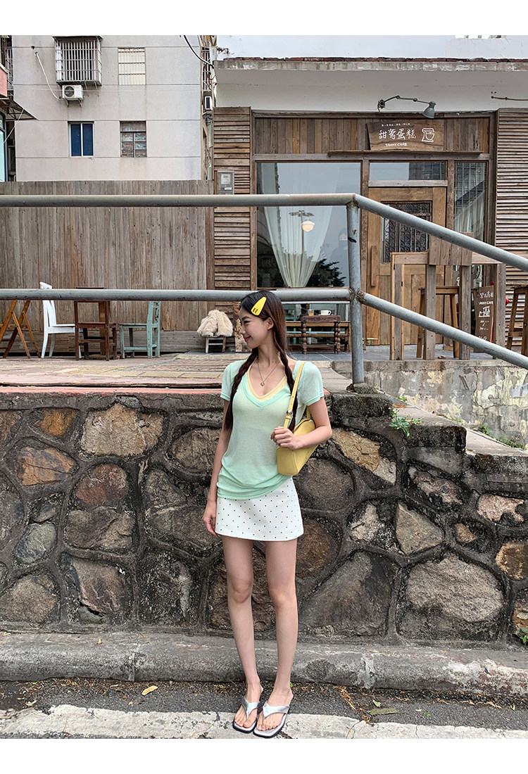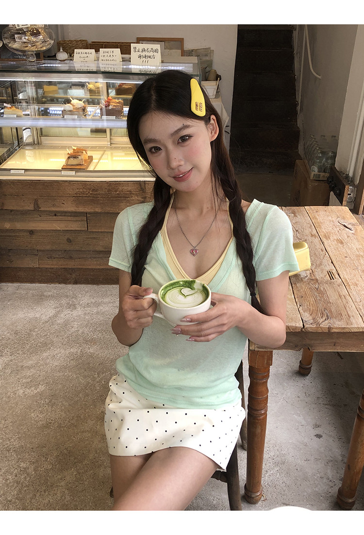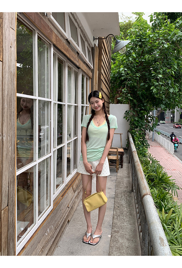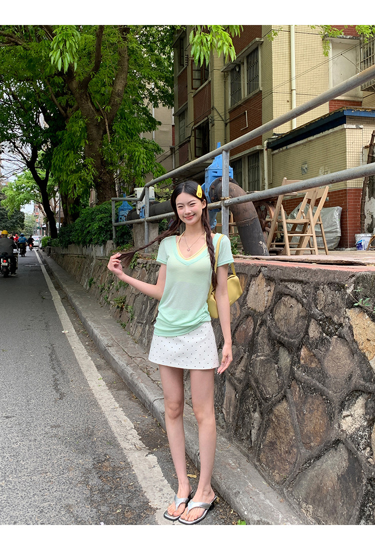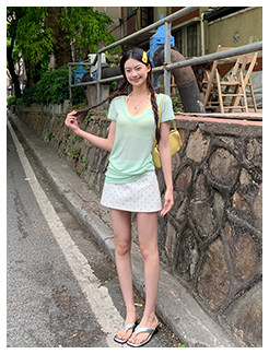 搭配的浅绿色上衣,似新芽初绽,清新自然