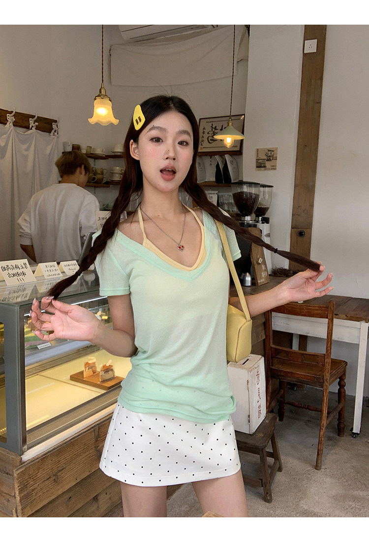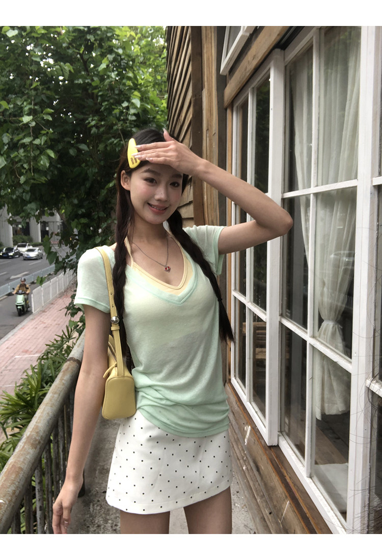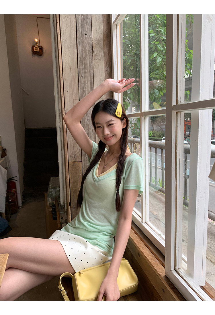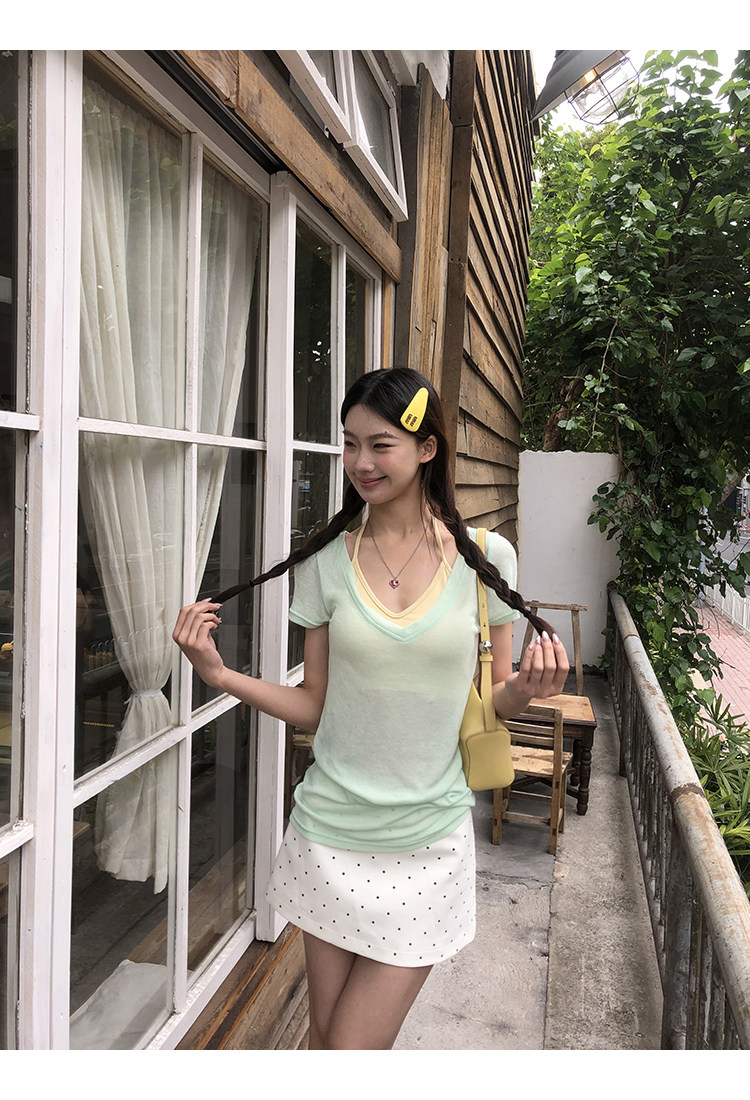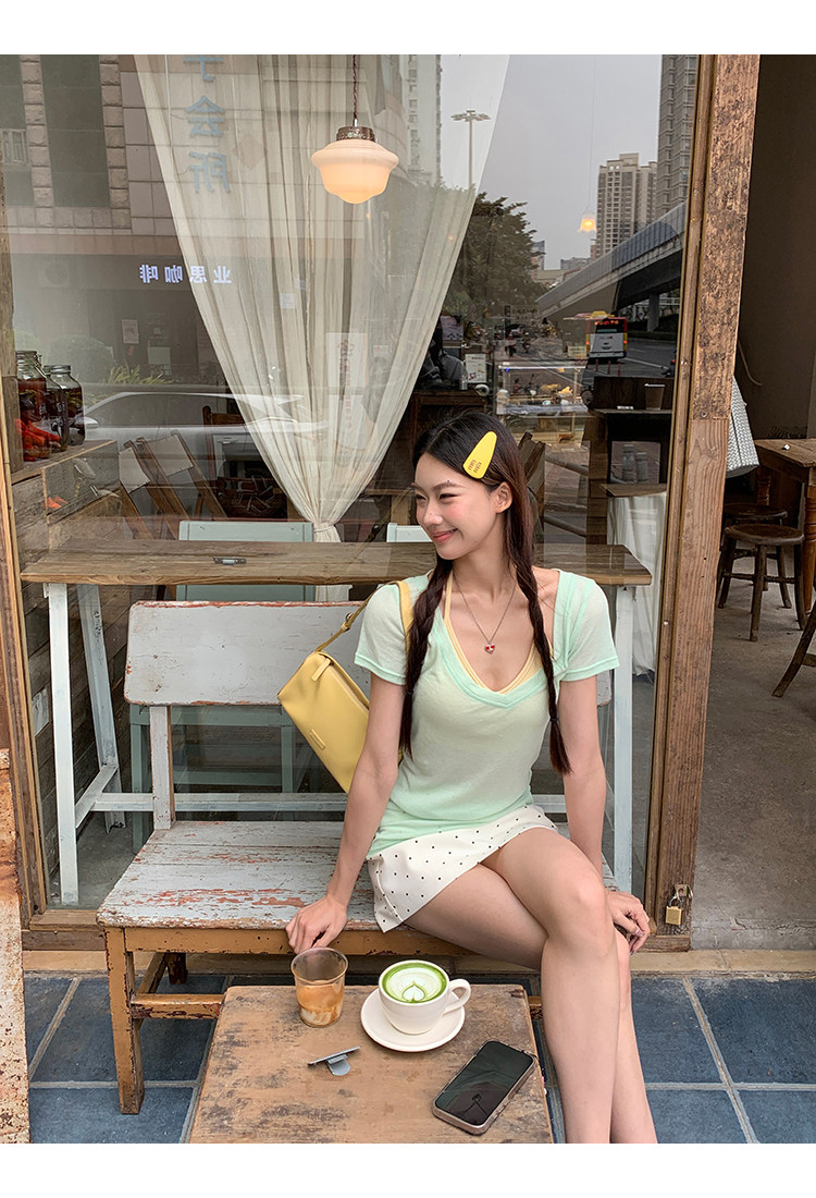 搭配的浅绿色上衣,似新芽初绽,清新自然