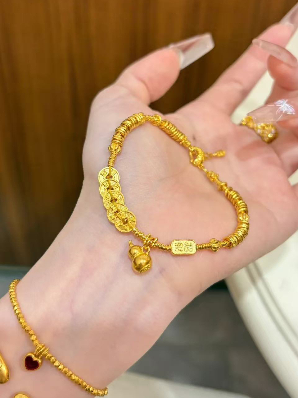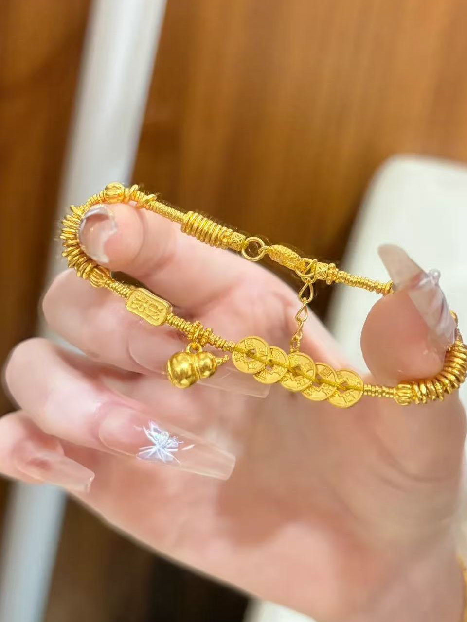 Pure Gold Five Emperors Coin Gourd-Shaped Coiled Bracelet for Women, 999 Gold, New Chinese Style, Exquisite Braided Rope Coiled with Mother-Of-Pearl Gold