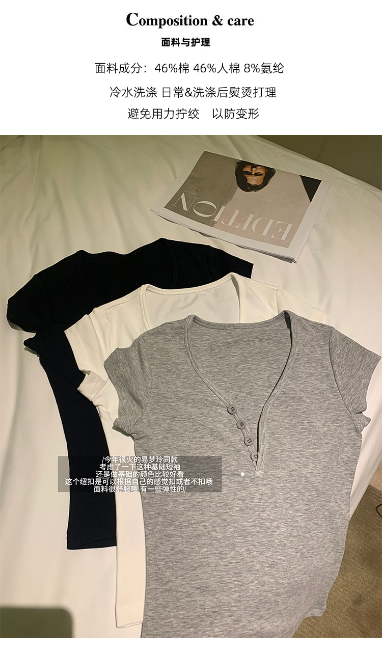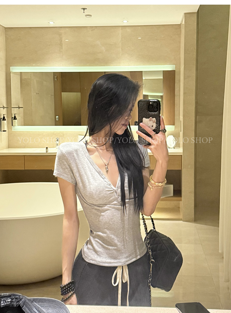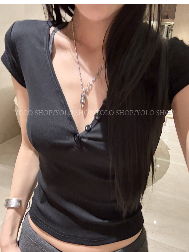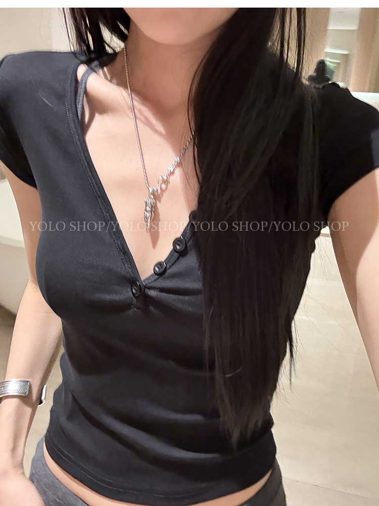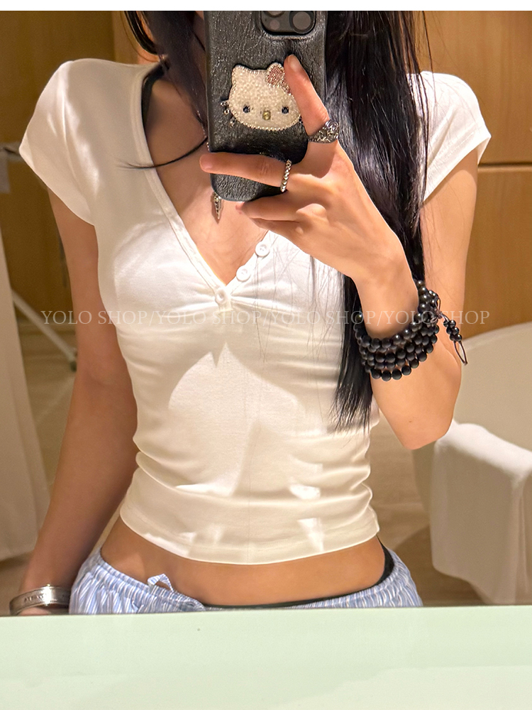 Yolo Shop White V-Neck Button-Down Short-Sleeve Women's Summer Elegant Slim-Fit Versatile Regular Shoulder T-Shirt Slimming Top