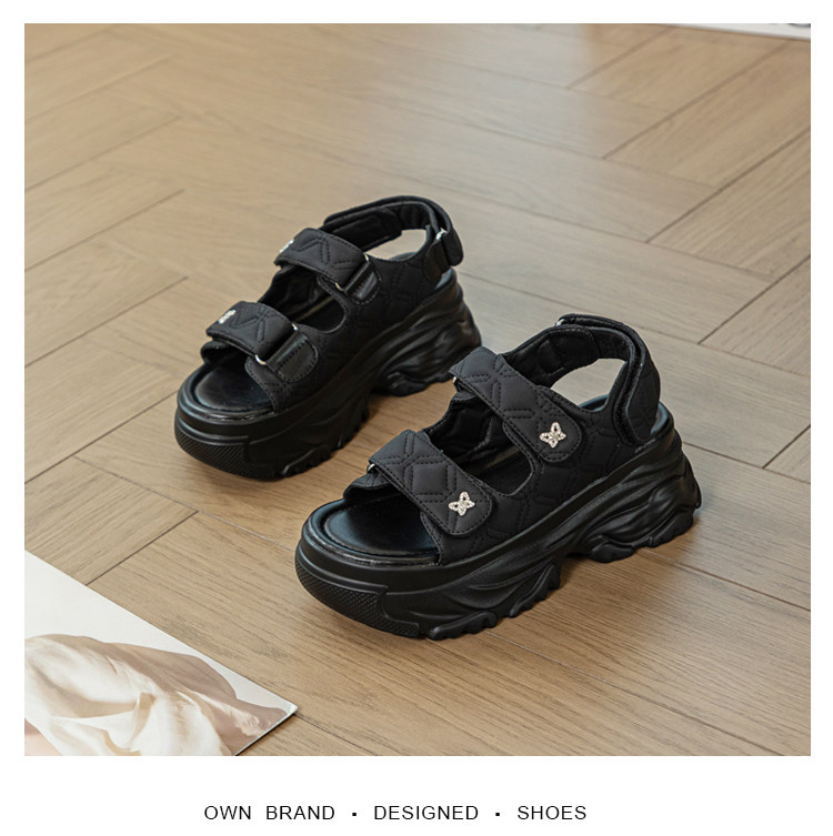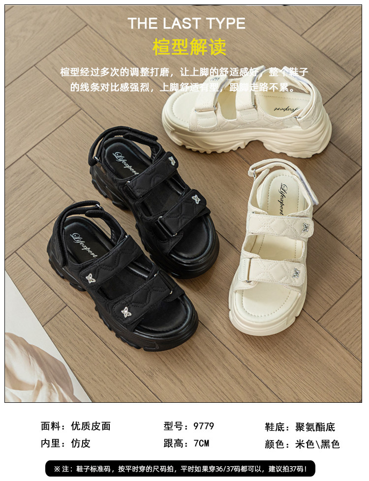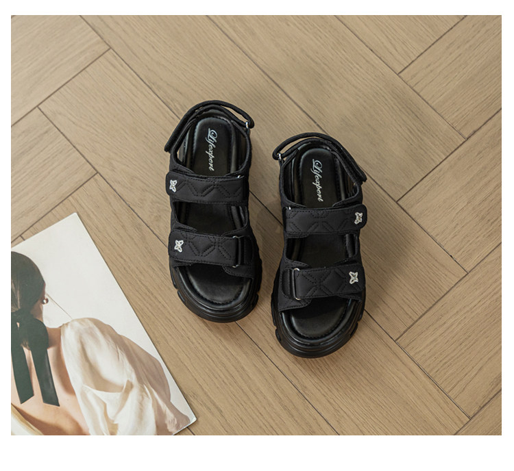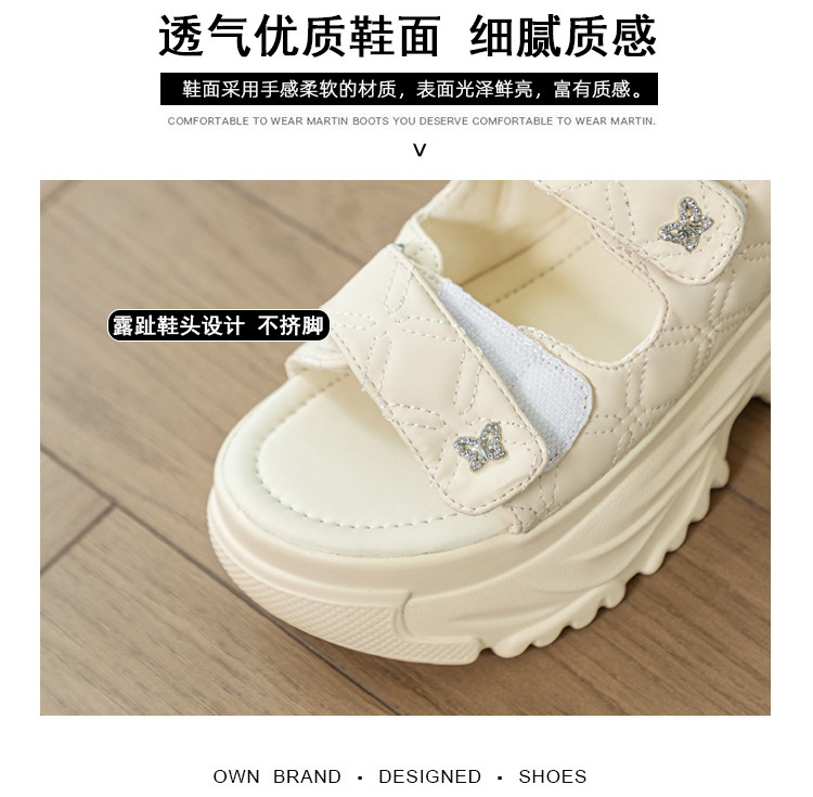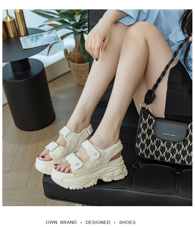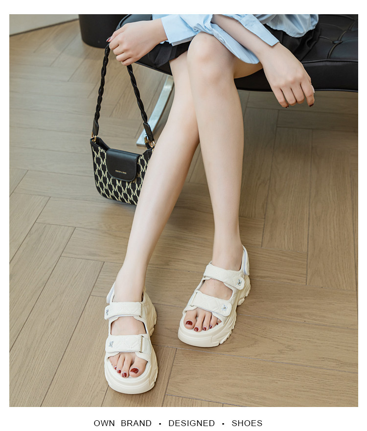 Tweed Style Thick-Soled Buckle Sandals 2025 Summer New Open-Toe Velcro Outer Sandals Pure Color Fashionable Beige