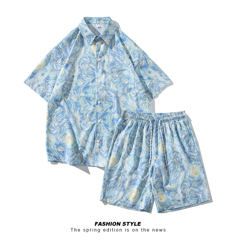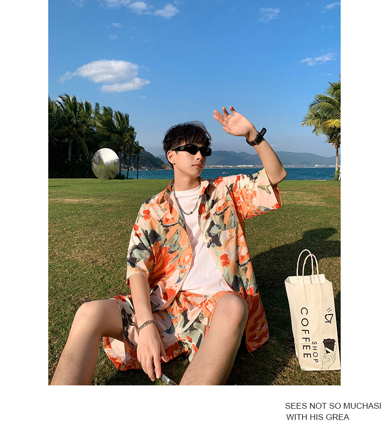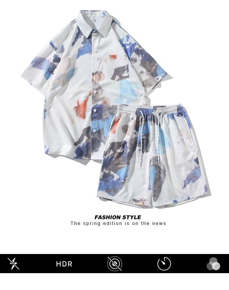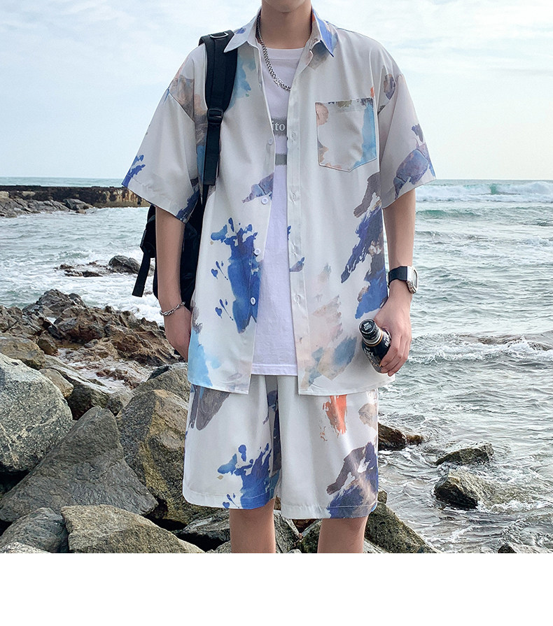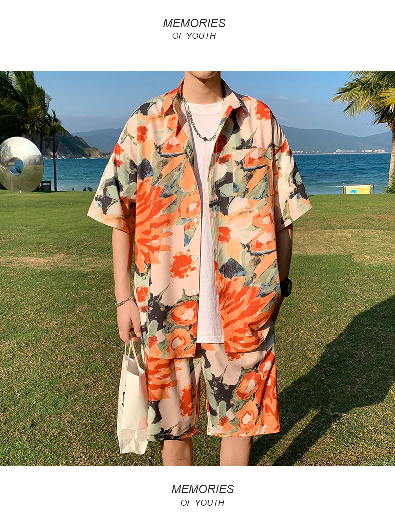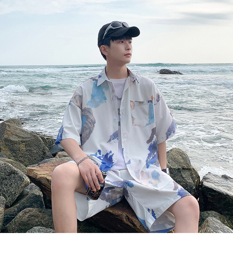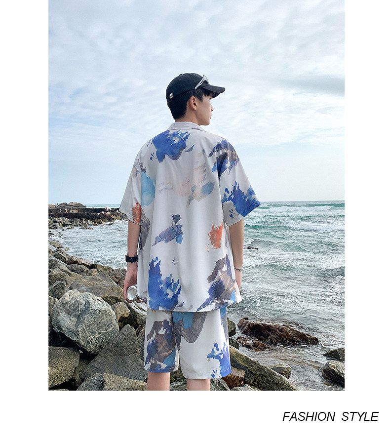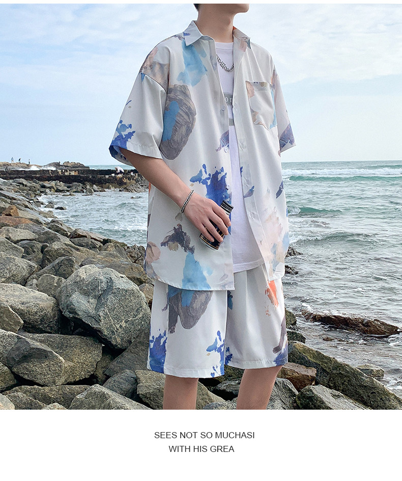 Wassup Happy Ice Silk Beach Short-Sleeved Shirt Set Men's Summer Thin Shorts Loose Sports Two-Piece Set