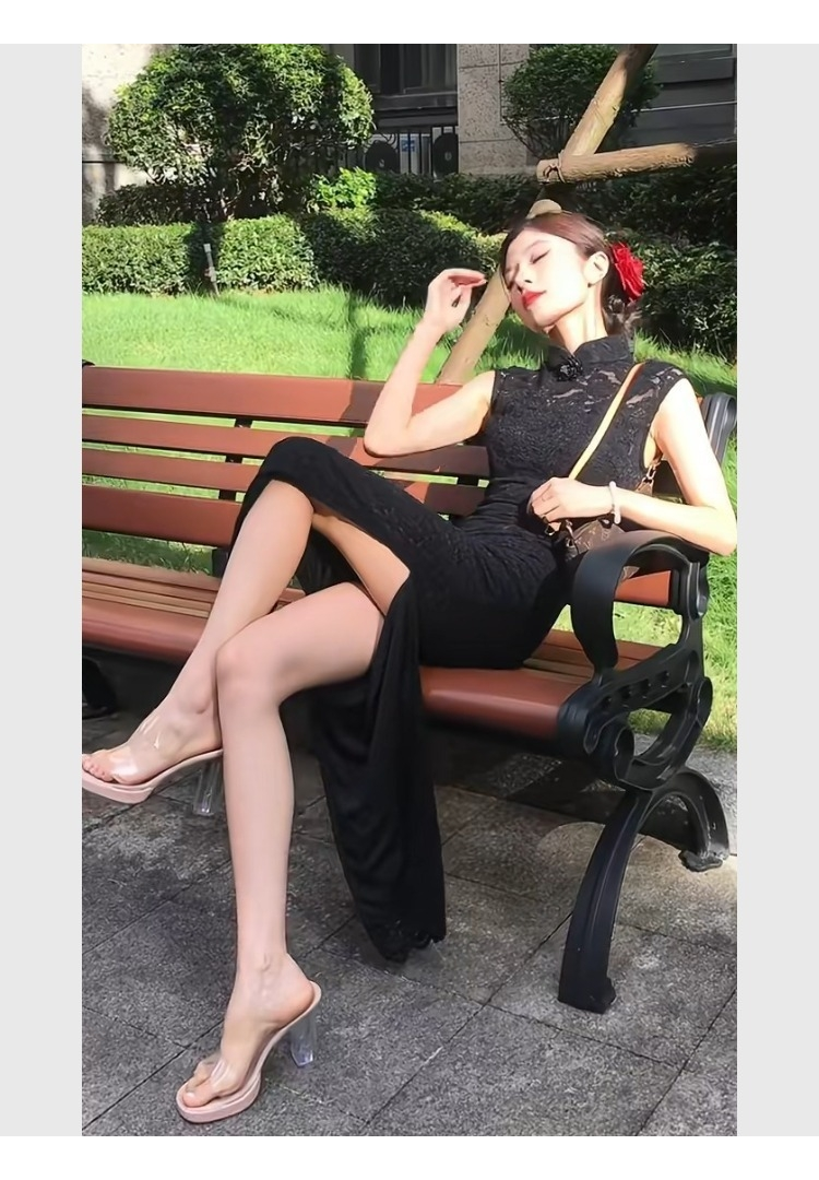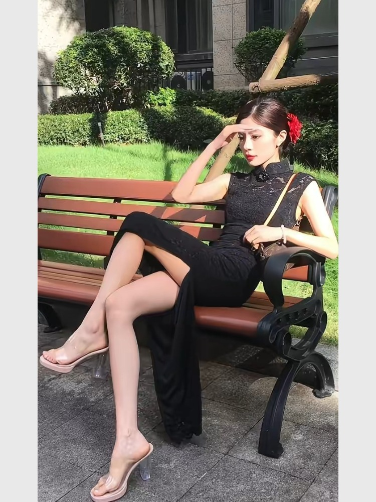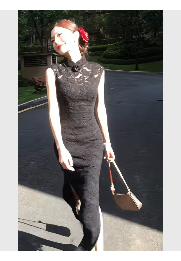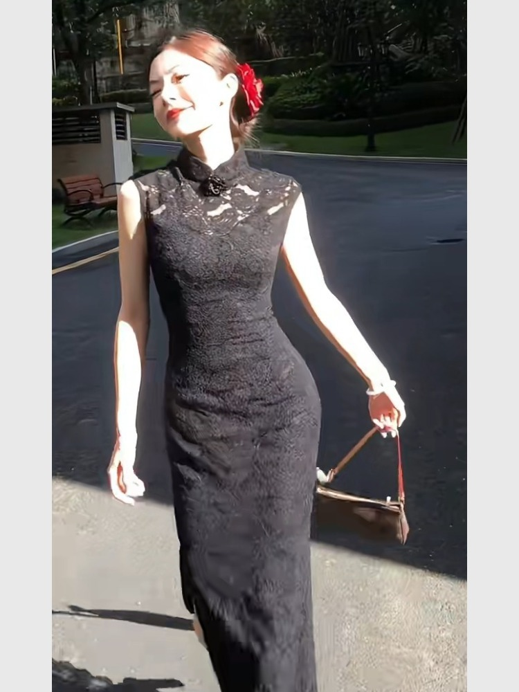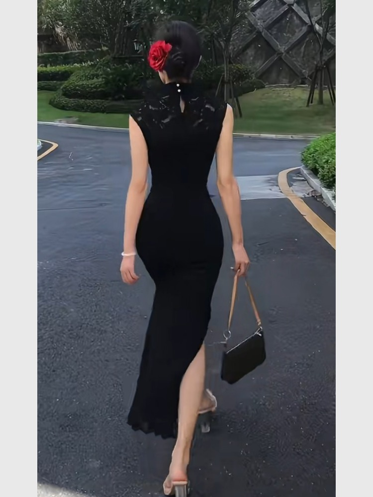 New Chinese Style Black Lace Cheongsam Dress, Summer Women's Clothing, Elegant and Slimming, Waist-Cinching, Hip-Hugging Dress