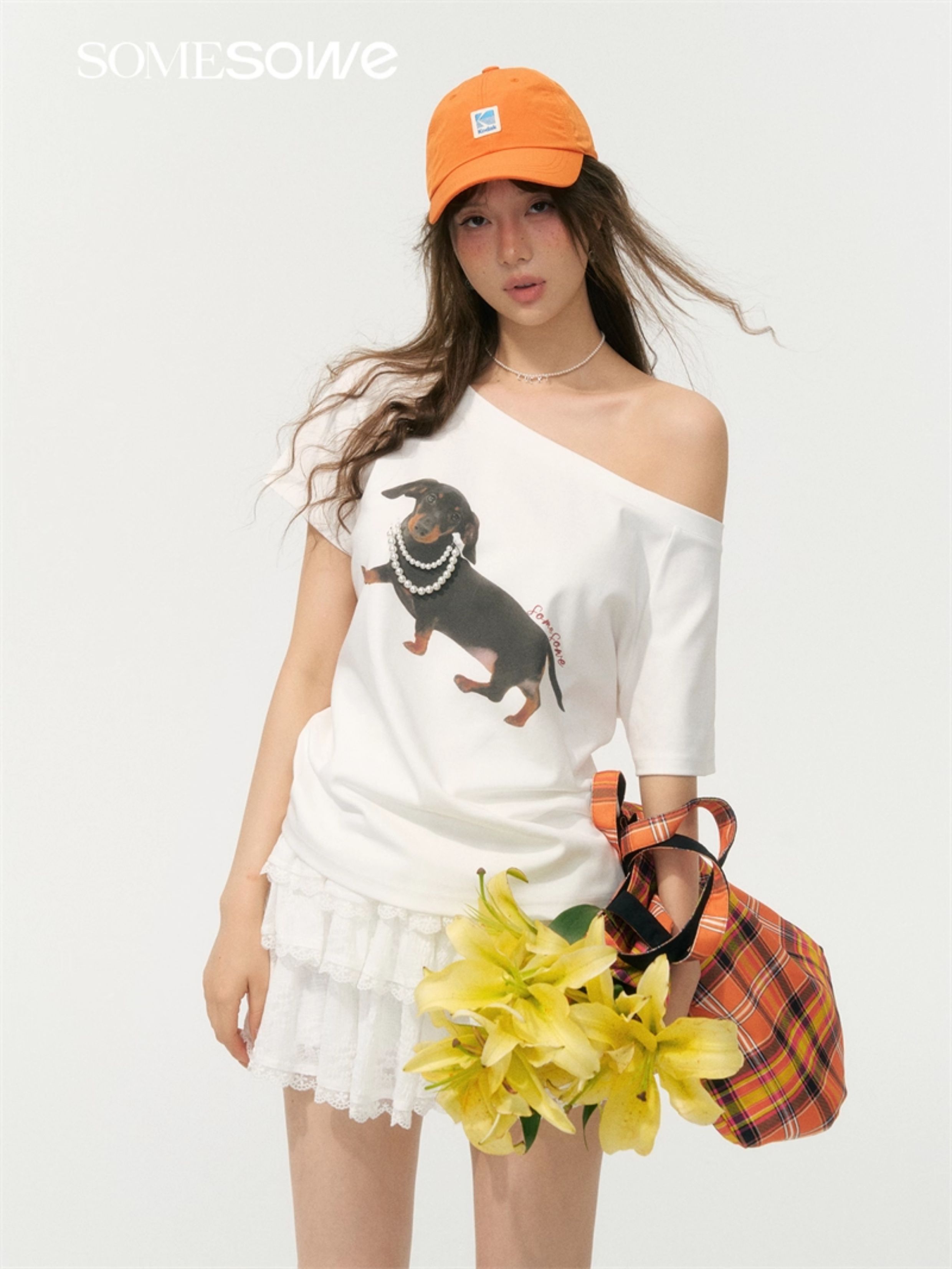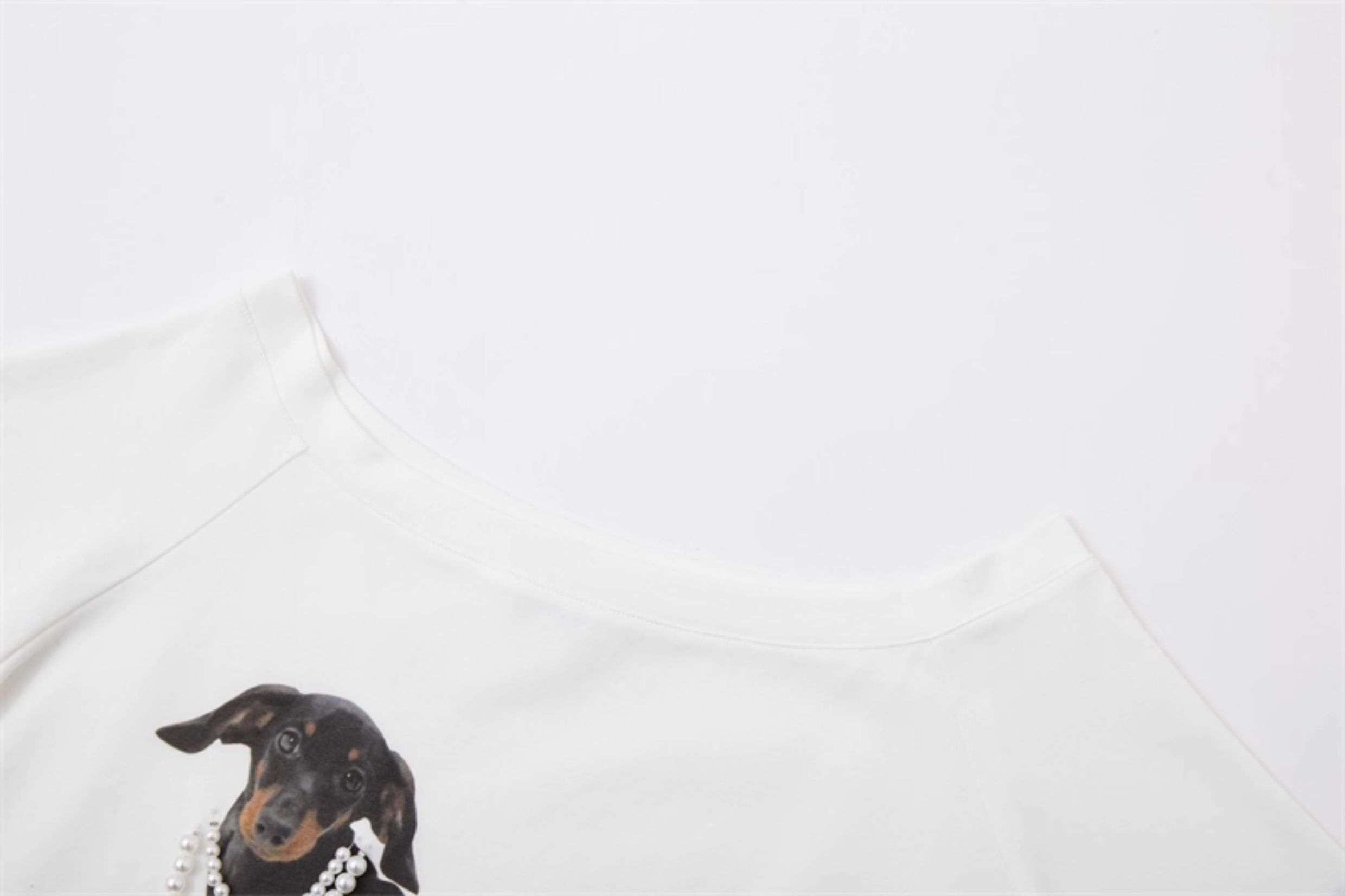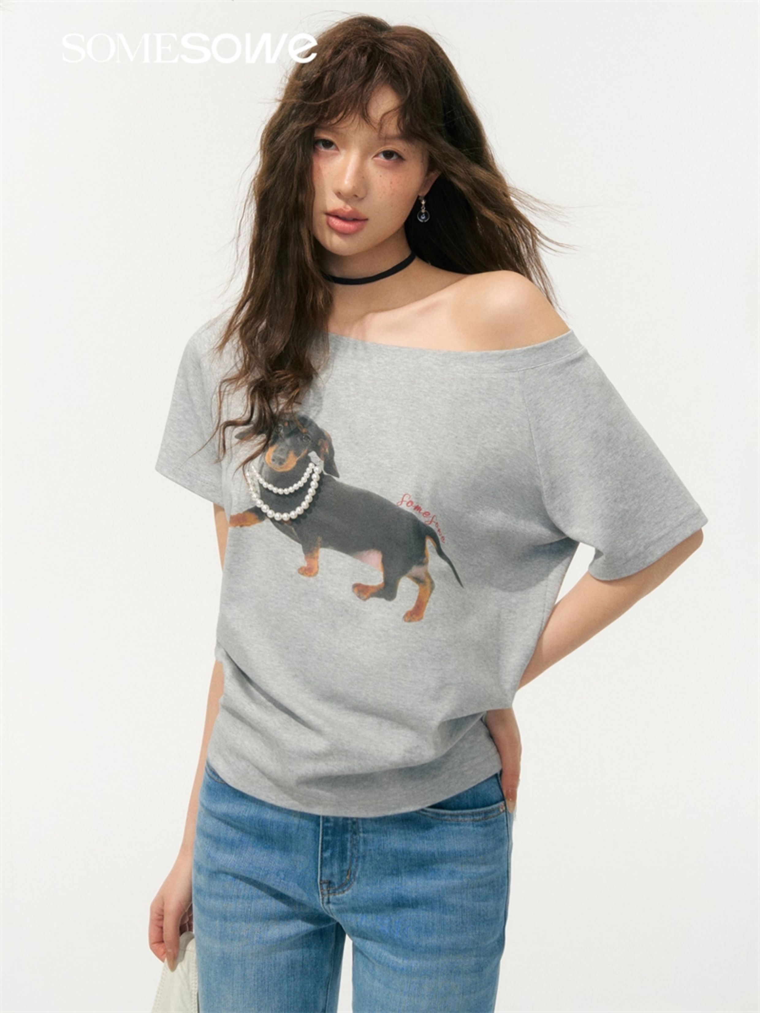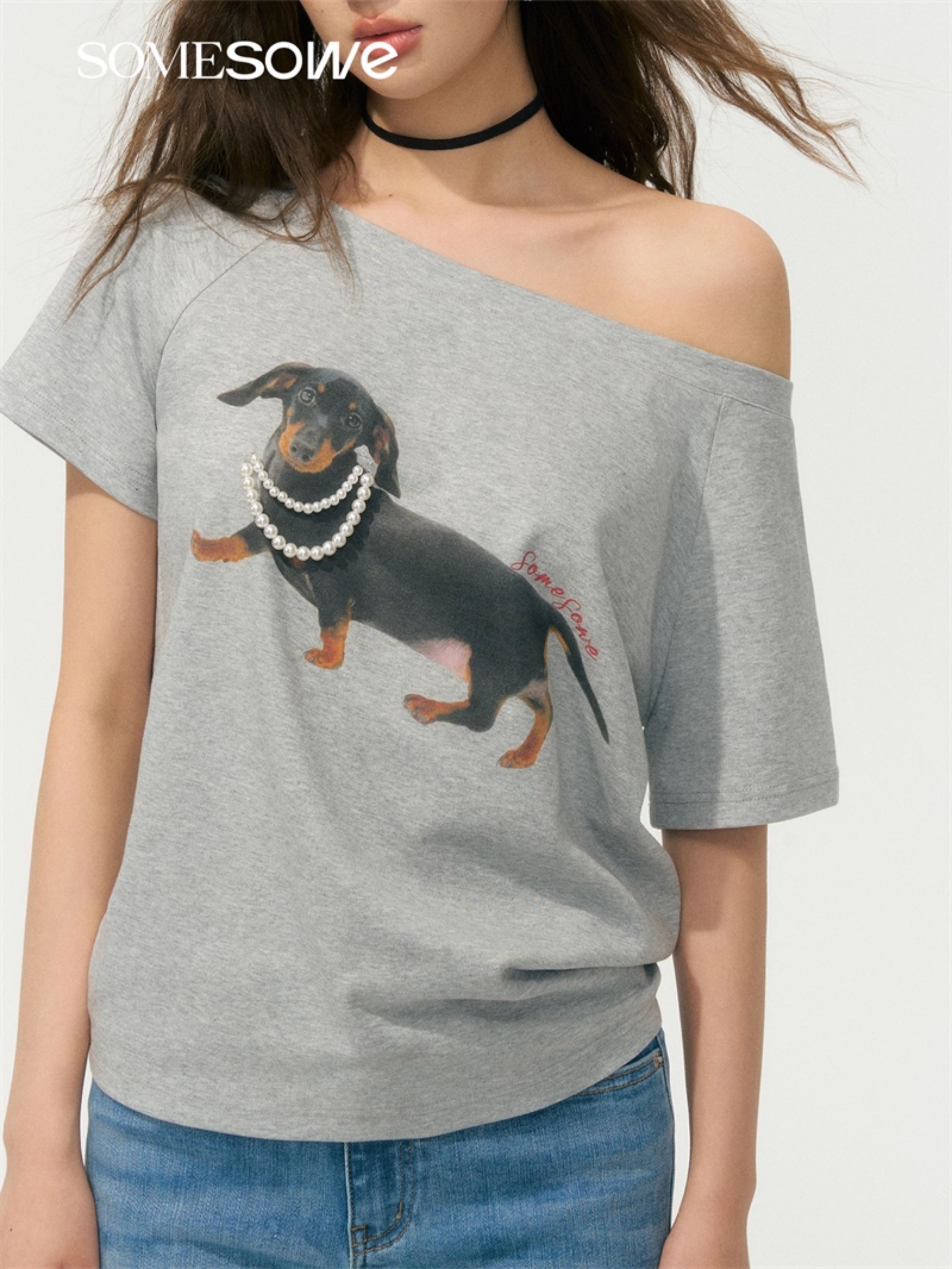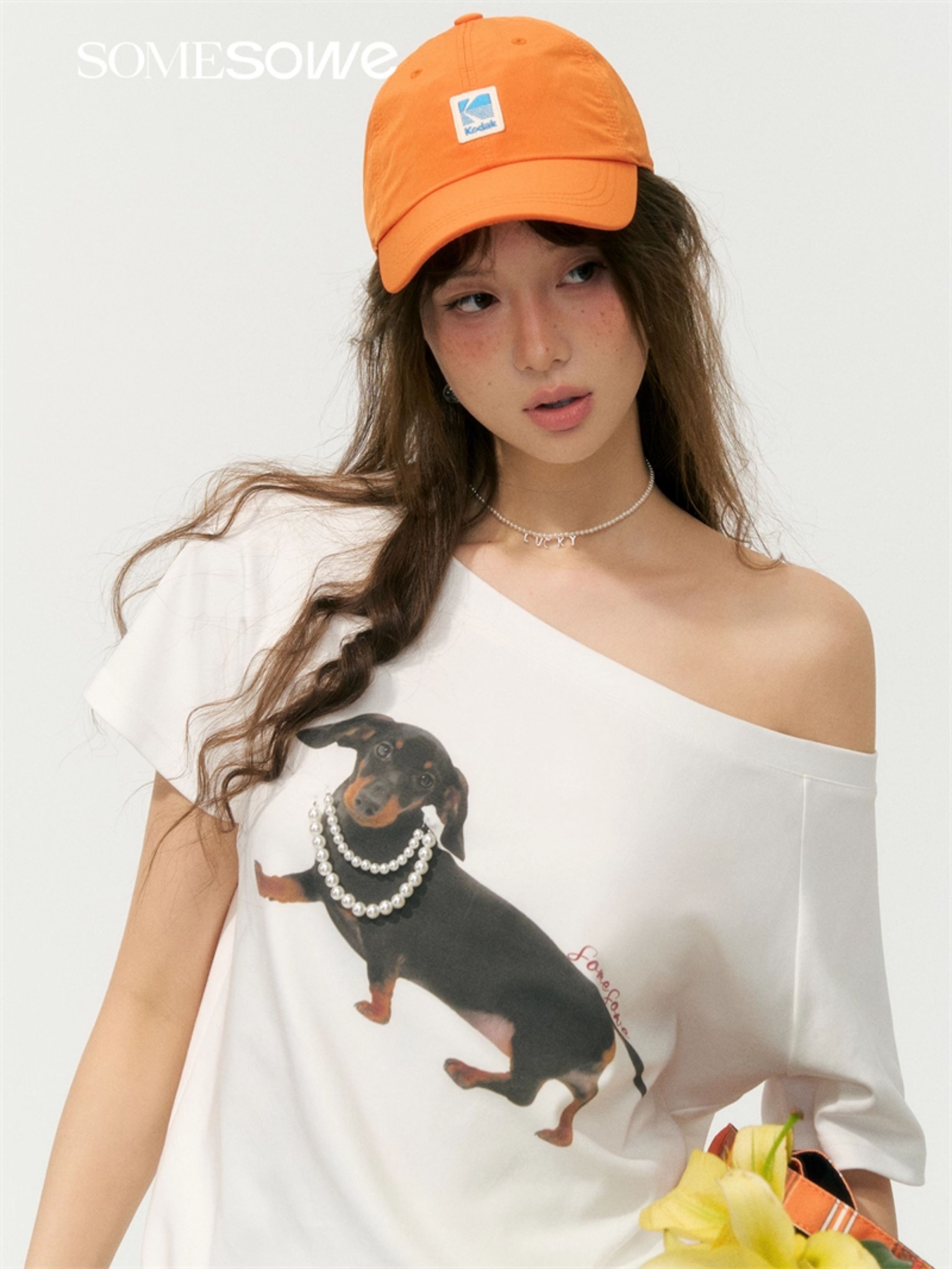 Xu Ruohan, Han Qizi, and Sun Yi's Same Style Somesowe Pearl Dachshund Off-Shoulder T-Shirt for Women, Designer Top