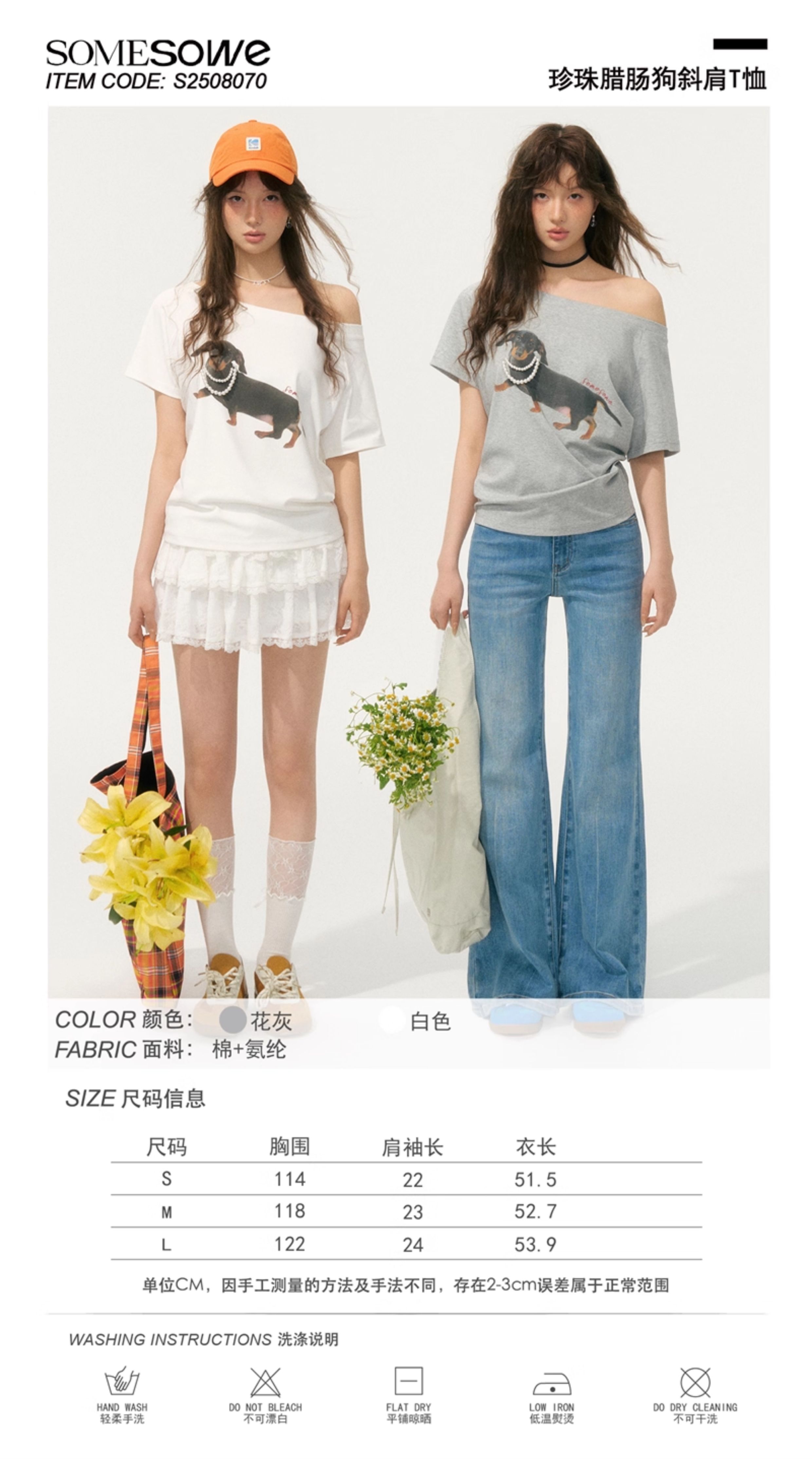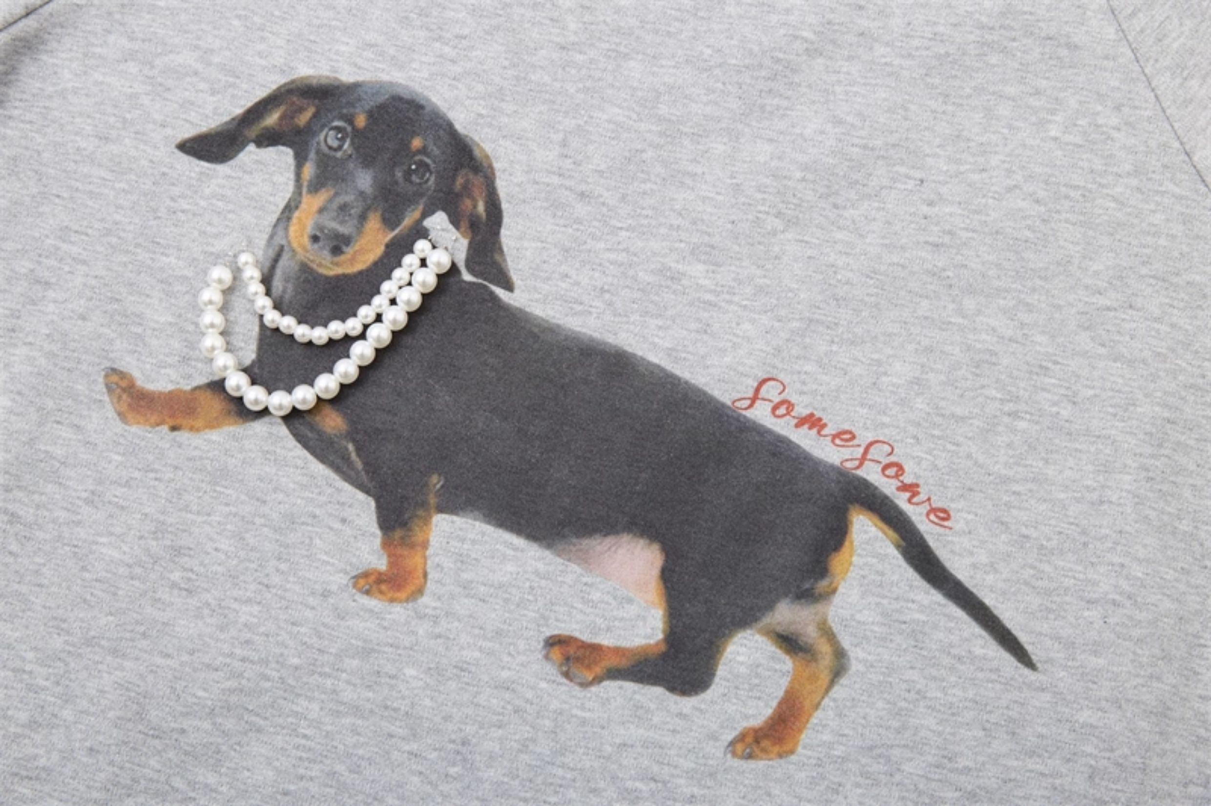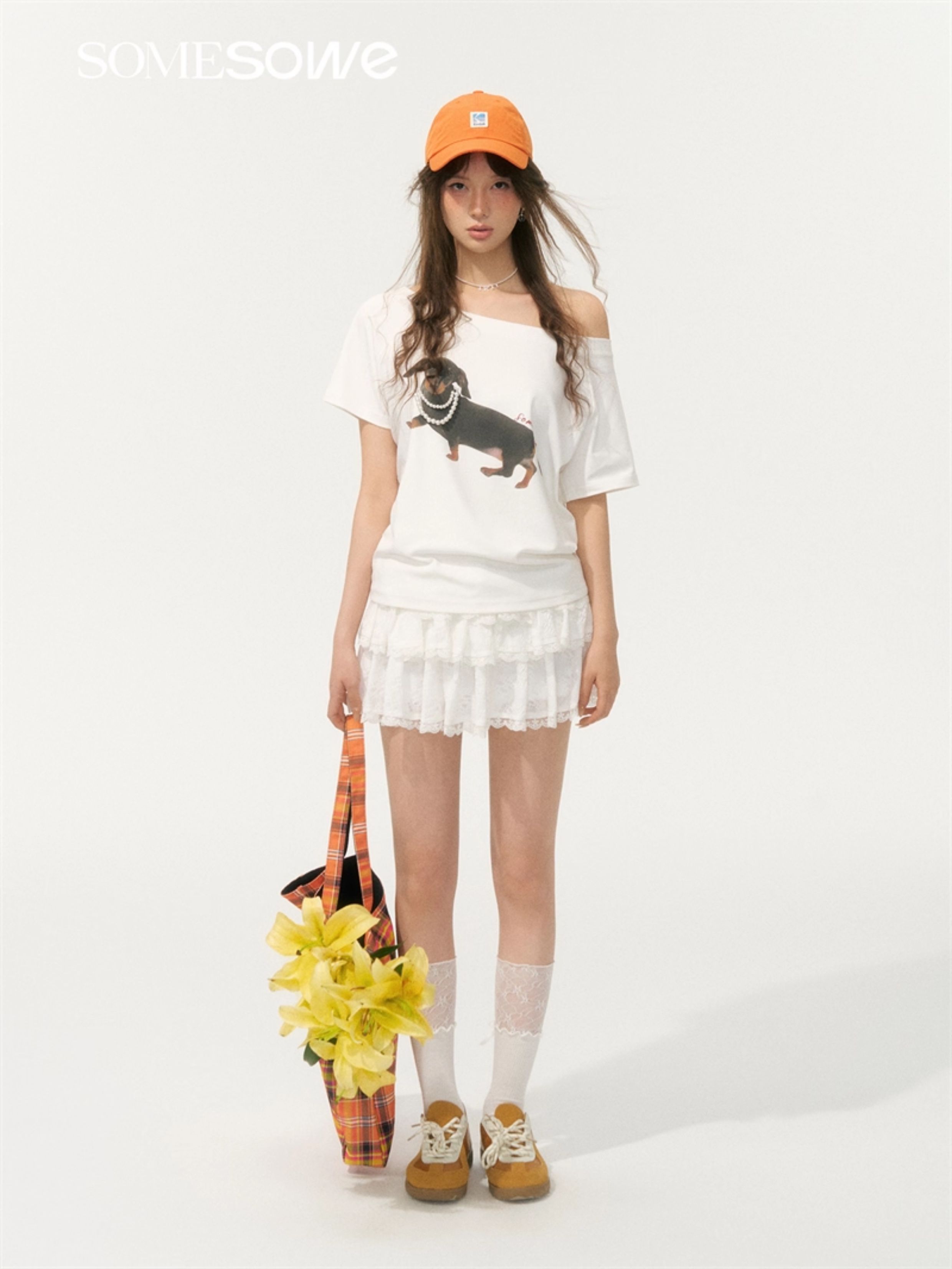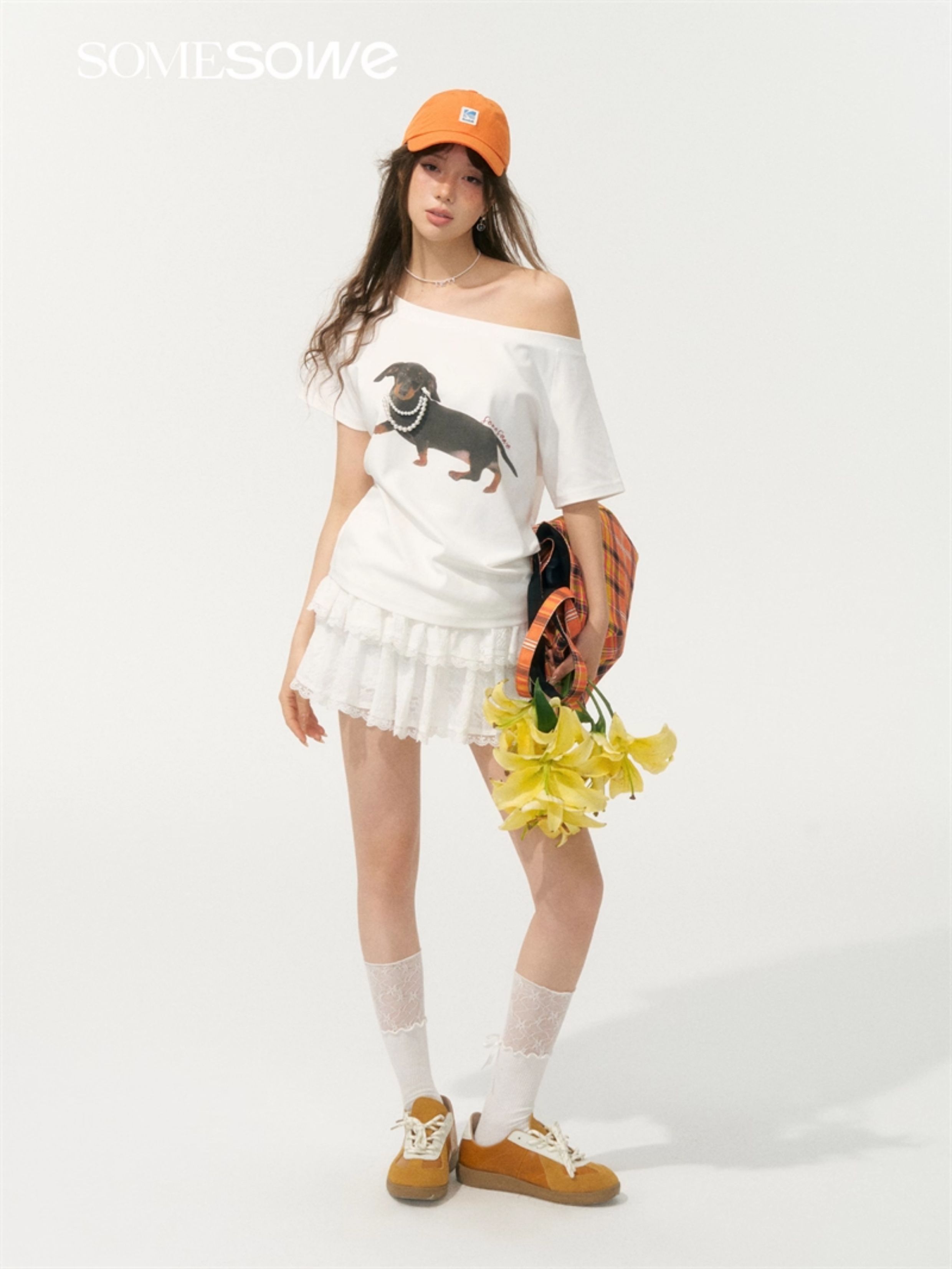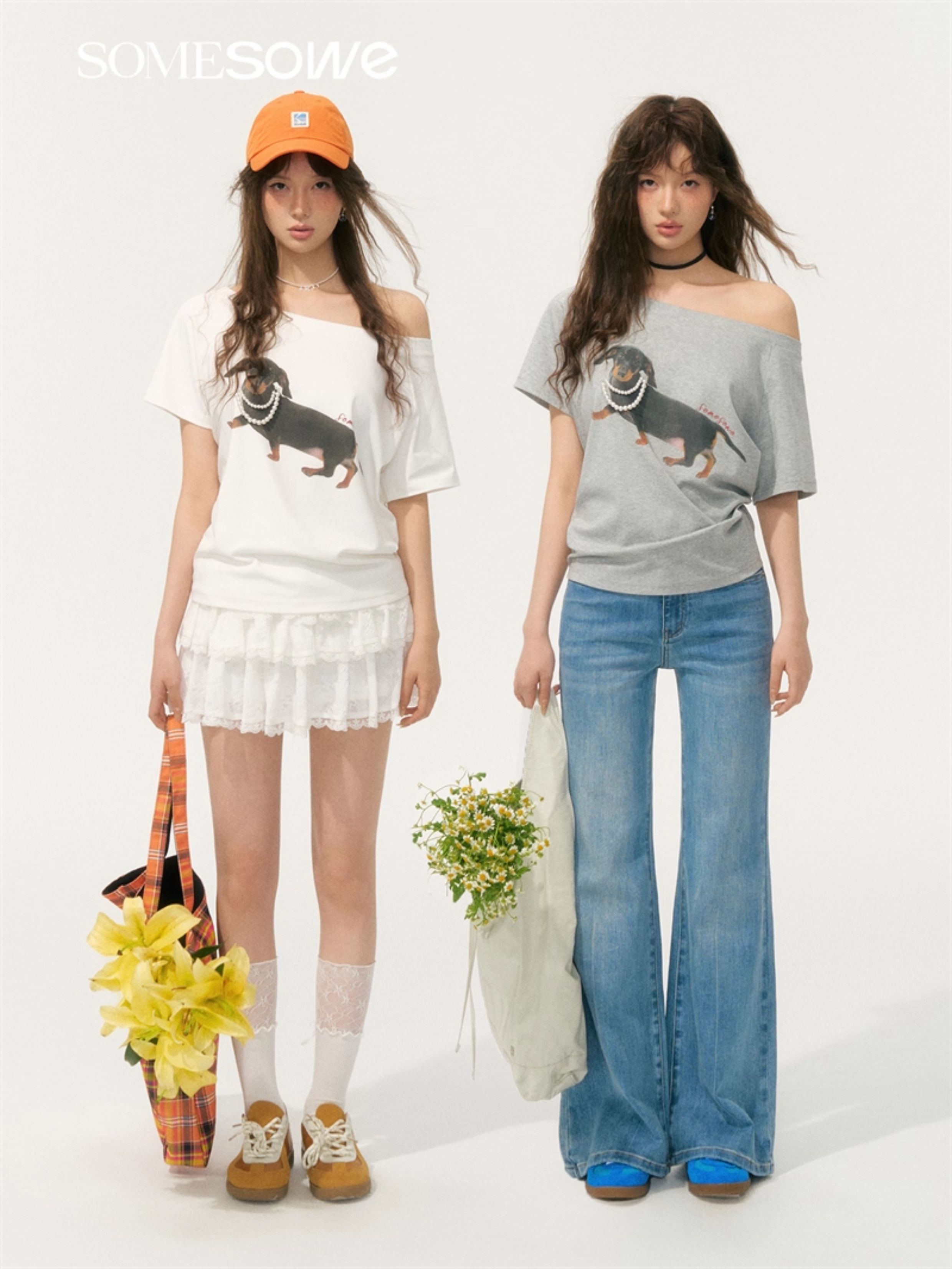 Xu Ruohan, Han Qizi, and Sun Yi's Same Style Somesowe Pearl Dachshund Off-Shoulder T-Shirt for Women, Designer Top