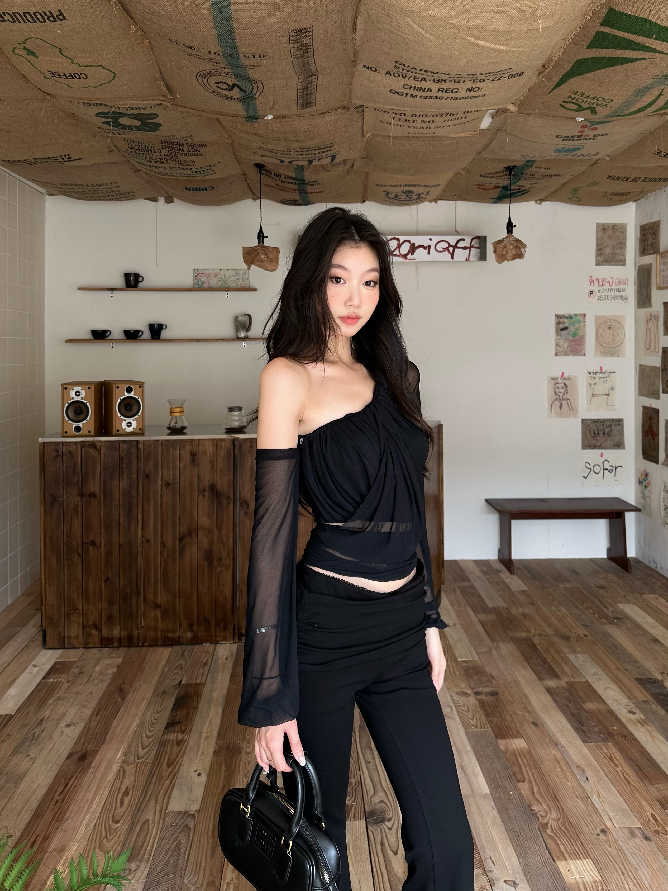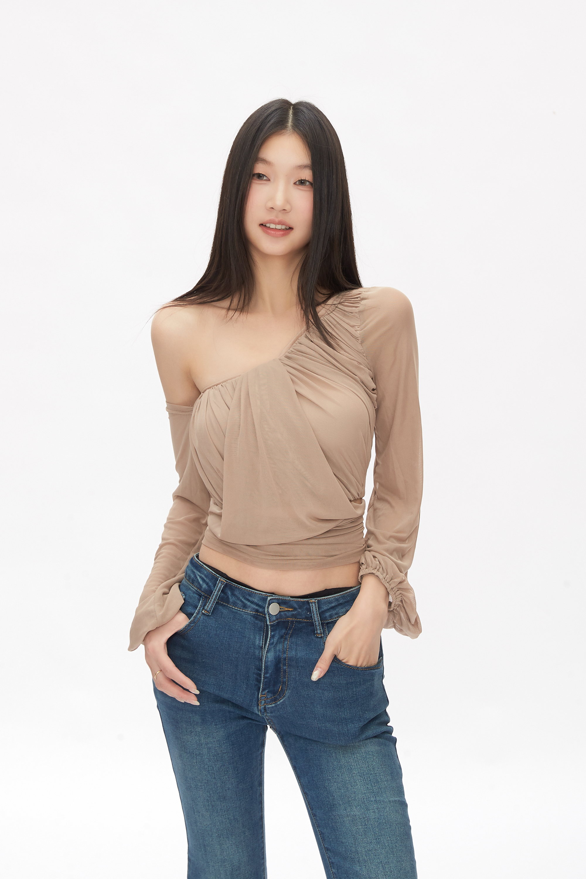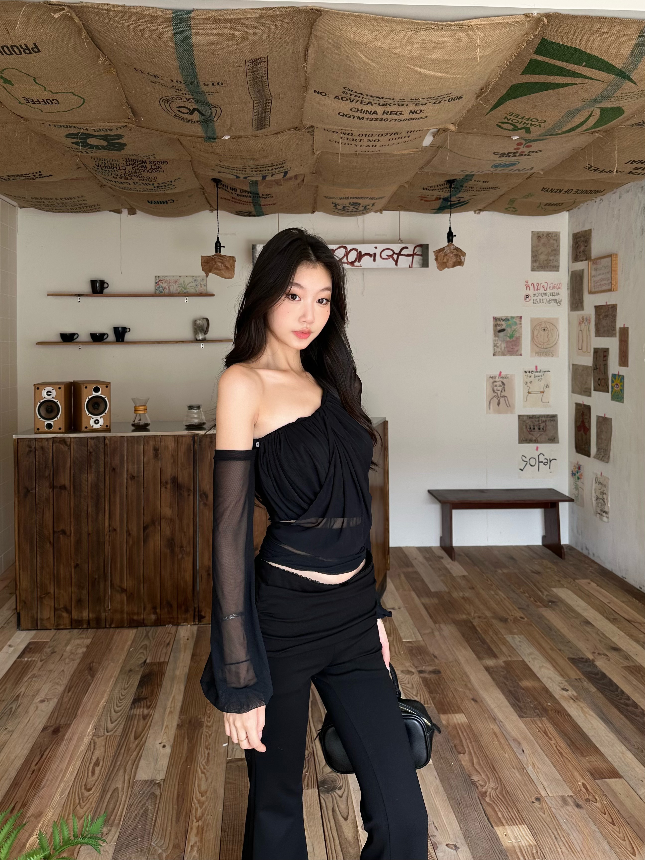 Withmin Sexy Asymmetrical Shoulder Top, Unique Design, Niche Women's Summer Sunscreen Cover-Up, Long Sleeve T-Shirt, Thin Style