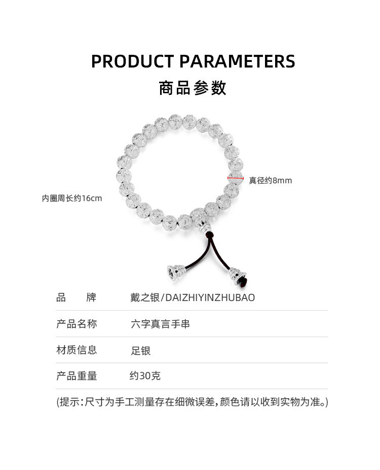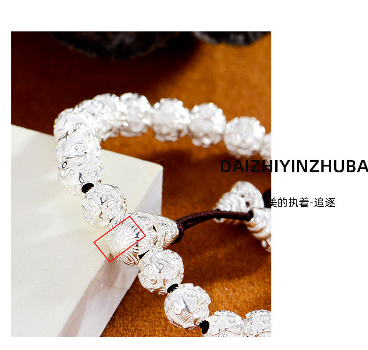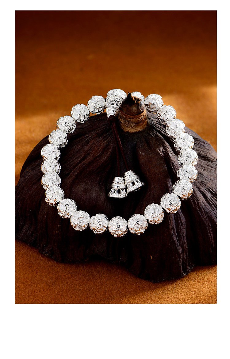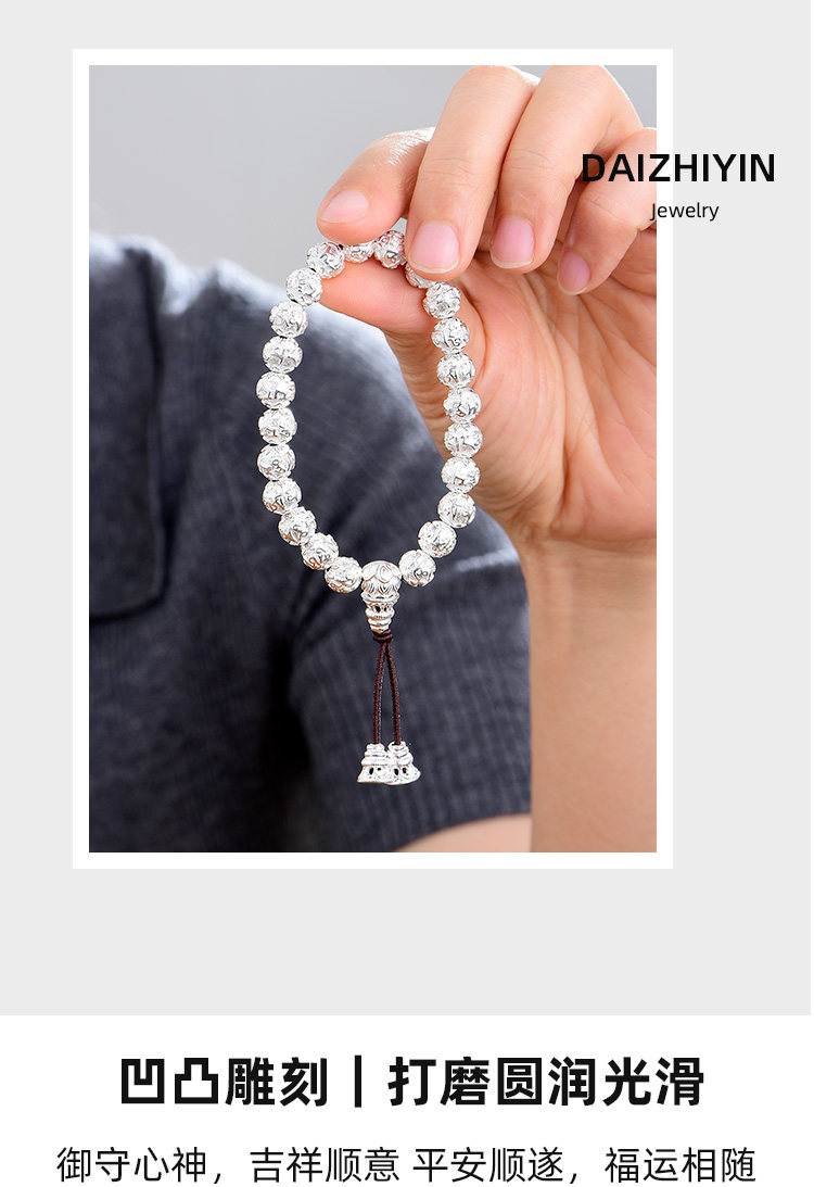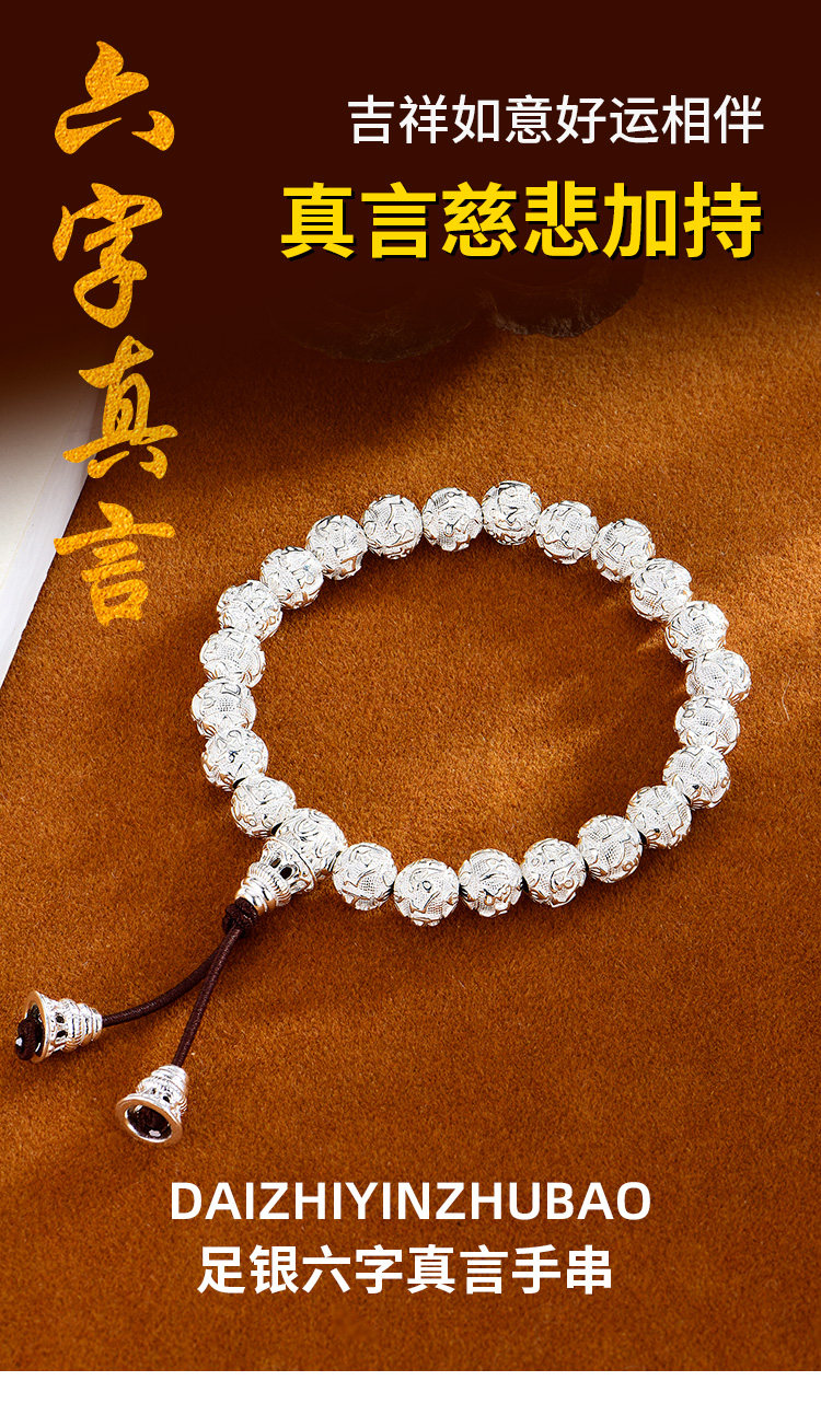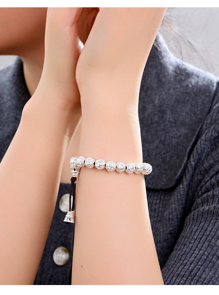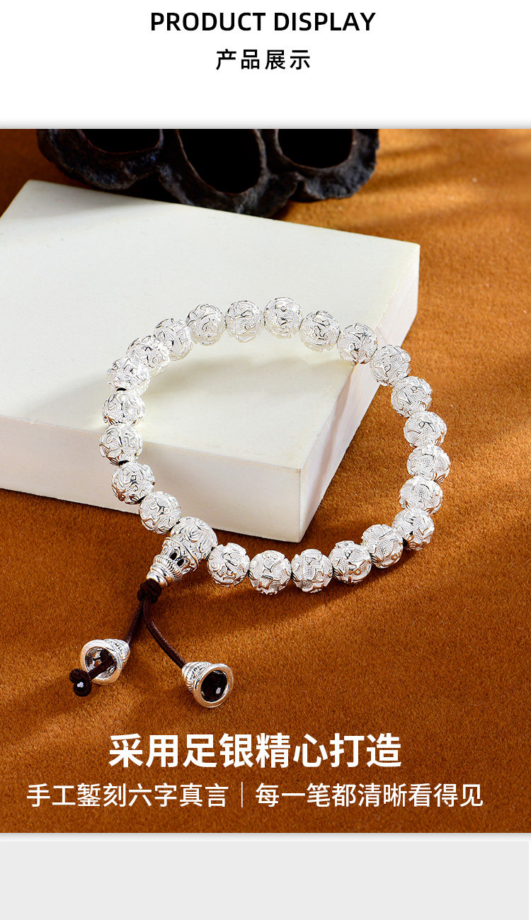 Silver Jewelry Pure Silver Bracelet Silver Bead Bracelet Six-Character Mantra Couple Men and Women Round Bead Solid Heart Sutra Solid Men's