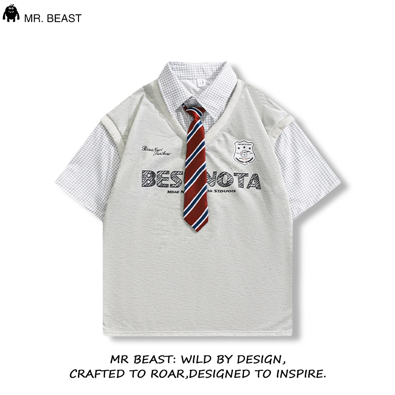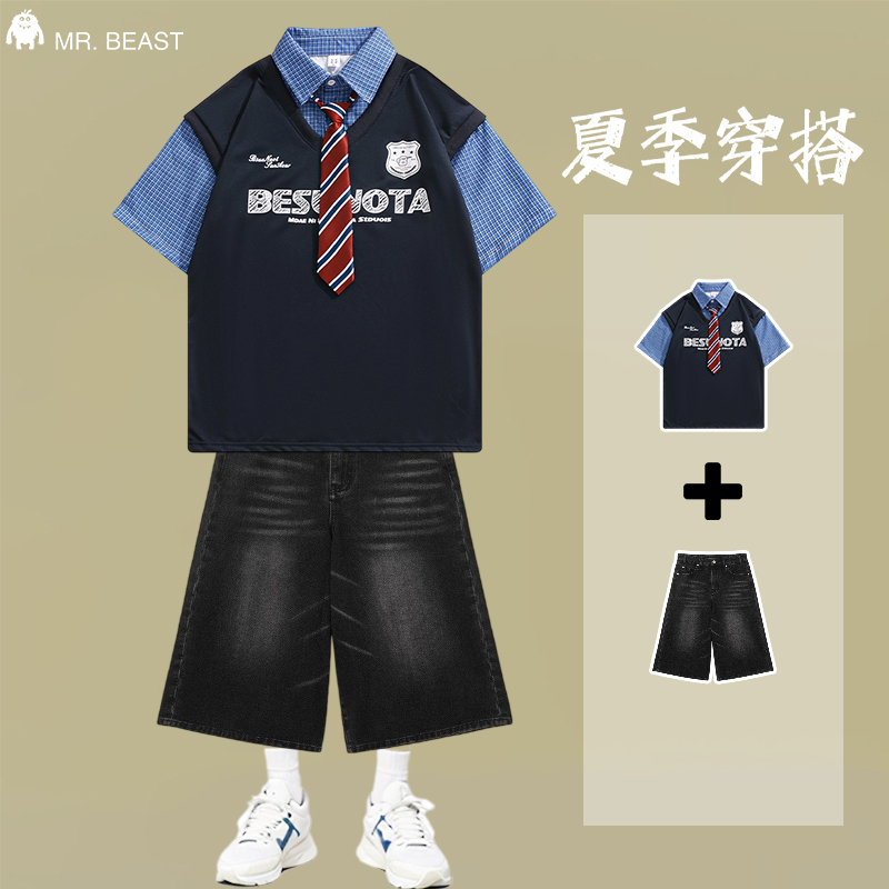 American Retro Fake Two-Piece Plaid Shirt with Tie T-Shirt for Men and Women, College Style Japanese Short-Sleeve Denim Cropped Pants Set