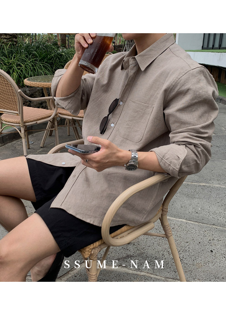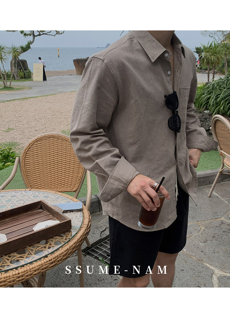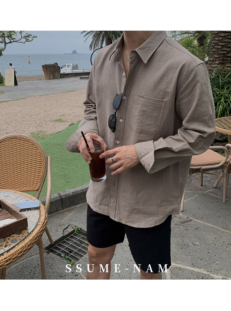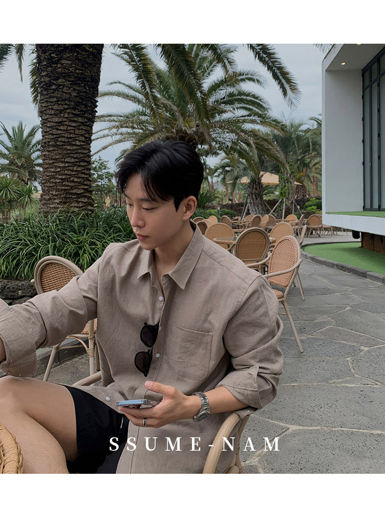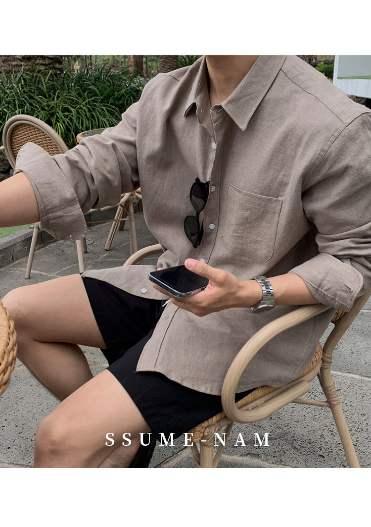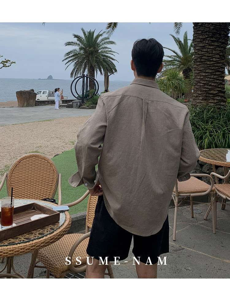 Ssumenam'Old Money Style Relaxed Feel' Khaki Linen Long Sleeve Shirt for Men, Summer Korean Style Thin Shirt