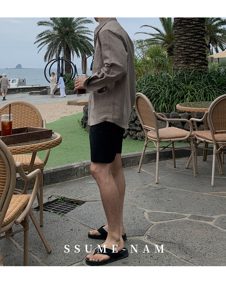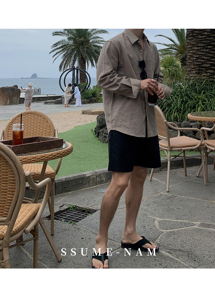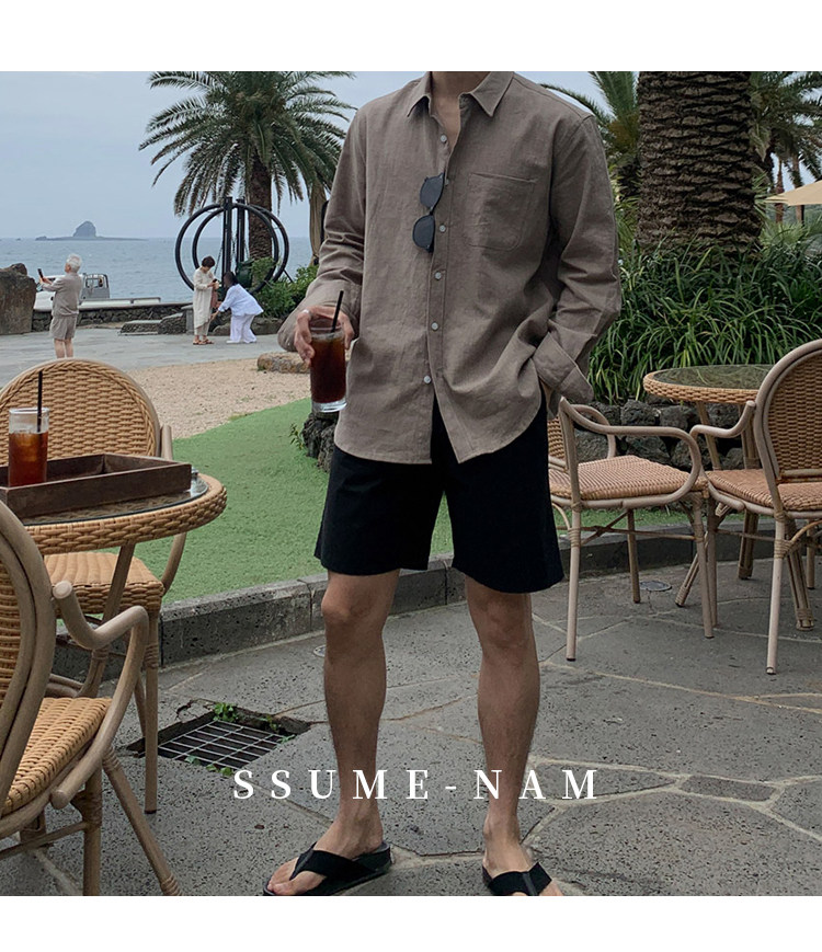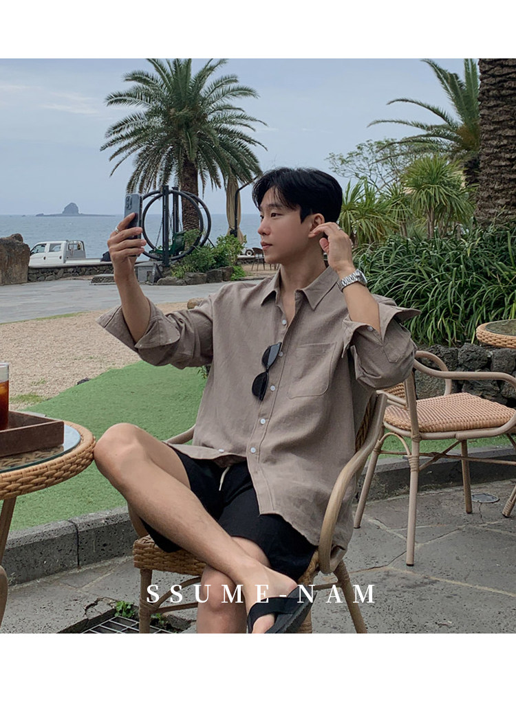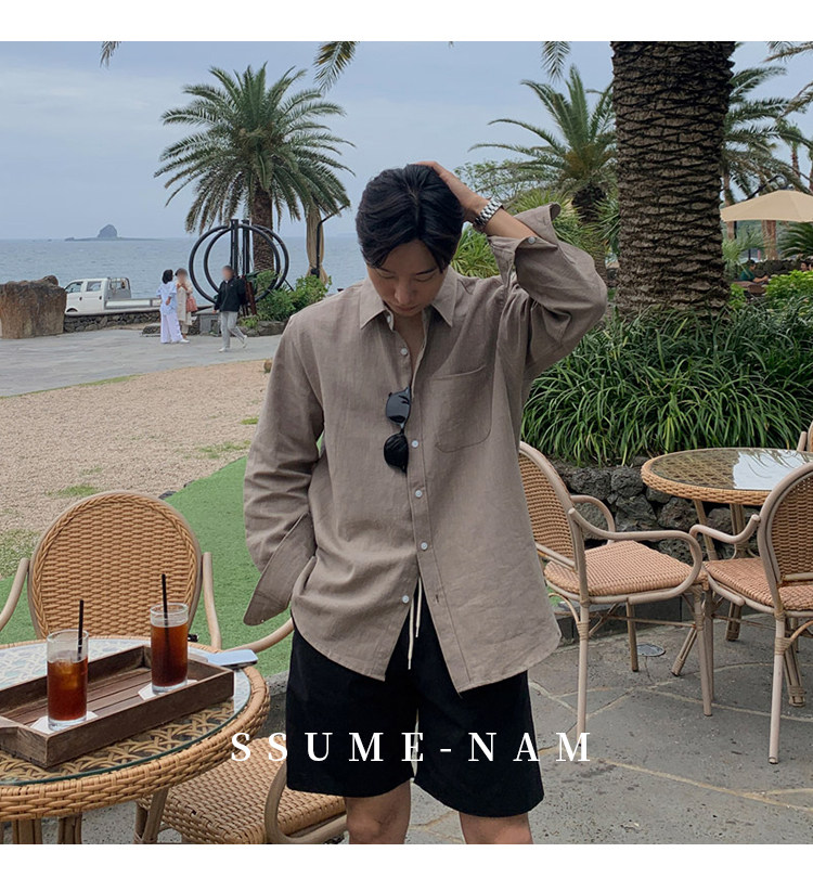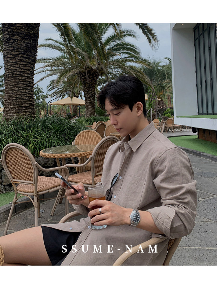 Ssumenam'Old Money Style Relaxed Feel' Khaki Linen Long Sleeve Shirt for Men, Summer Korean Style Thin Shirt