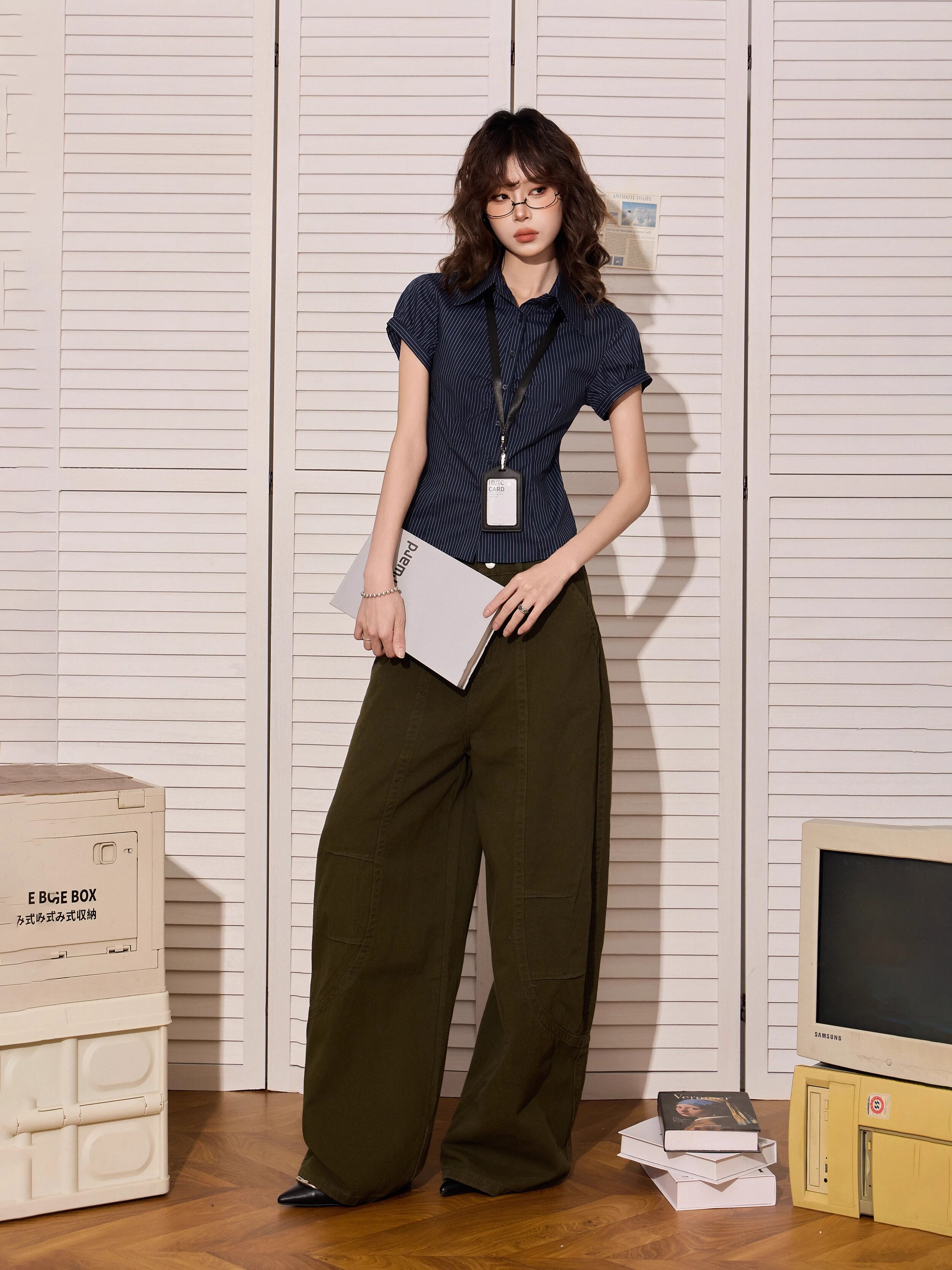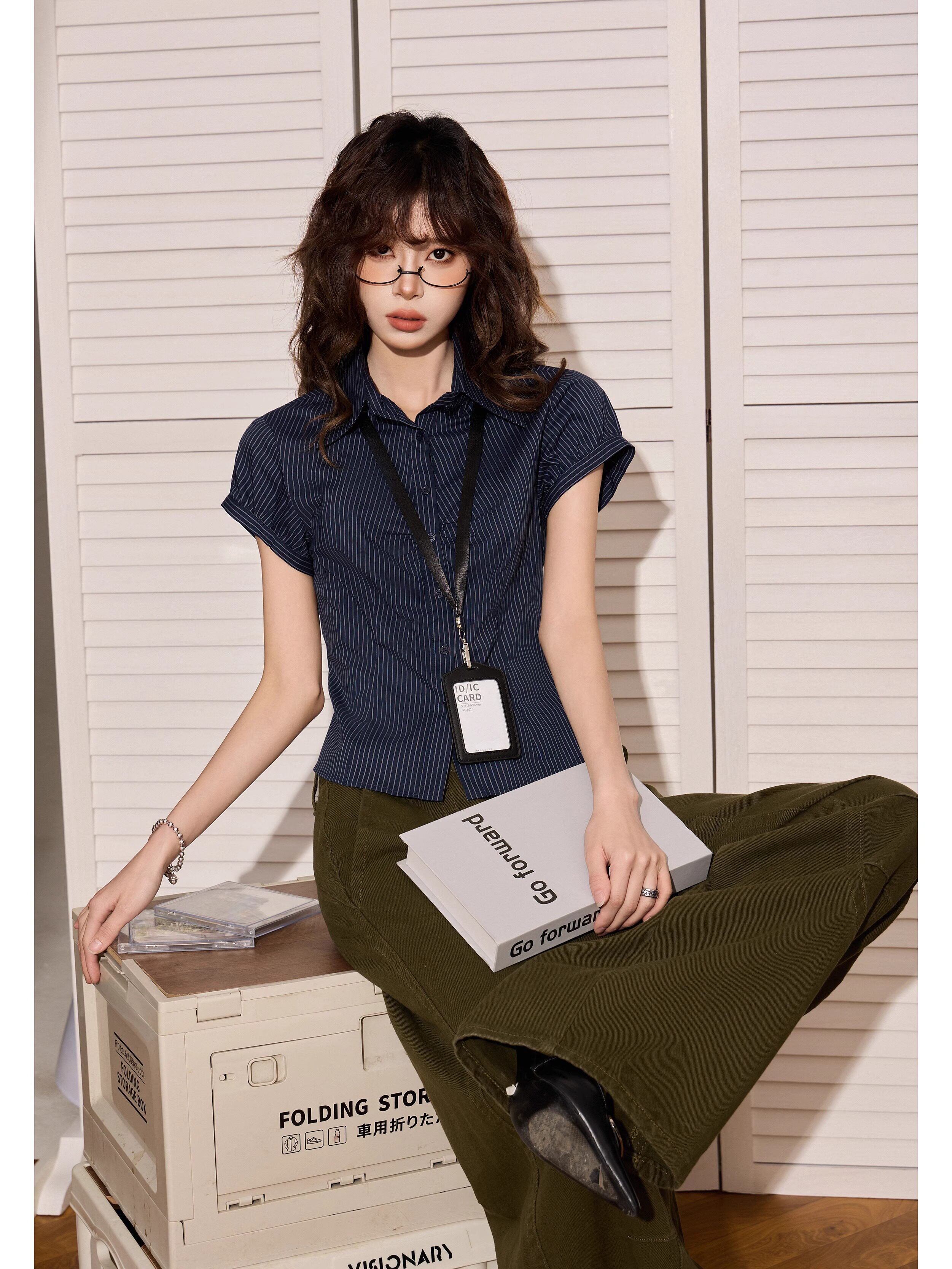 Navy Blue Striped Regular Shoulder Short-Sleeve Shirt for Women, Summer American-Style Design, Slim-Fit Short Polo Shirt Top