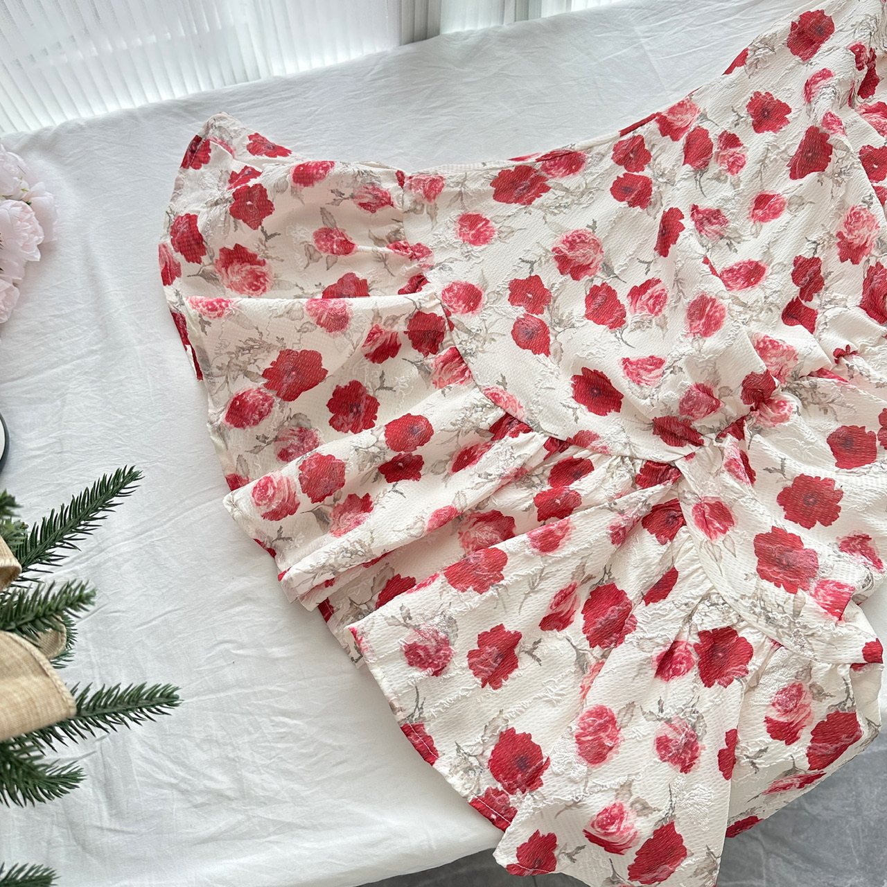 Peach Rose Island Vacation White-Enhancing Retro Red Floral Dress with Waist-Cinching Summer Pretty Flutter-Sleeve Dress Hanfu