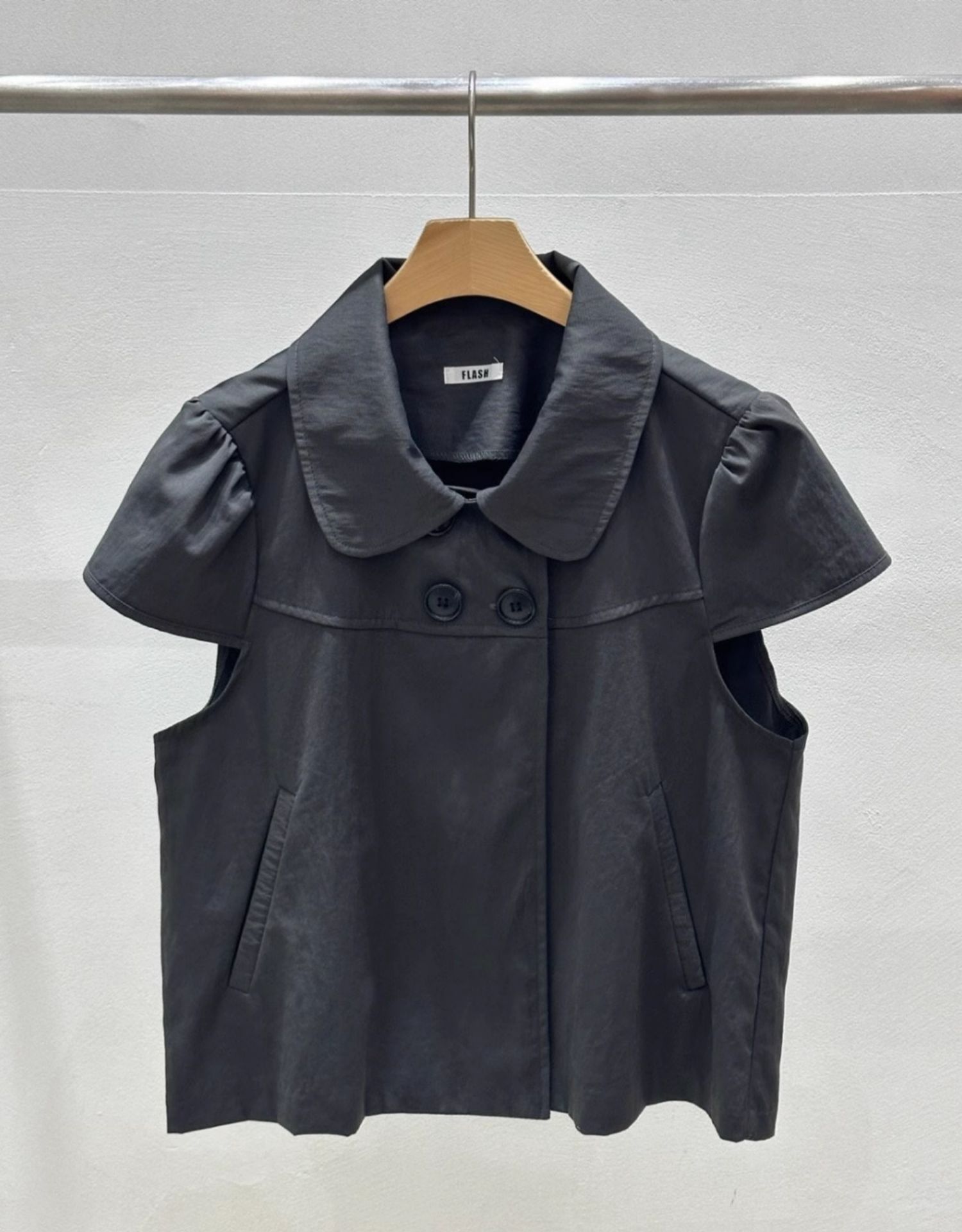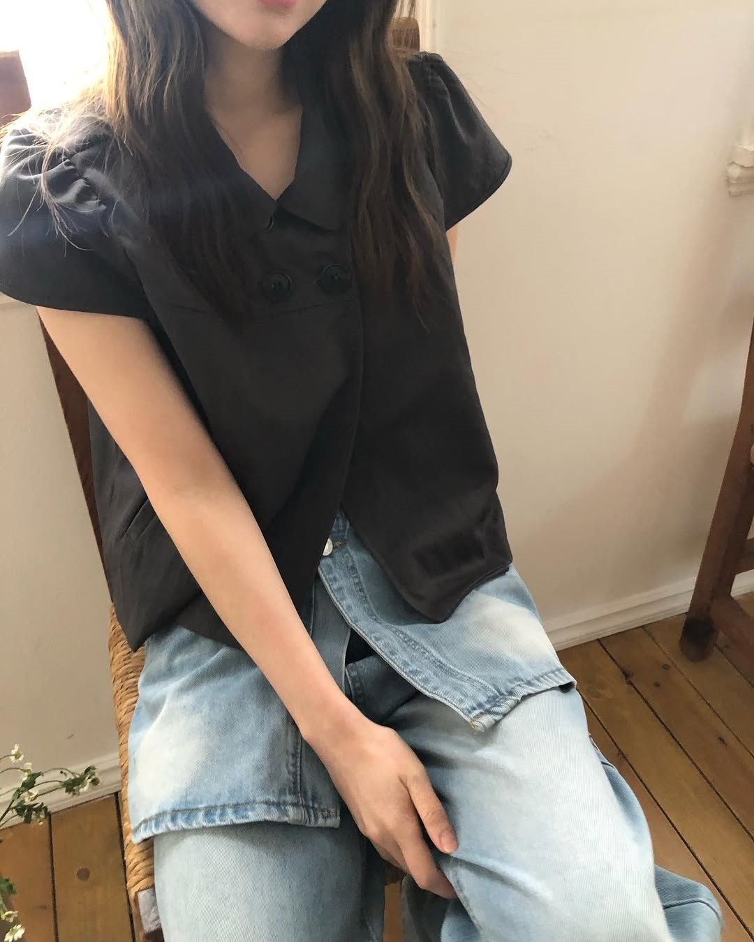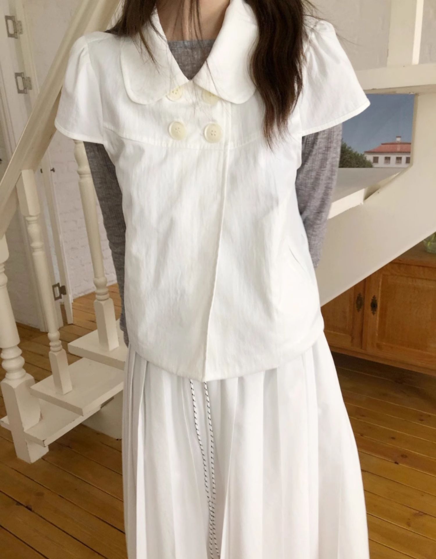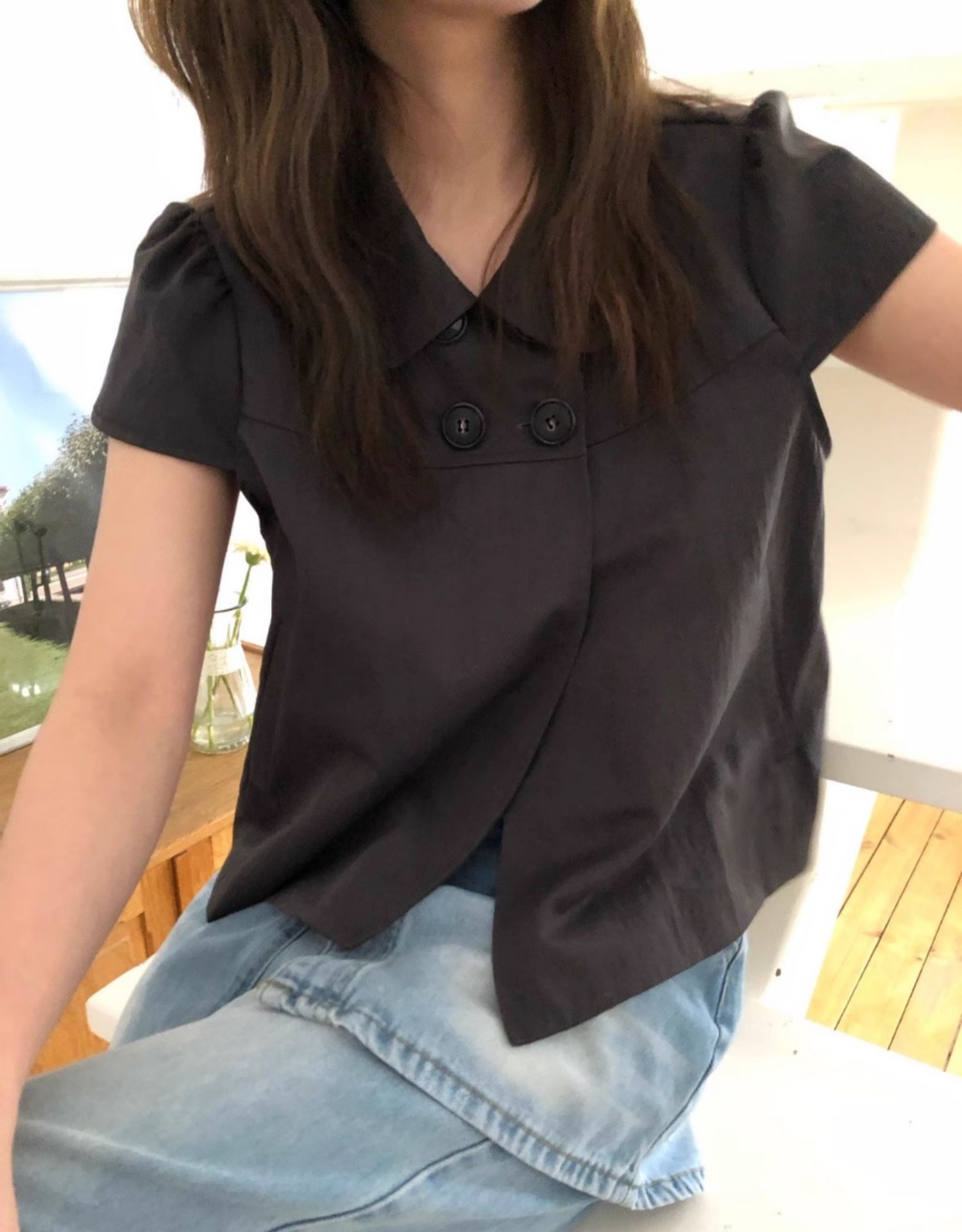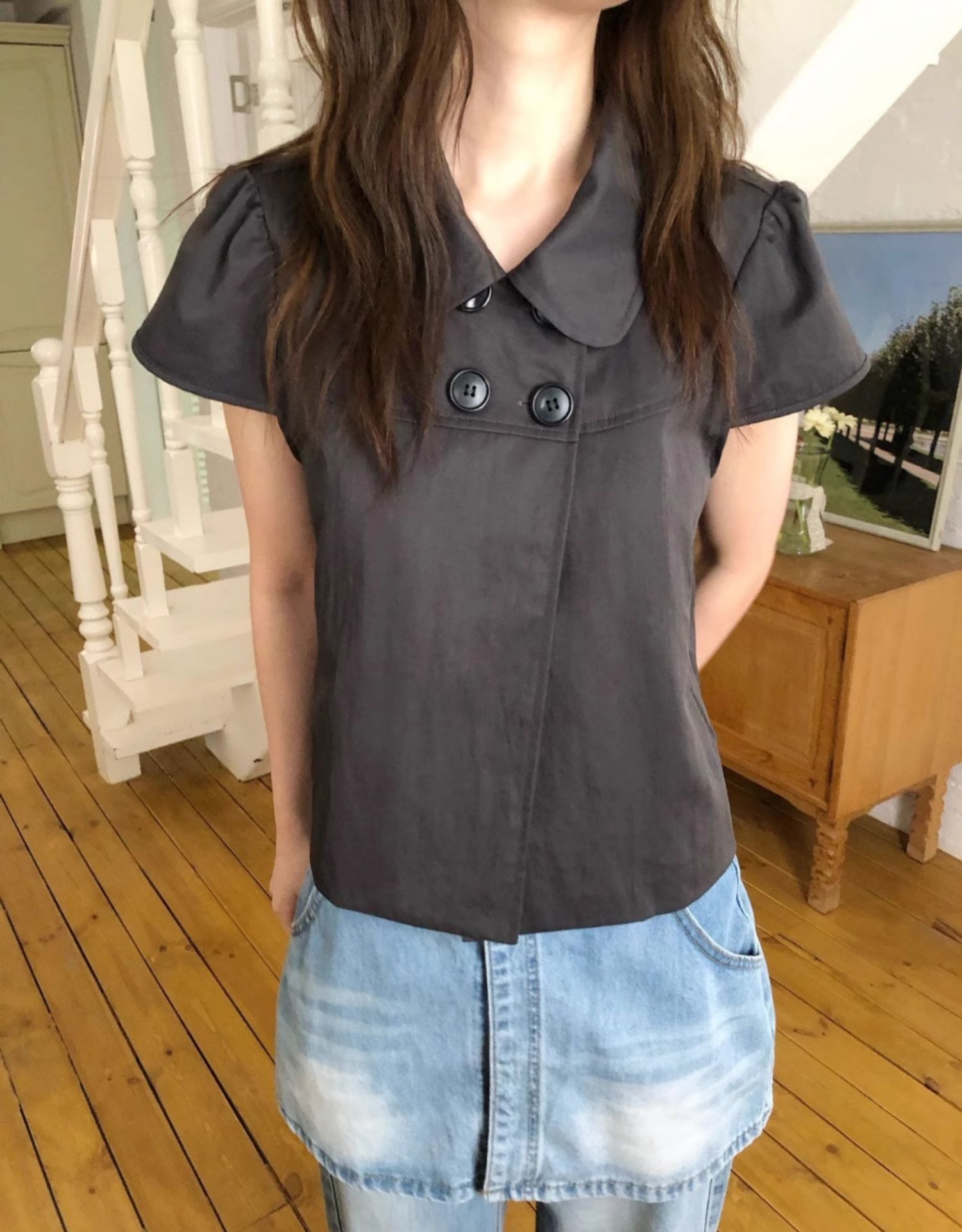 Up and on Korean Style Summer Gentle and Cute Versatile Doll Collar Big Button Puff Short-Sleeve Shirt Top