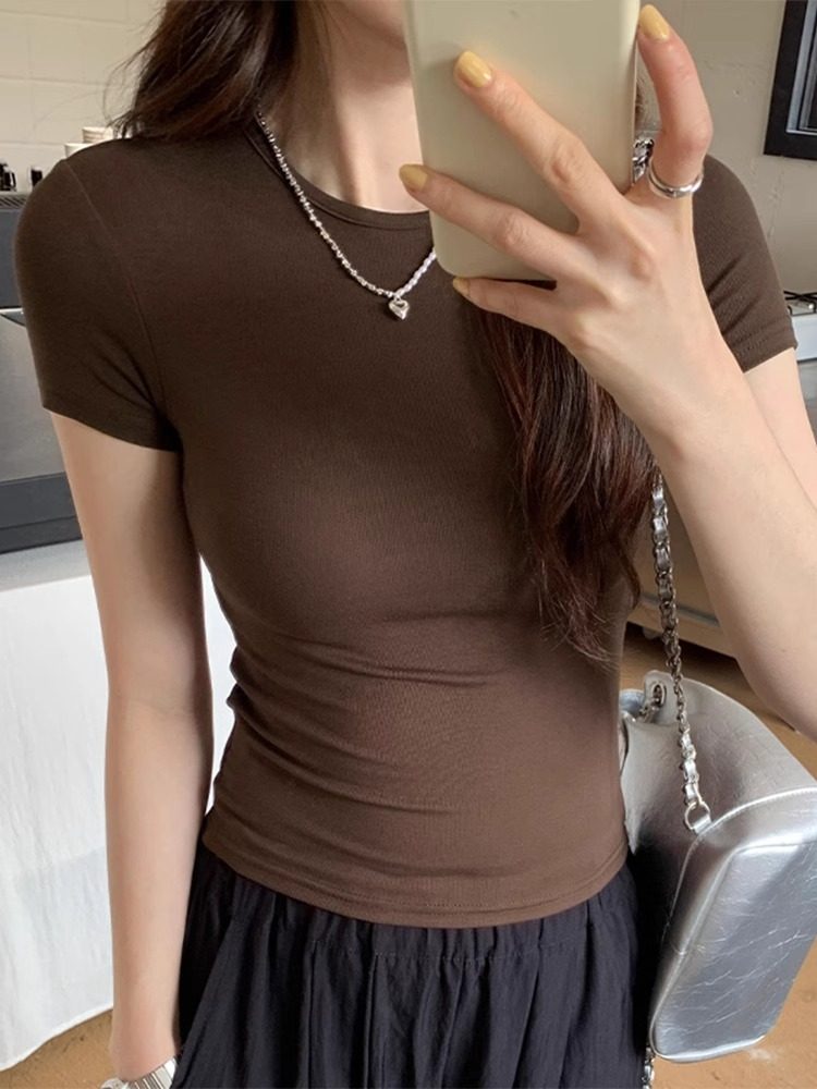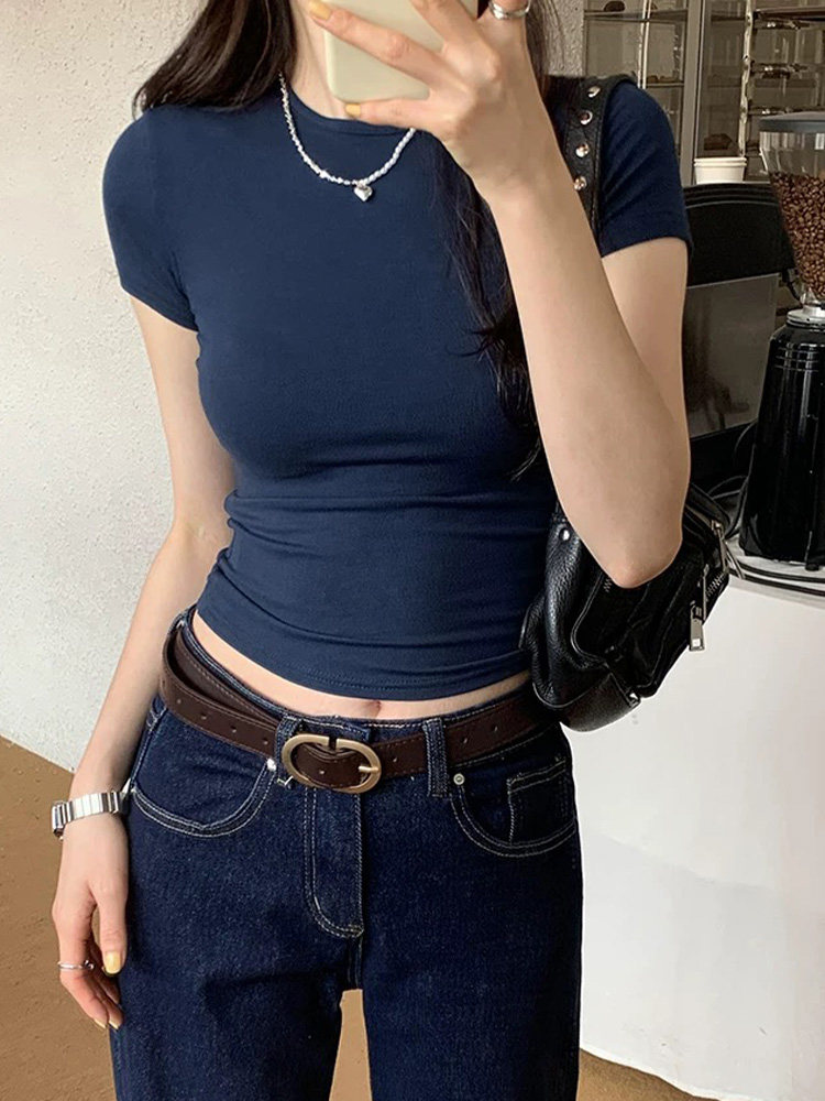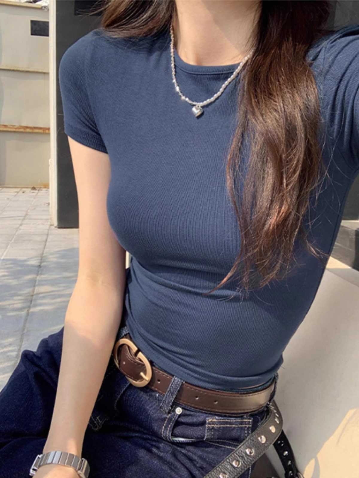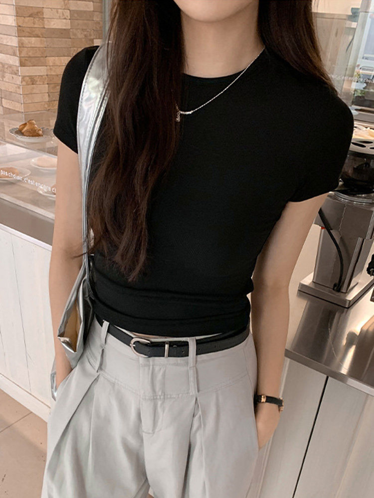 Mosesqueen Elastic Slim-Fit Short-Sleeve T-Shirt for Women, Summer Basic Style, Petite Solid Color Top