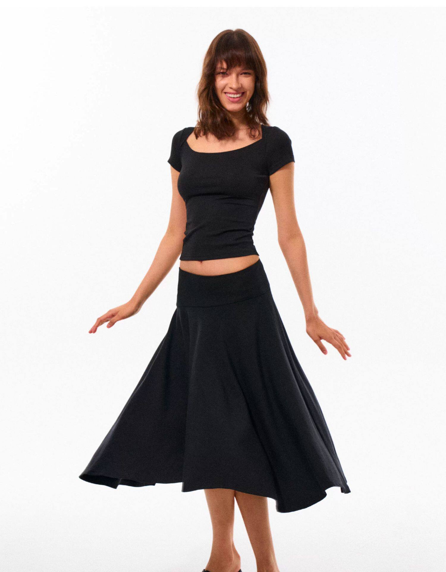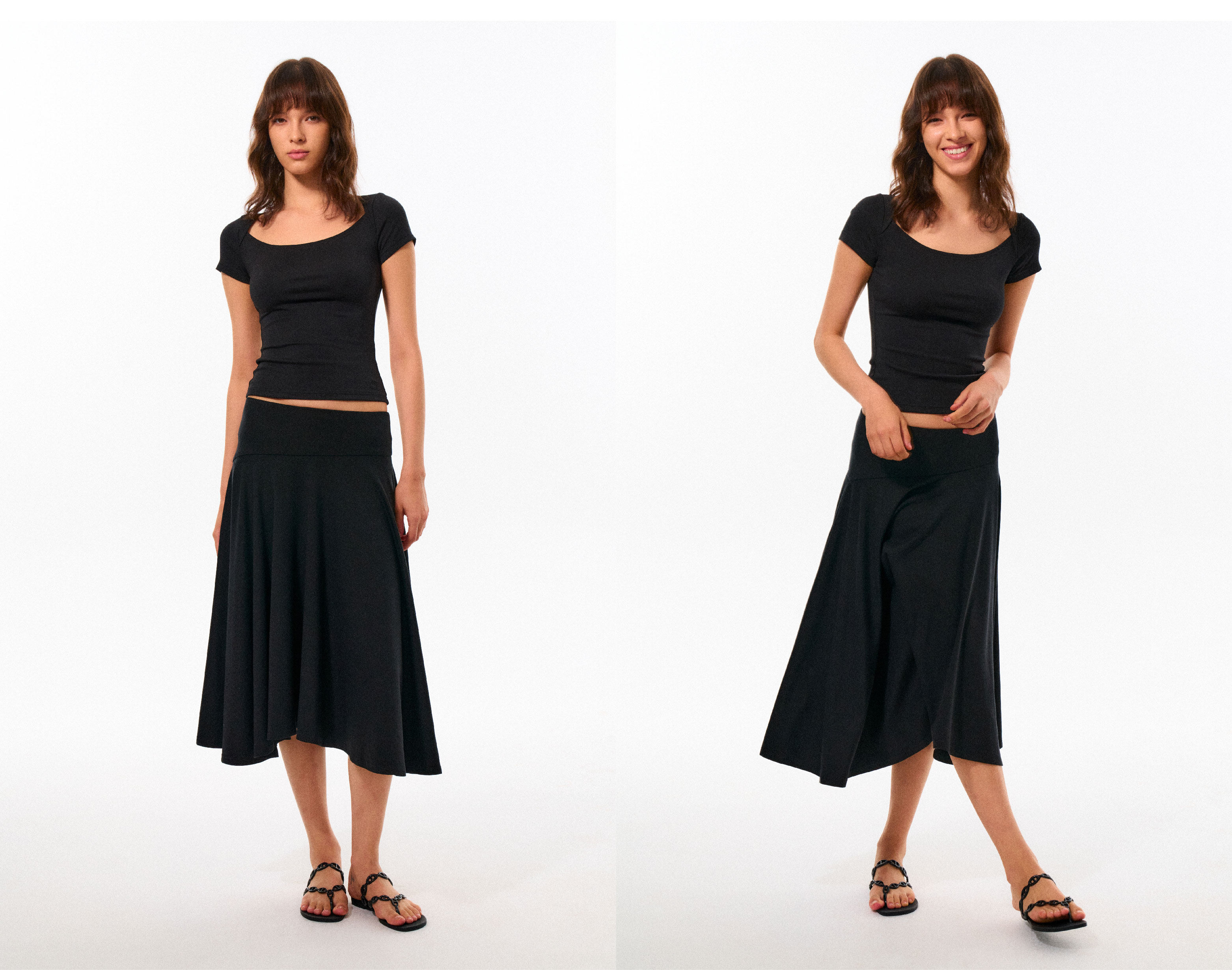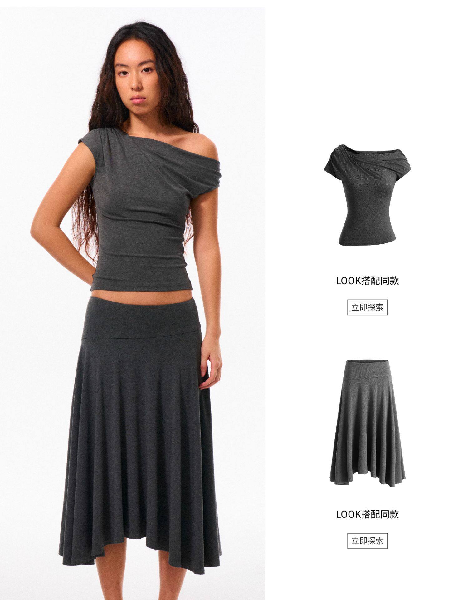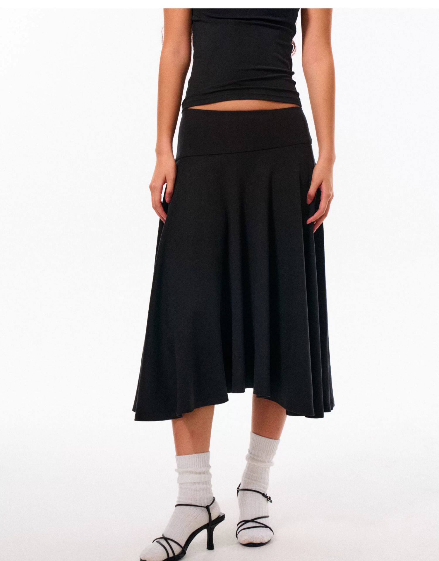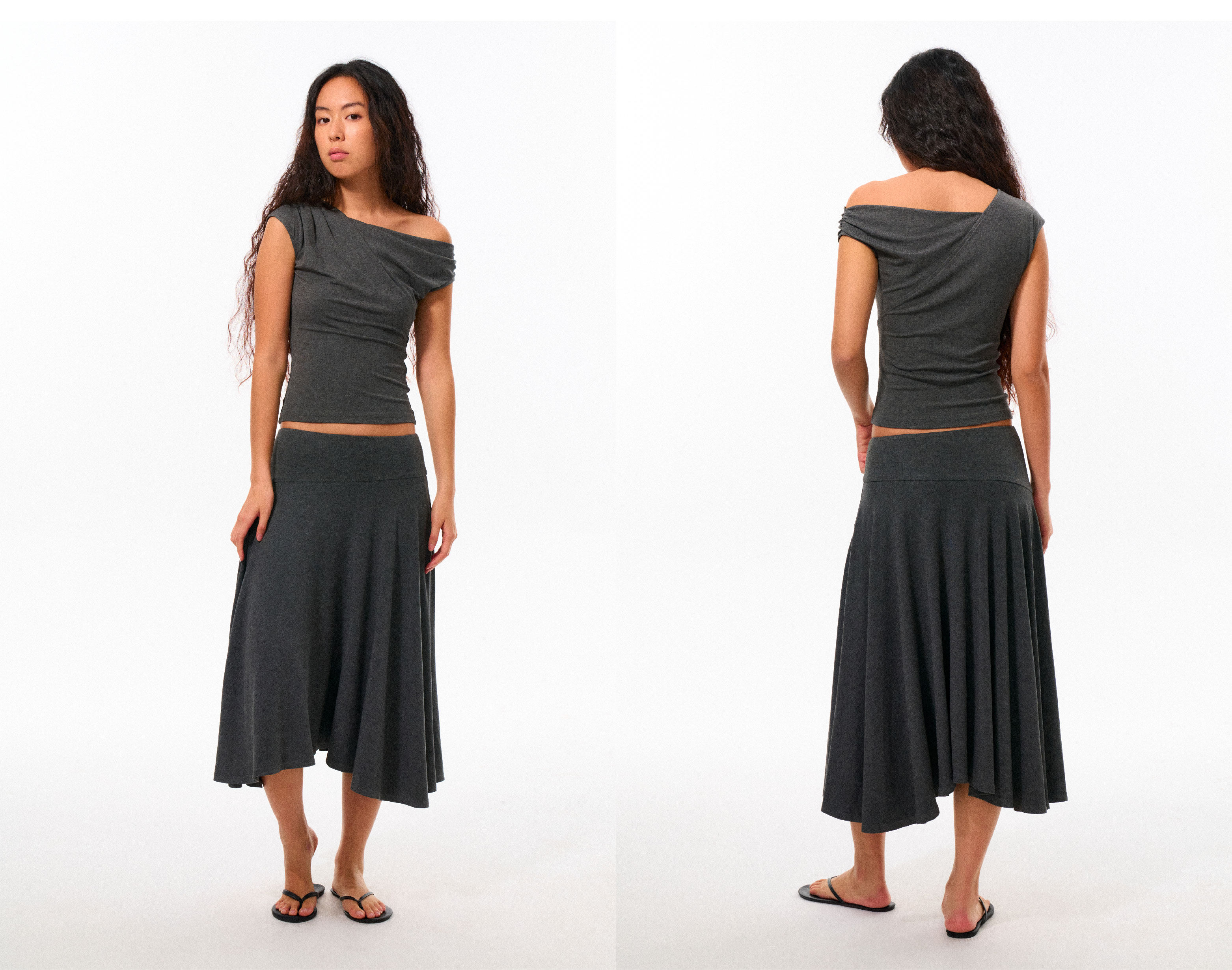 Firstfloor Stylish Elastic Pleated Asymmetrical Hem Knitted Long Skirt