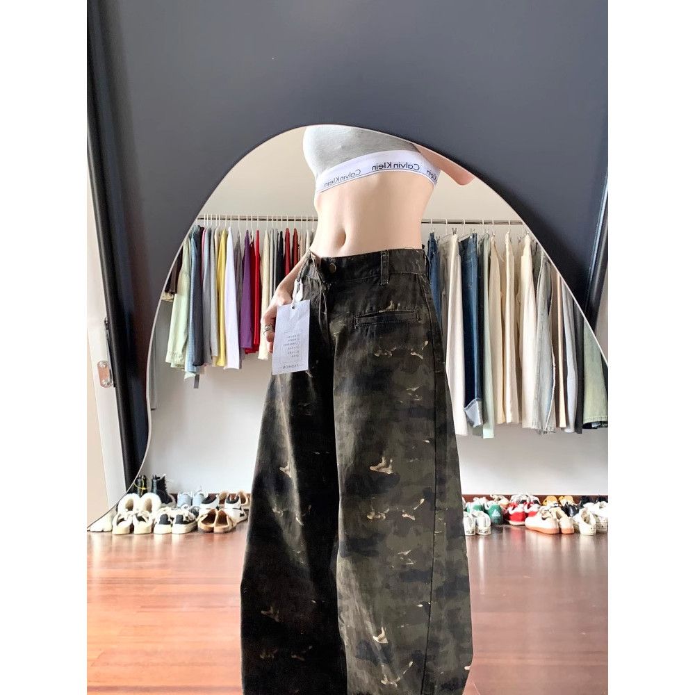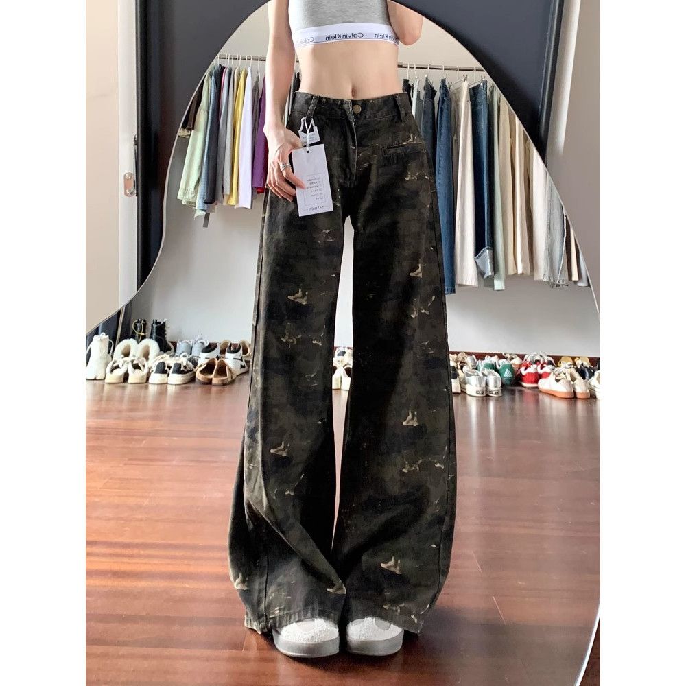 American Retro Camouflage Cargo Pants for Women, New Summer High-Waisted Slimming Loose Drape Straight-Leg Wide-Leg Jeans Trendy