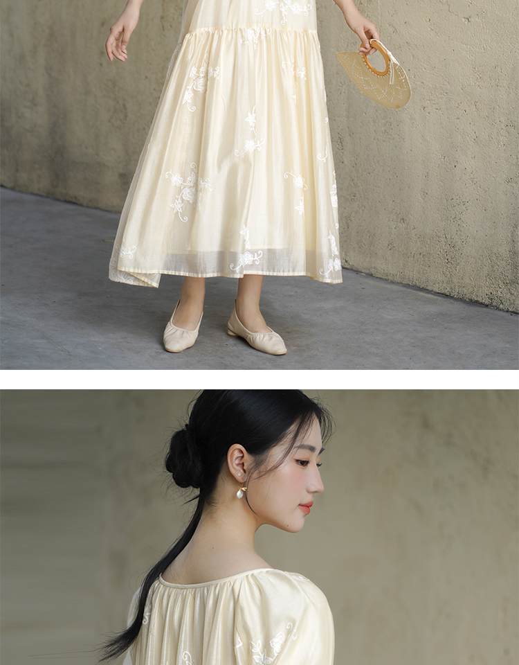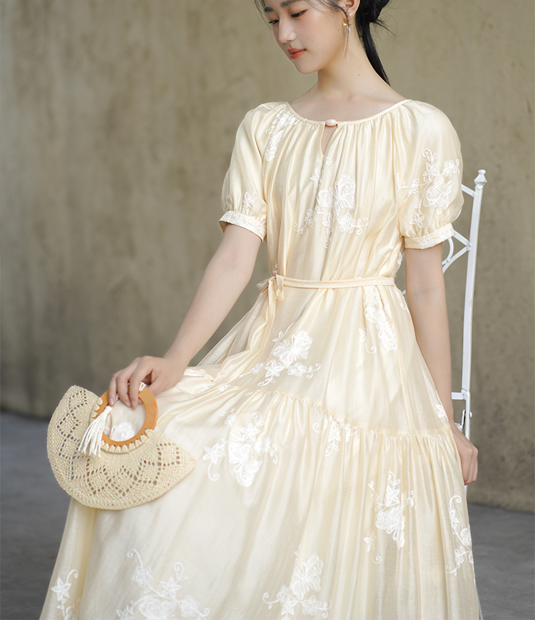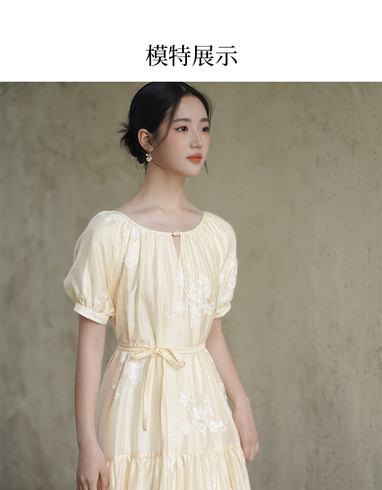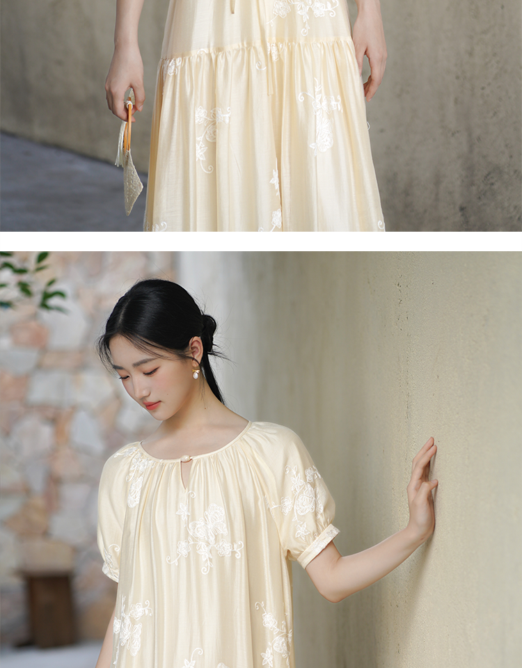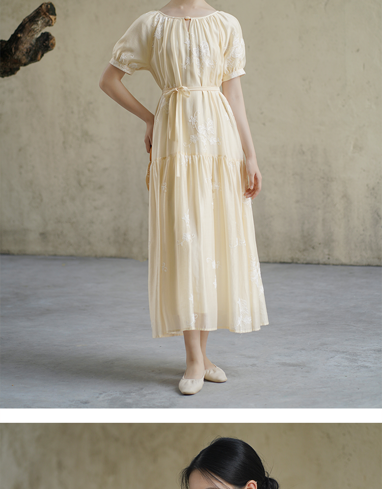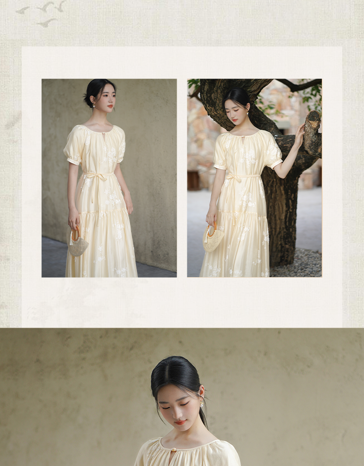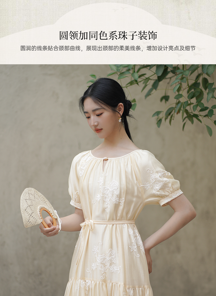 Chuqianyi New Chinese Style Dress for Women 2025 Summer New National Style Round Neck Waist-Cinching Elegant Temperament Apricot Long Dress