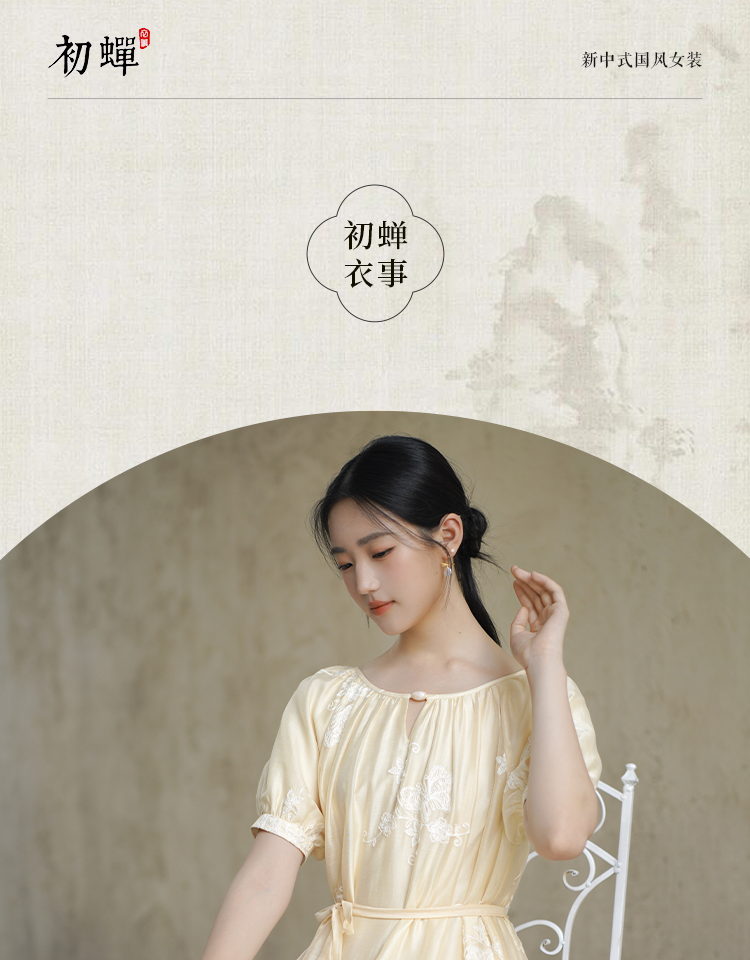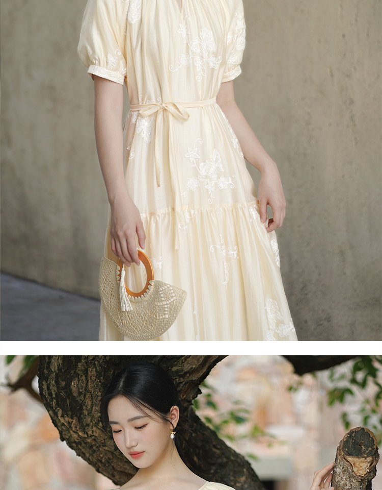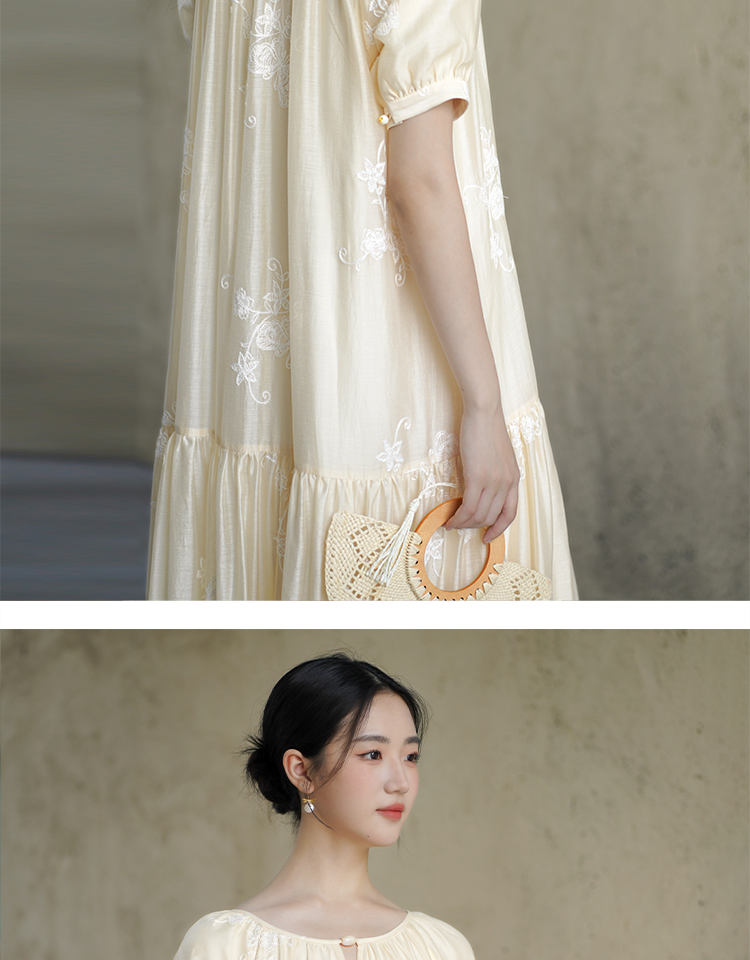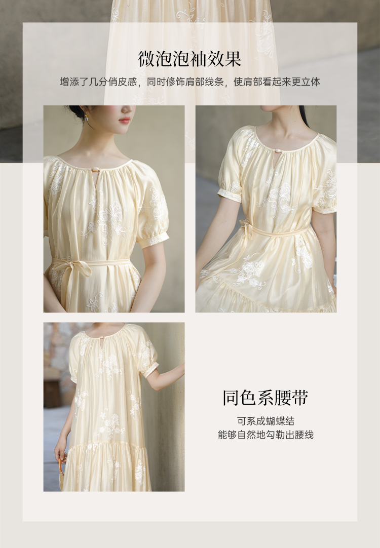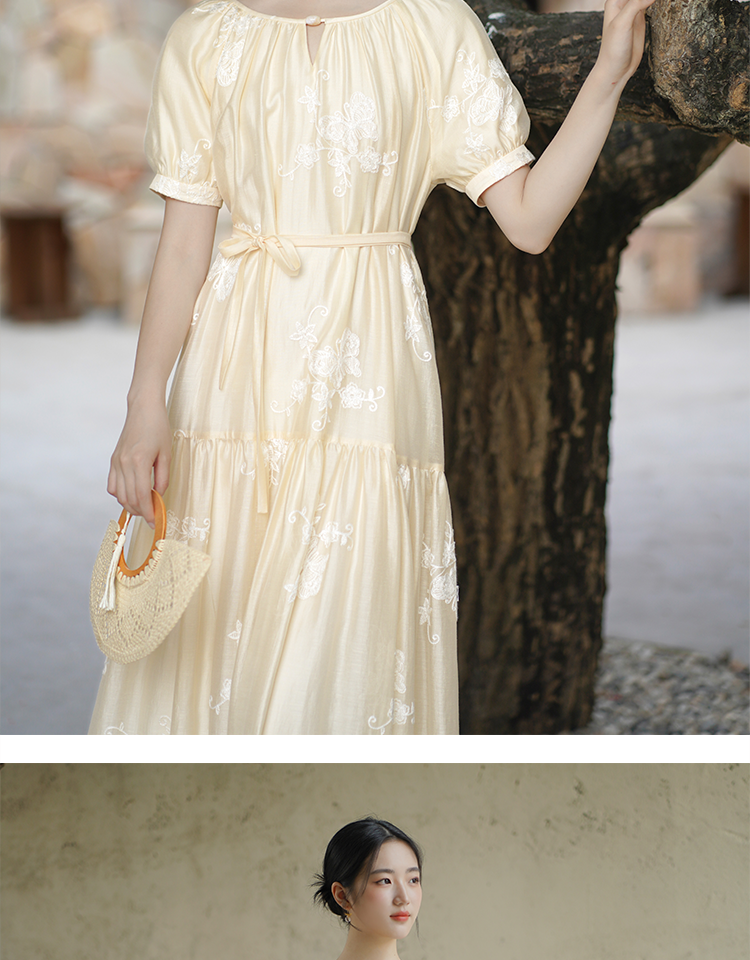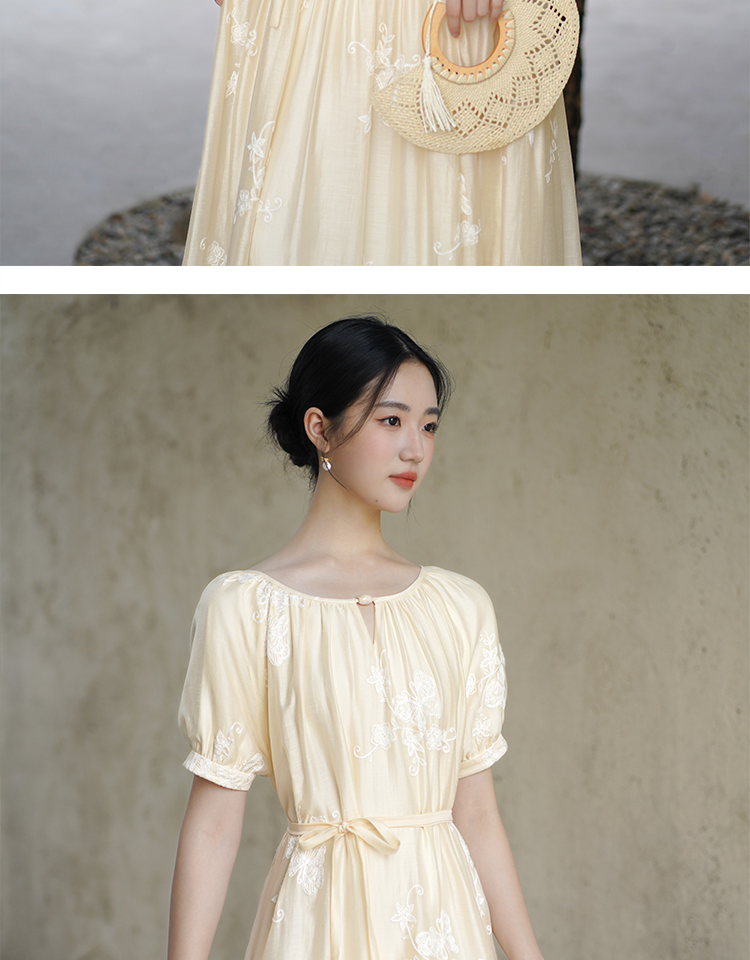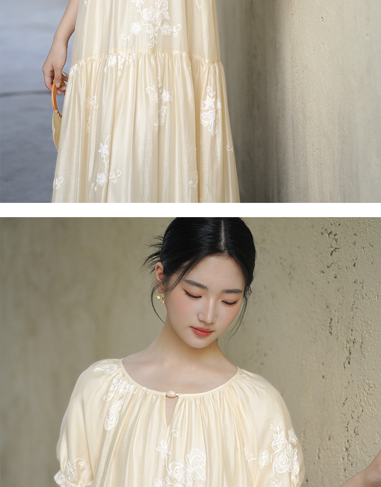Chuqianyi New Chinese Style Dress for Women 2025 Summer New National Style Round Neck Waist-Cinching Elegant Temperament Apricot Long Dress